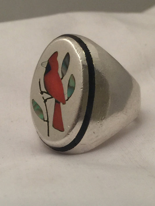 Vintage Sterling Silver Coral & Abalone Inlay Ring Southwestern Tribal Size 12 Weight 26.4g