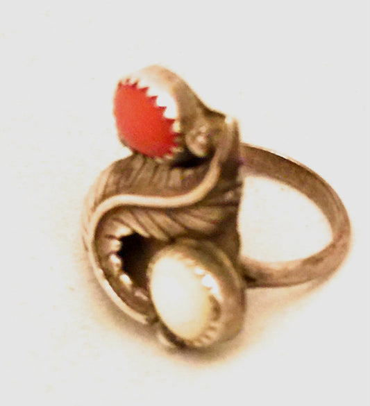 Vintage Sterling Silver Southwest Tribal Ring Coral & Mother of Pearl Feather Size 5.5 Weight 5.4g