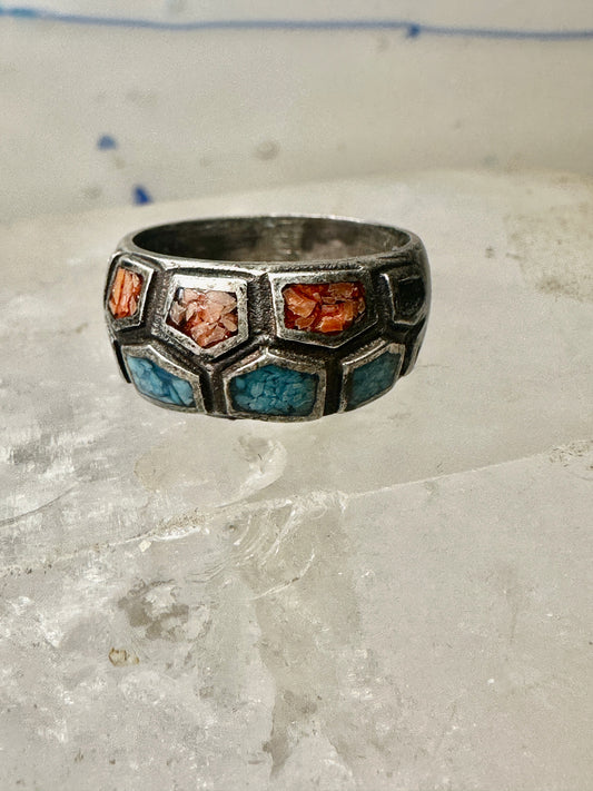 Zuni ring turquoise coral chips band size 7.25 sterling silver women men