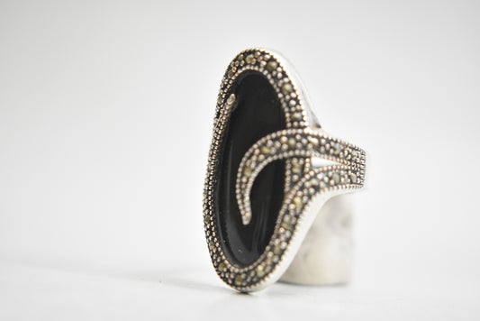 onyx ring Art Deco marcasite boho women sterling silver Size 6.75