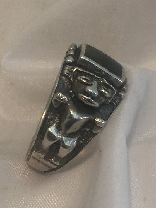 Vintage Sterling Silver Ring Onyx Size 7 5.2g Mayan Aztec Figurative
