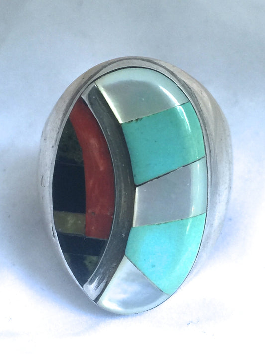 Vintage Sterling Silver Ring Southwestern Tribal Turquoise & Onyx & MOP & Other Stones Size 10.75 23.7g