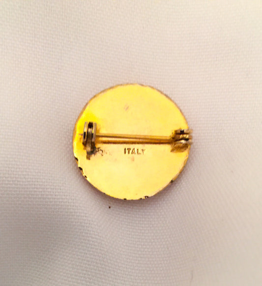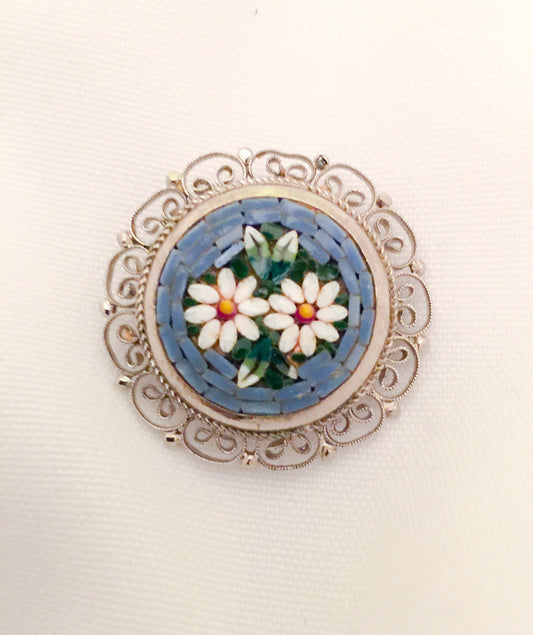 Vintage Venetian Circular Micro-Mosaic Pin with Flowers in a Light Blue Background