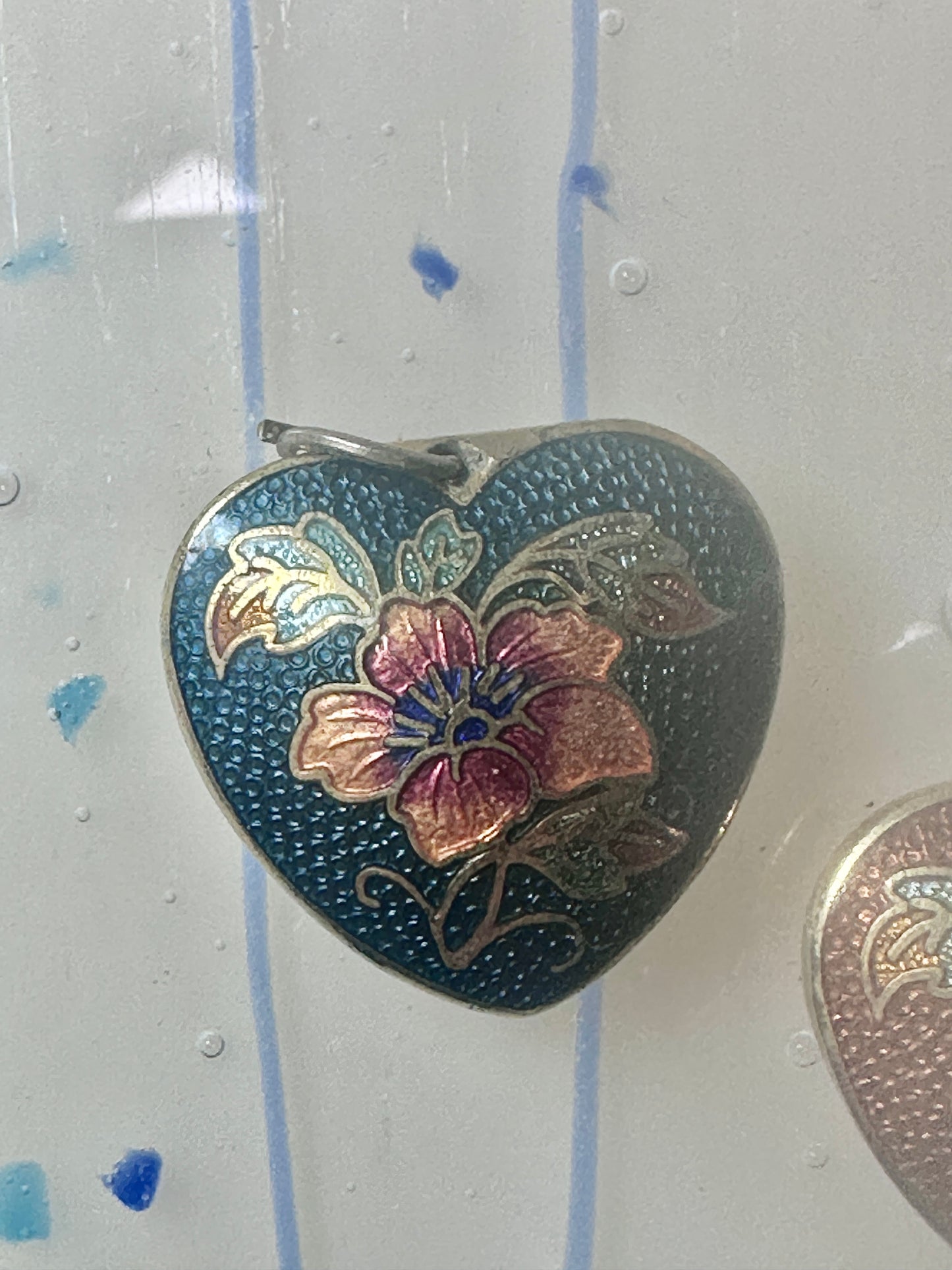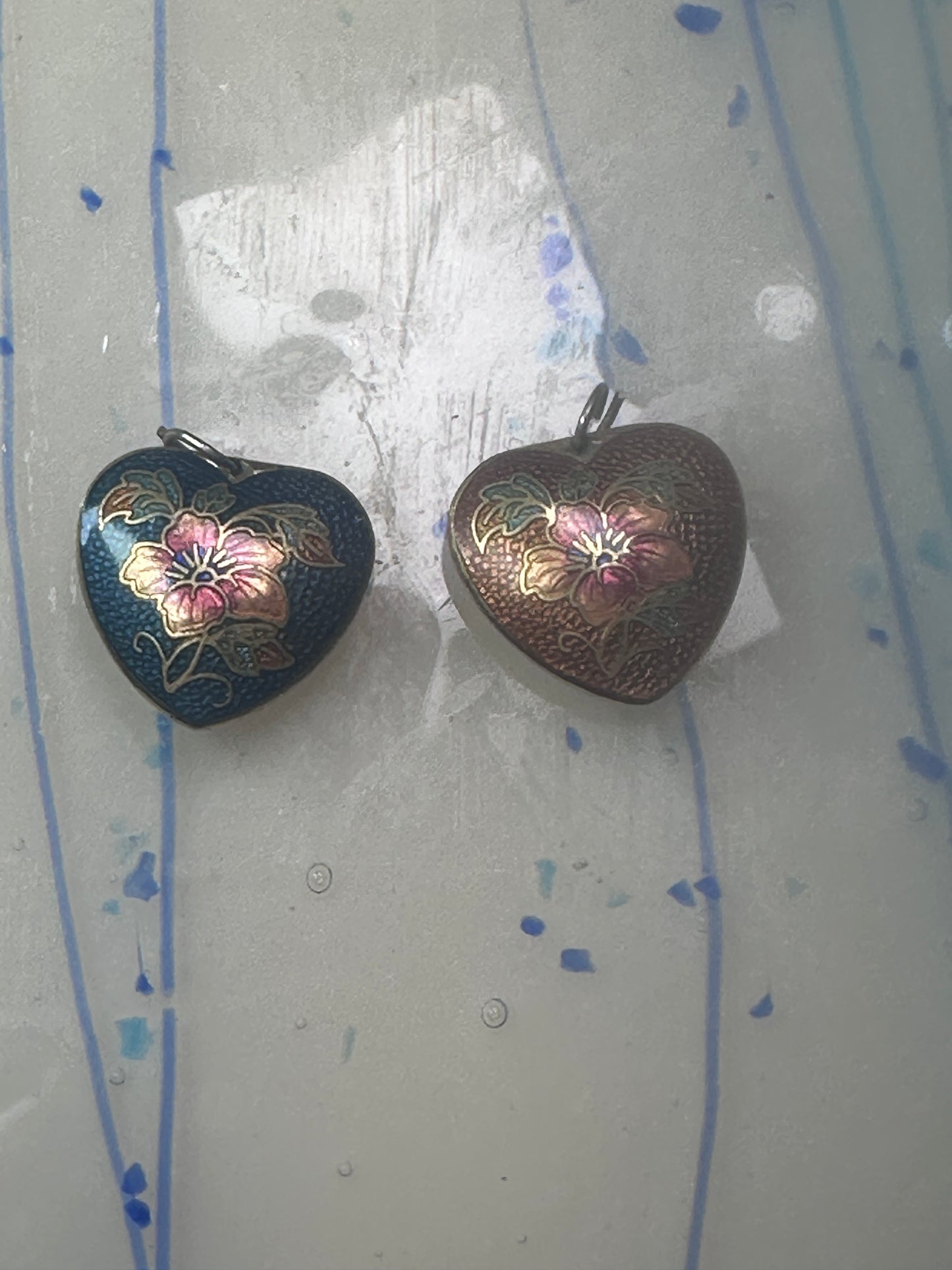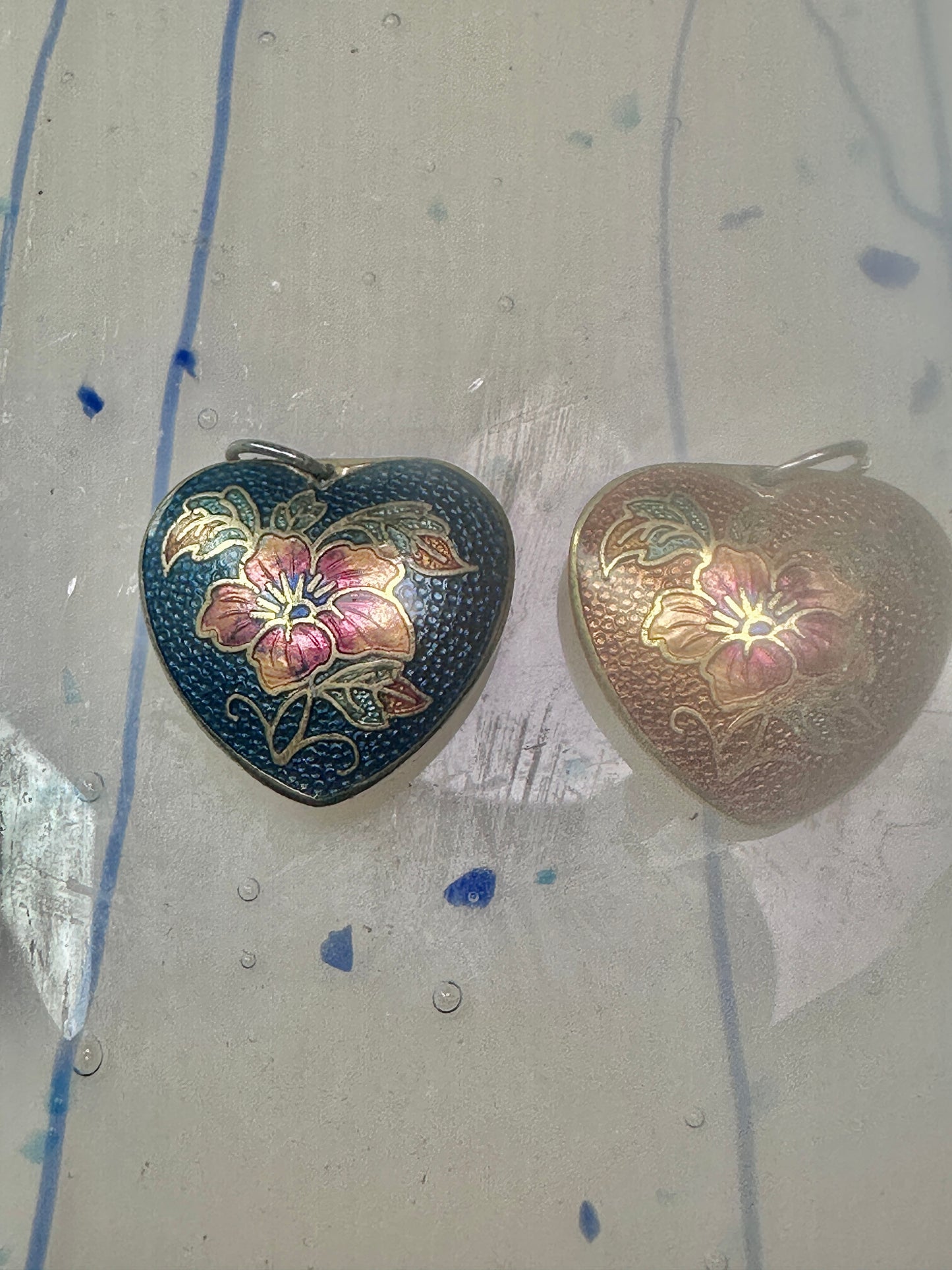 2 Heart Shaped Cloisonne two different heart pendants Double Sided with floral flower designs