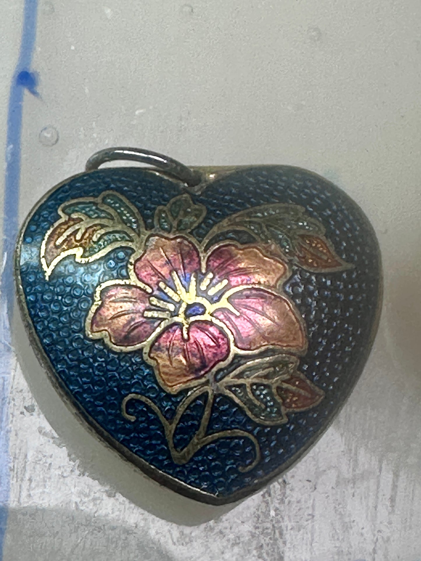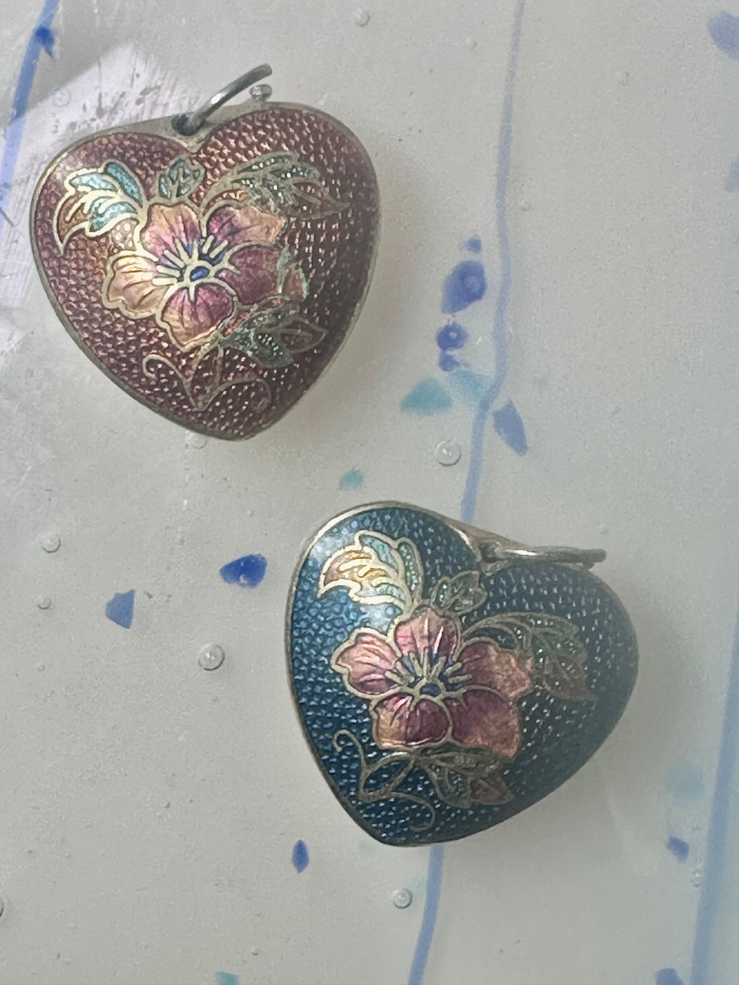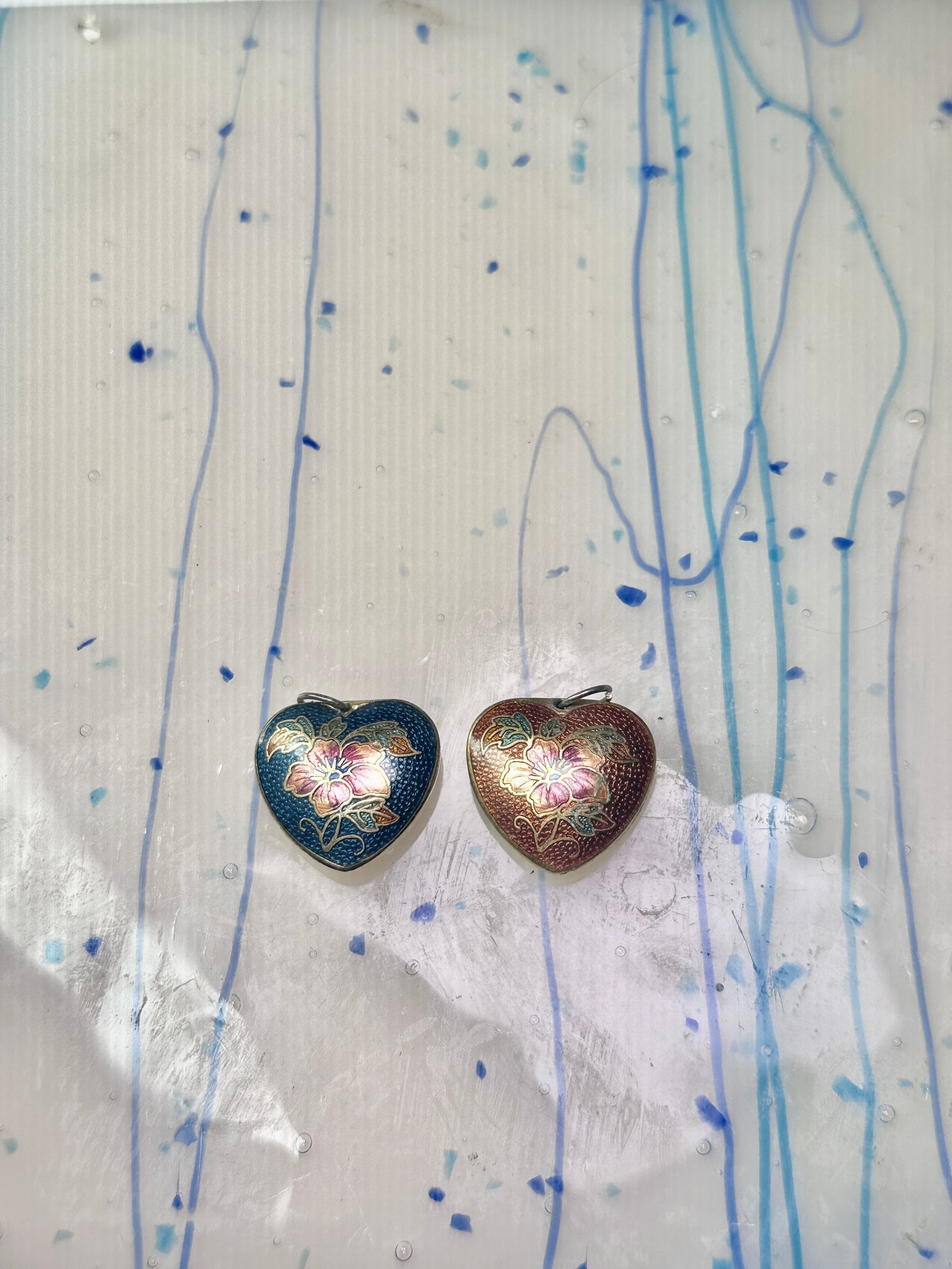 2 Heart Shaped Cloisonne pendants Double Sided with floral flower designs