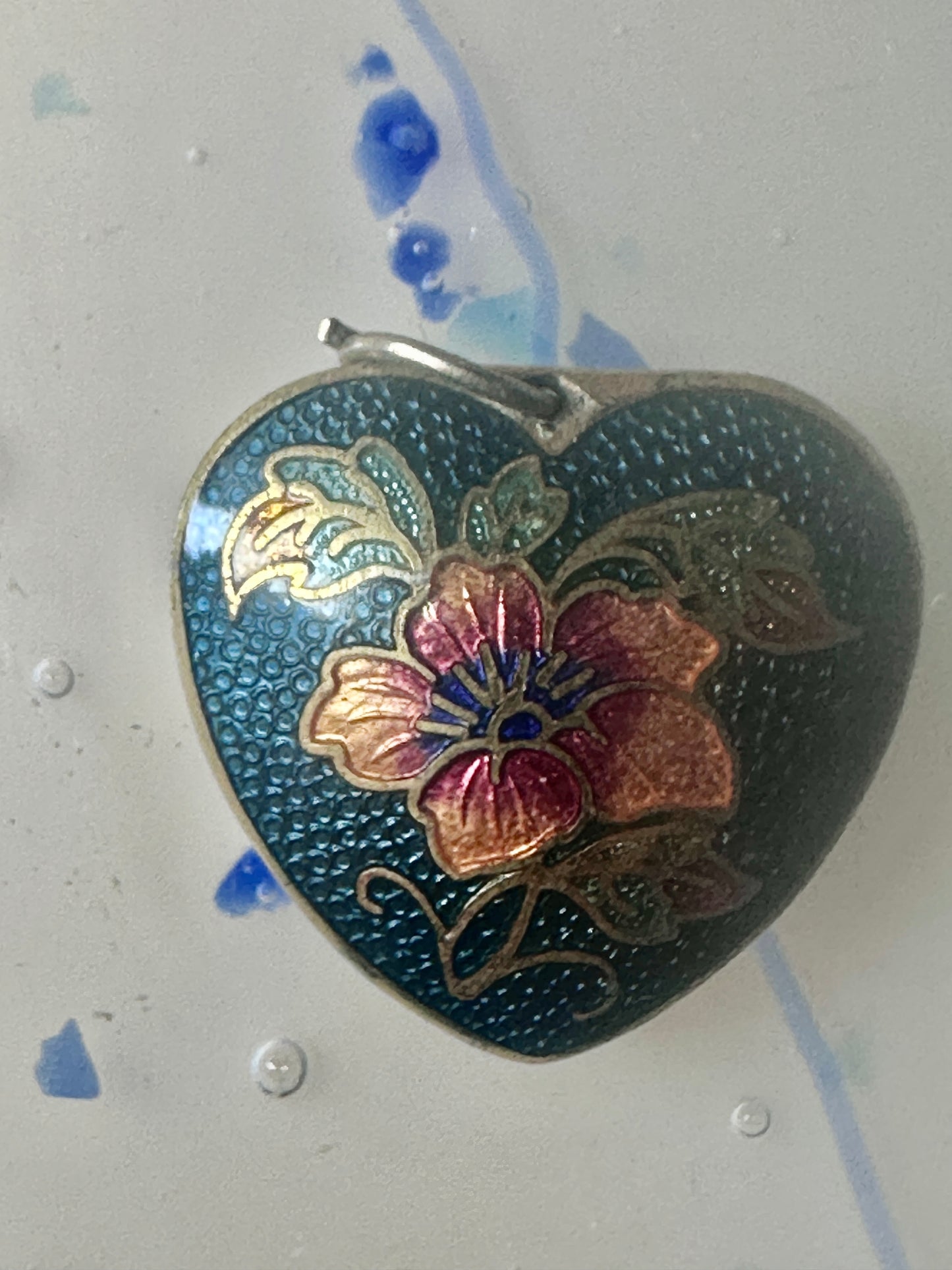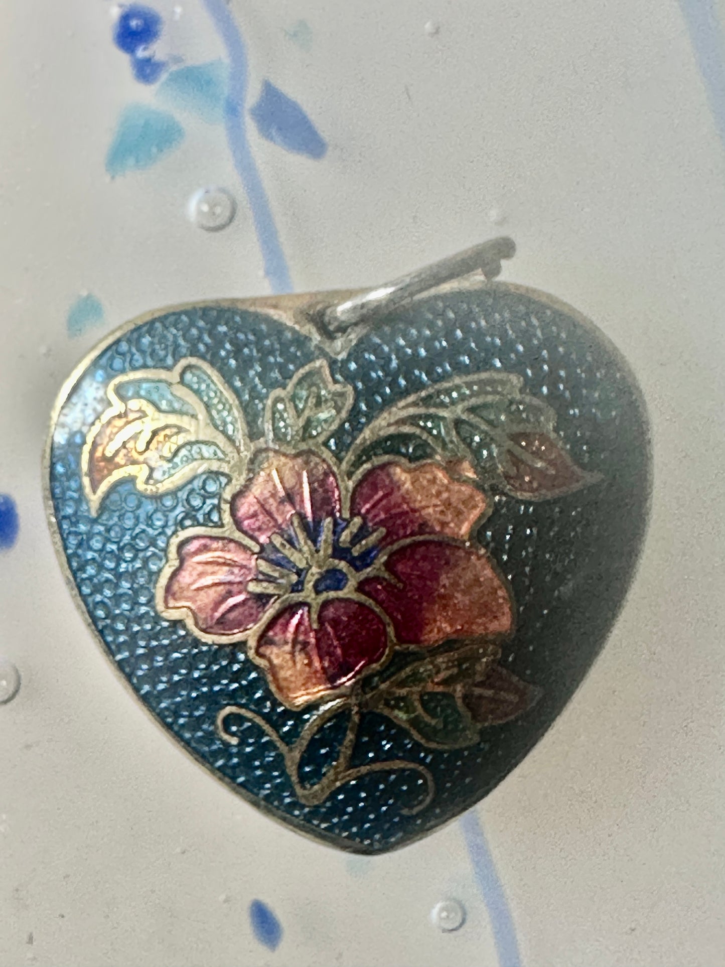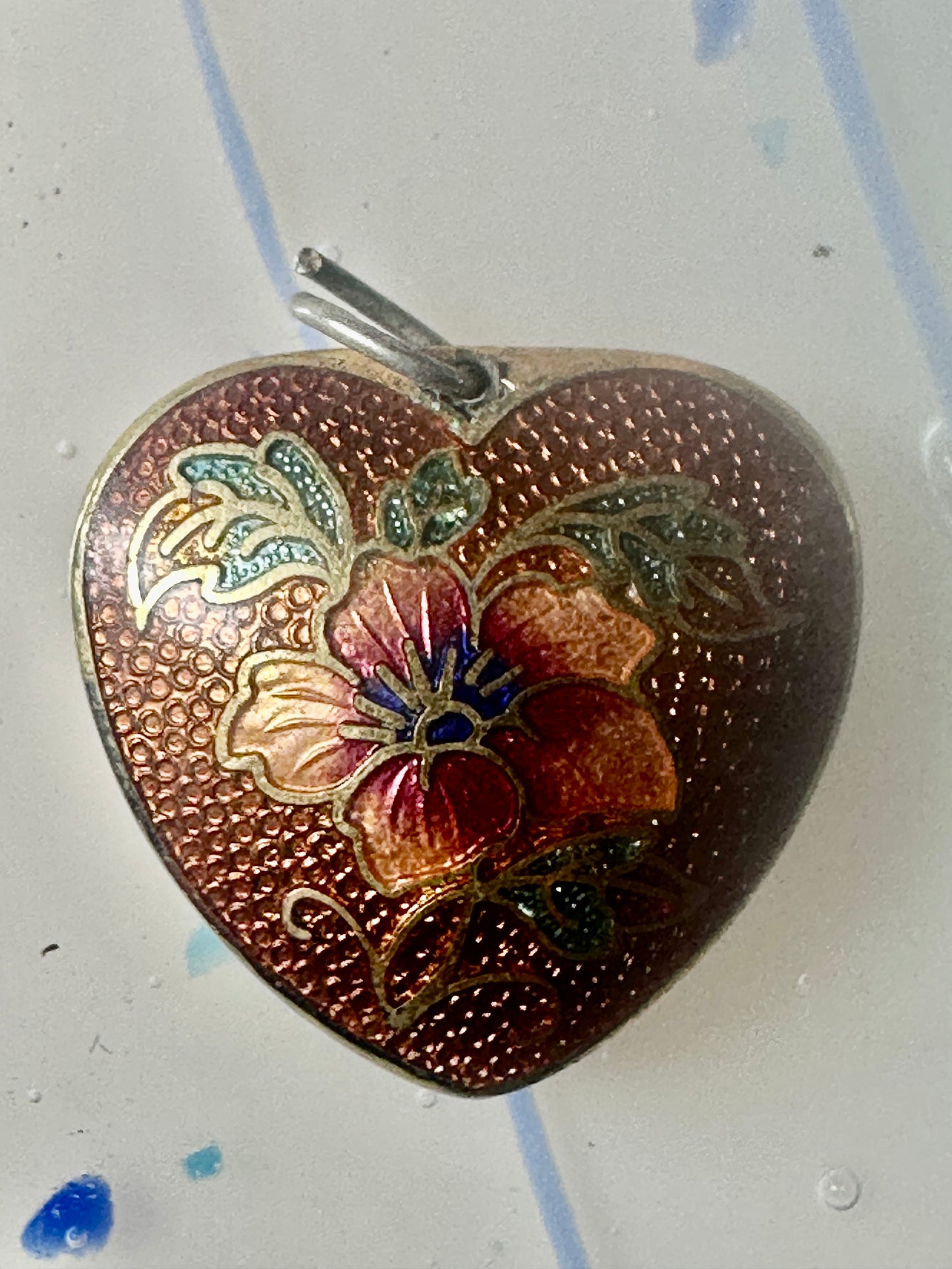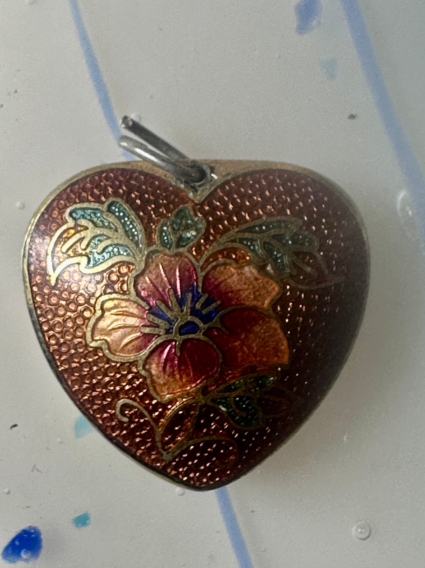 2 Heart Shaped Cloisonne pendants Double Sided with floral flower designs
