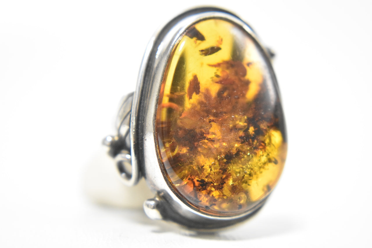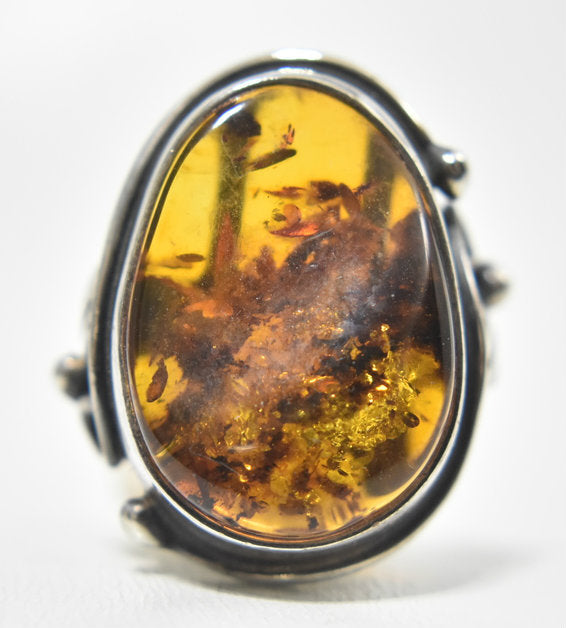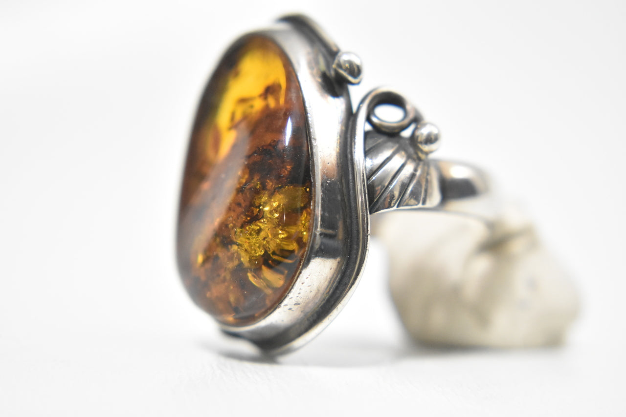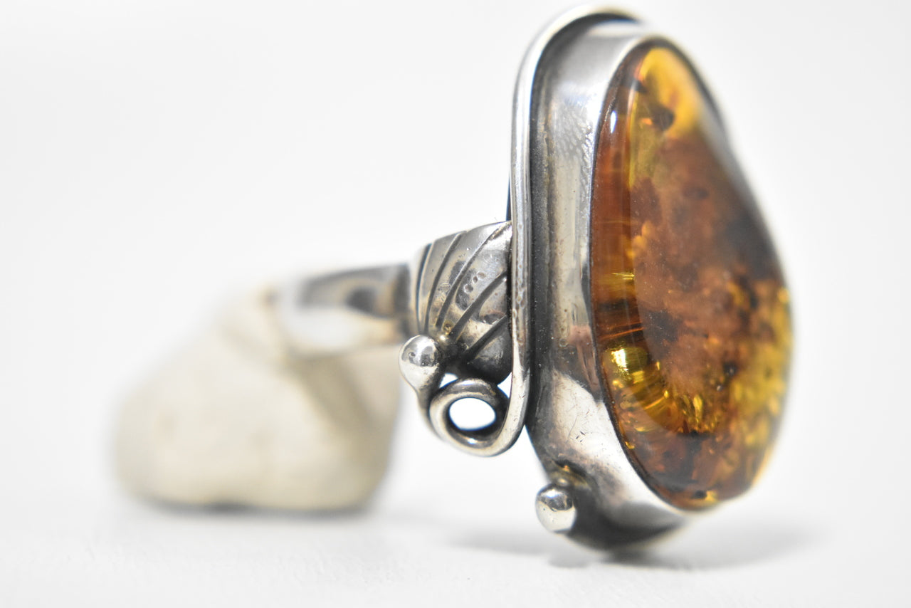 Amber Ring Vintage Sterling Silver Art Deco Size 7.75