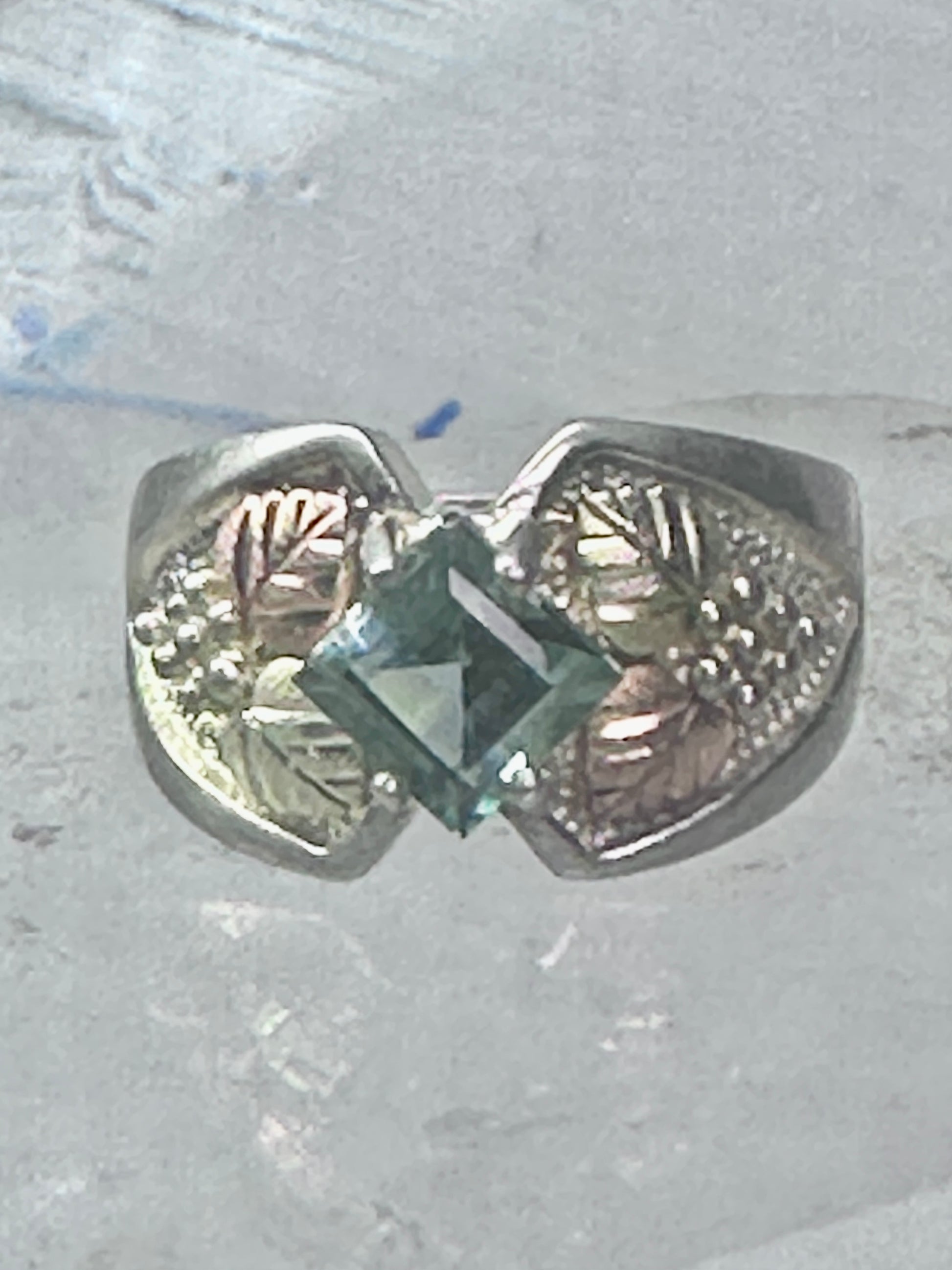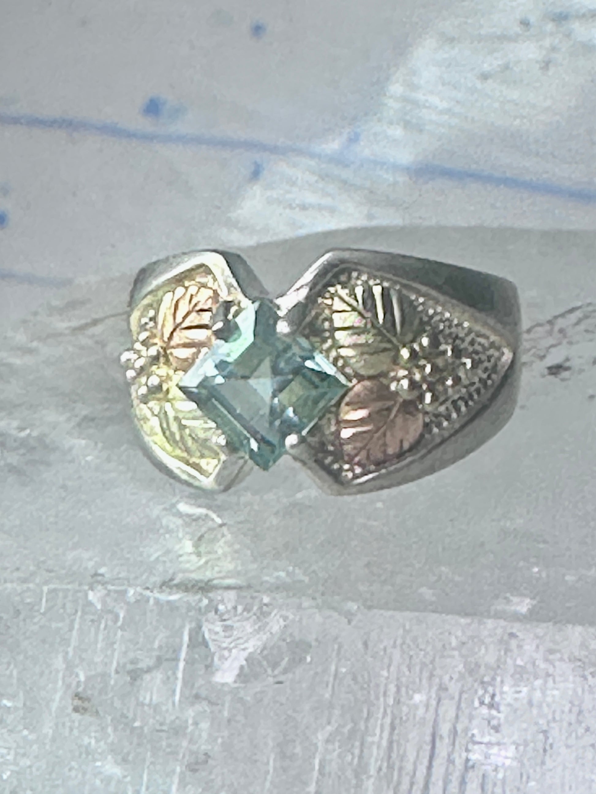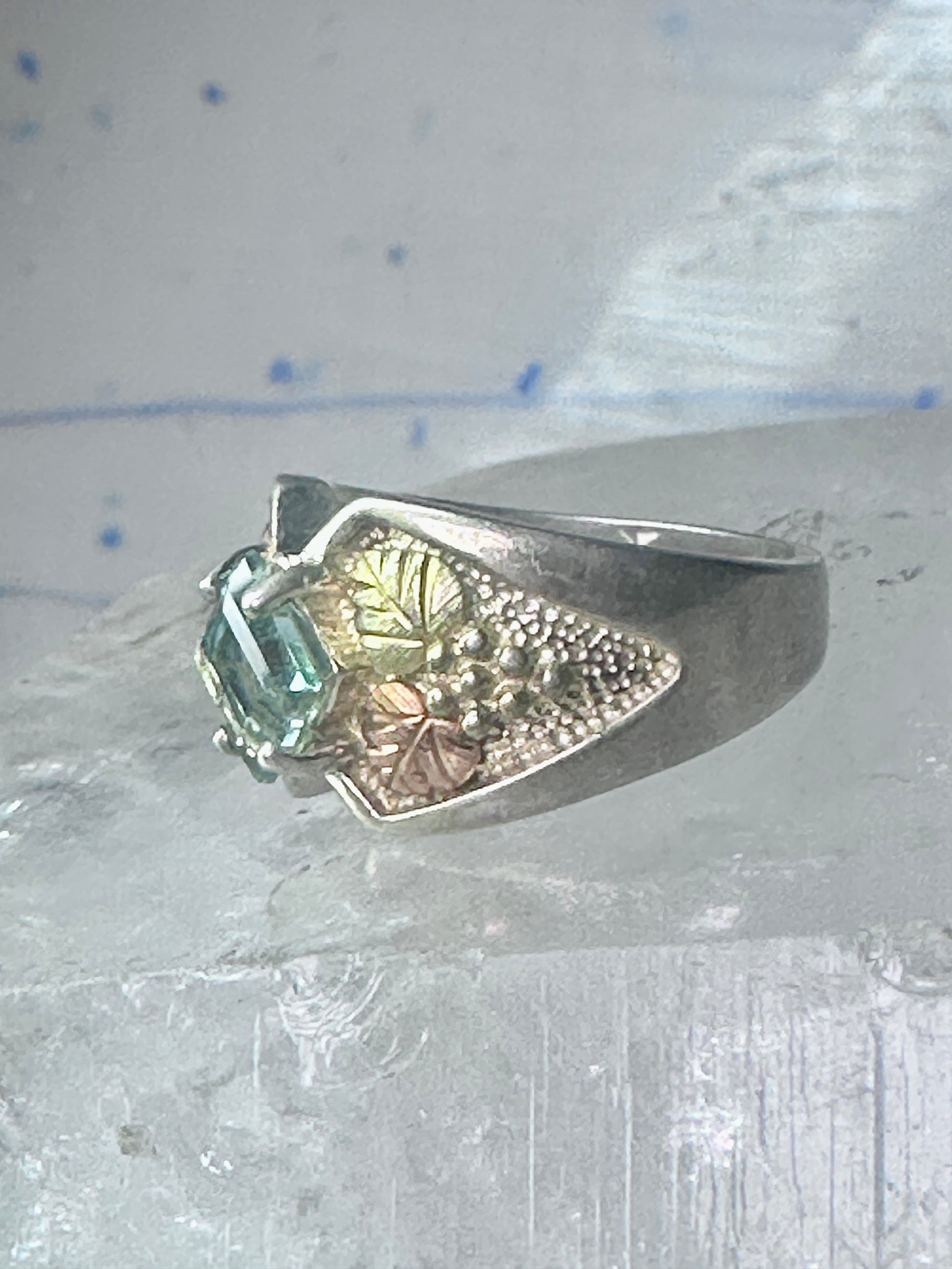 Black Hills Gold Ring aquamarine blue color stone leaves band size 5.75 sterling silver women pinky