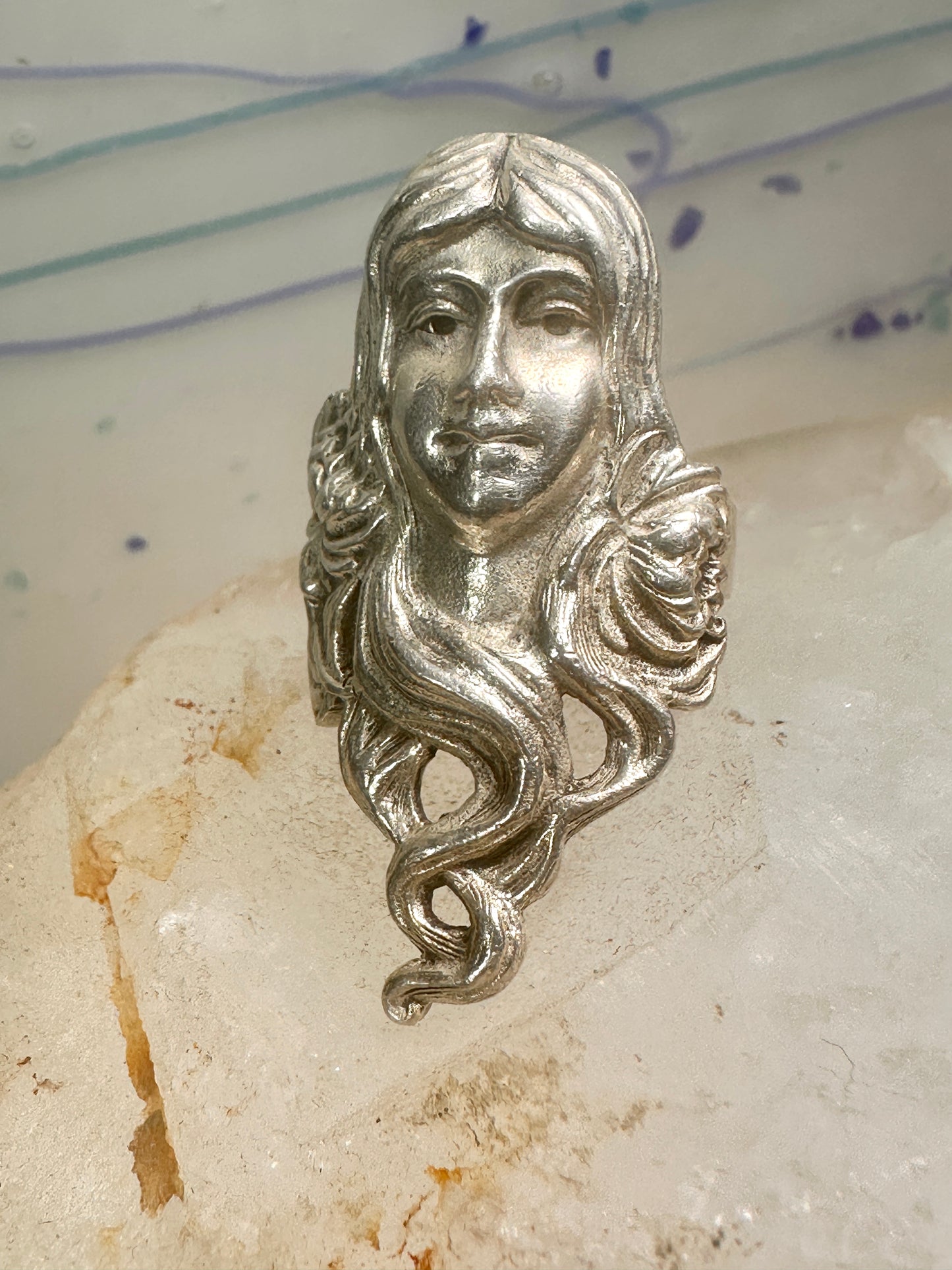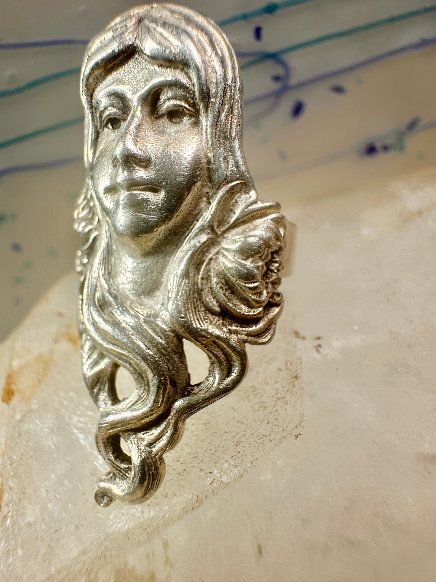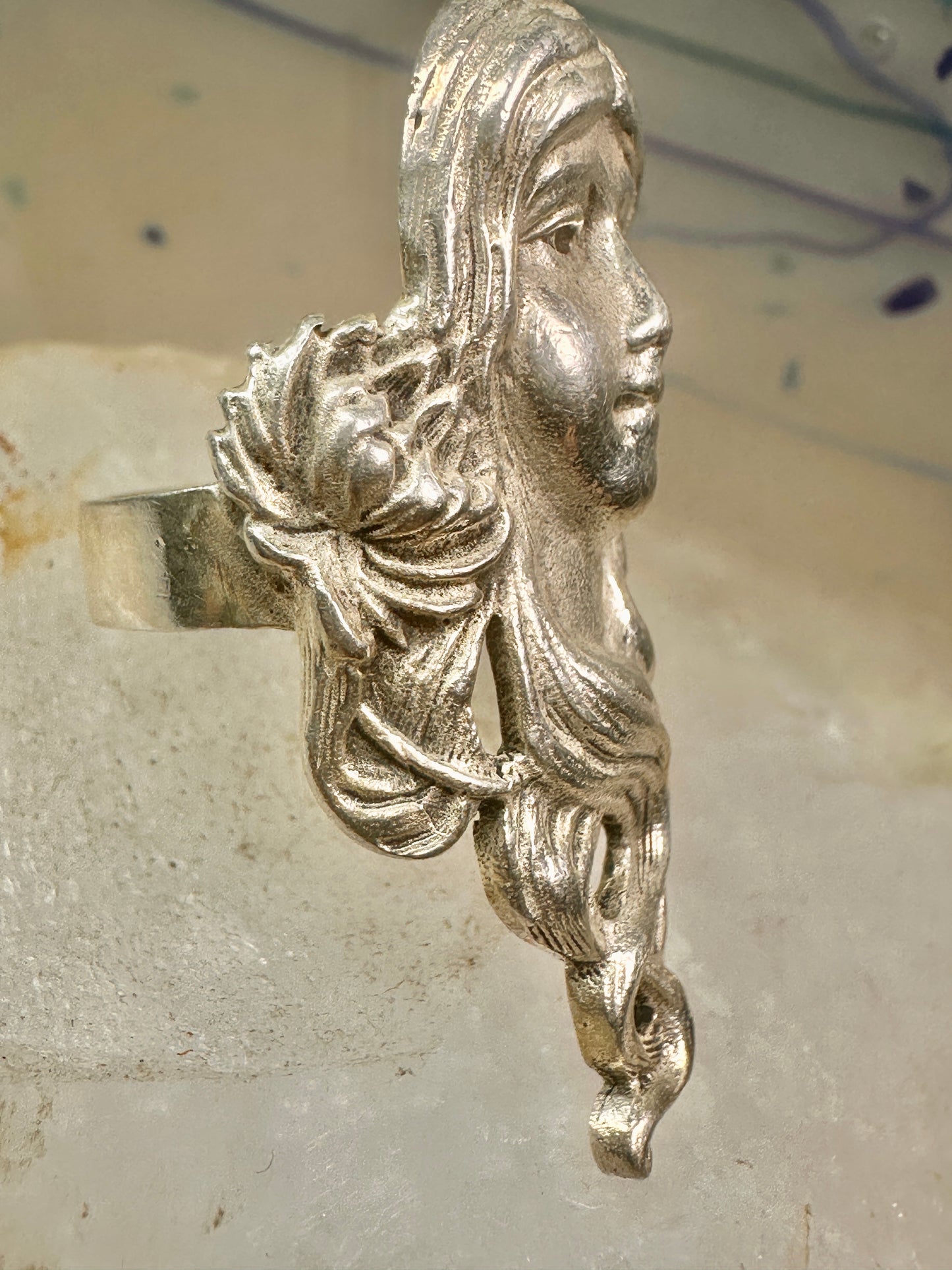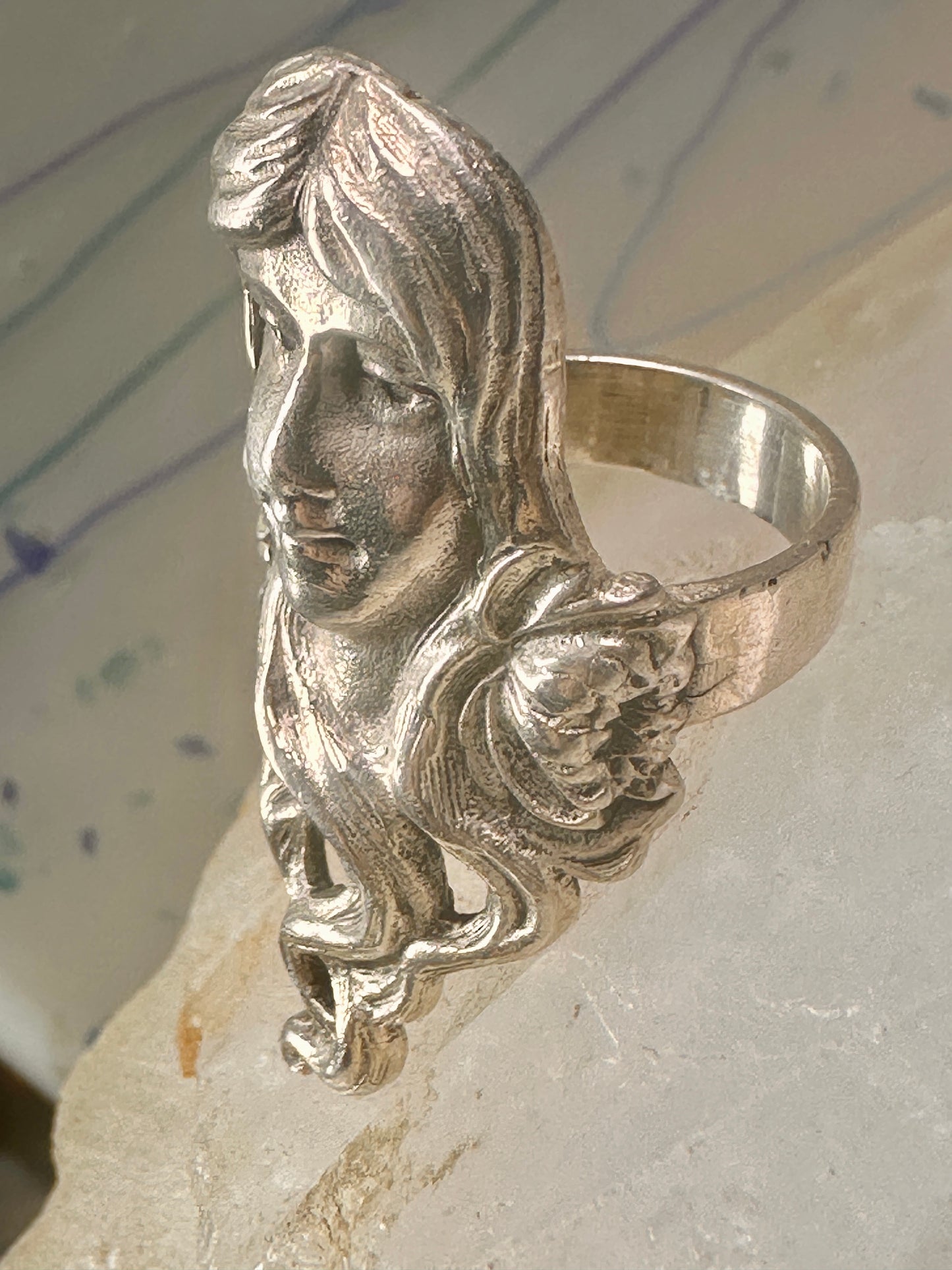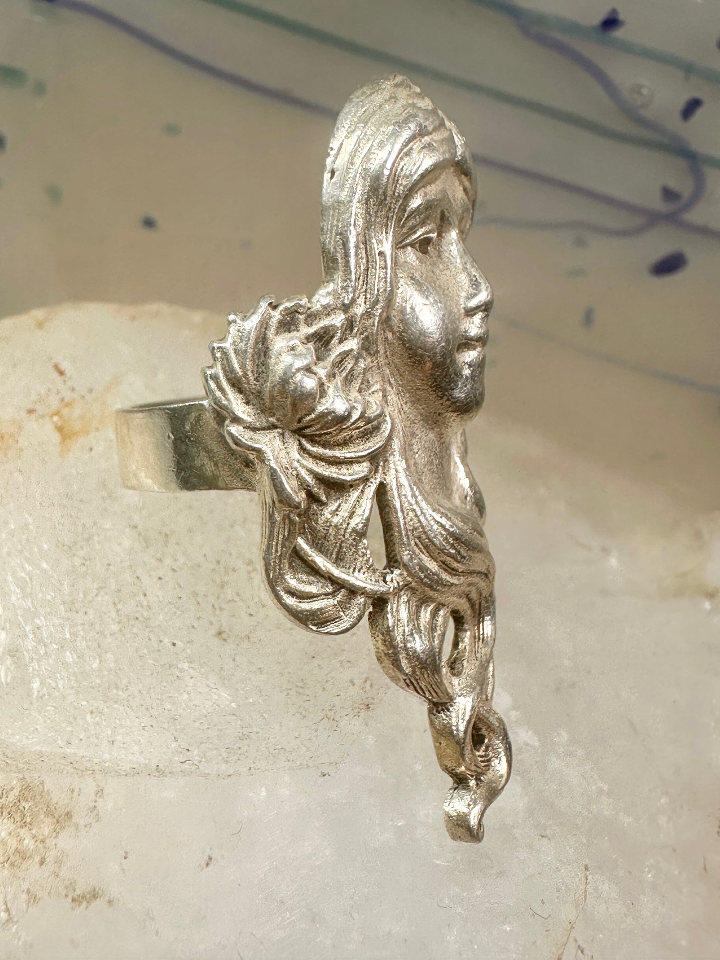 Face ring Art Nouveau long band size 6.75 sterling silver women ring