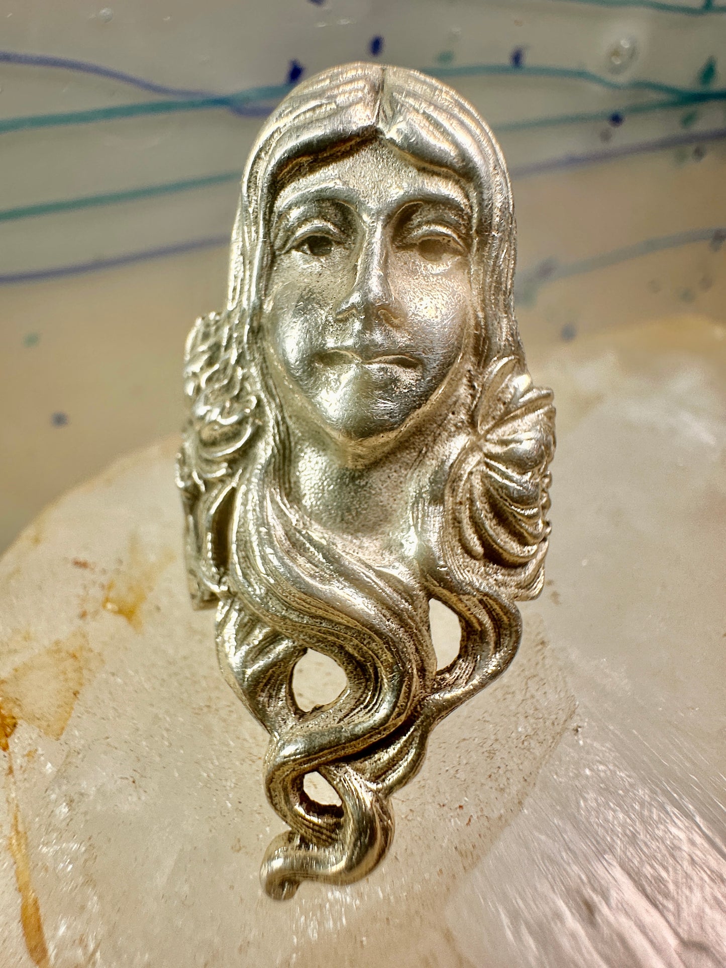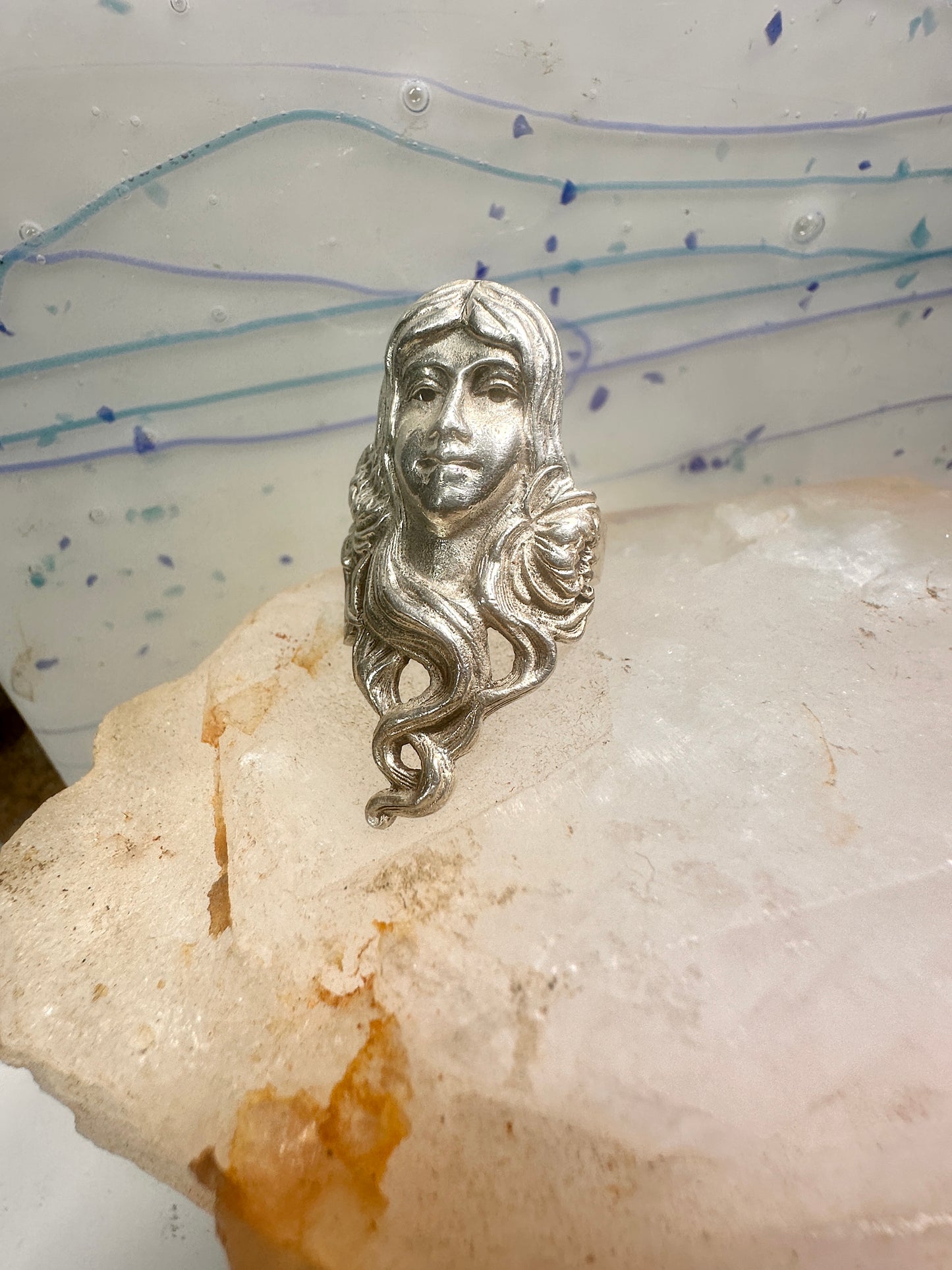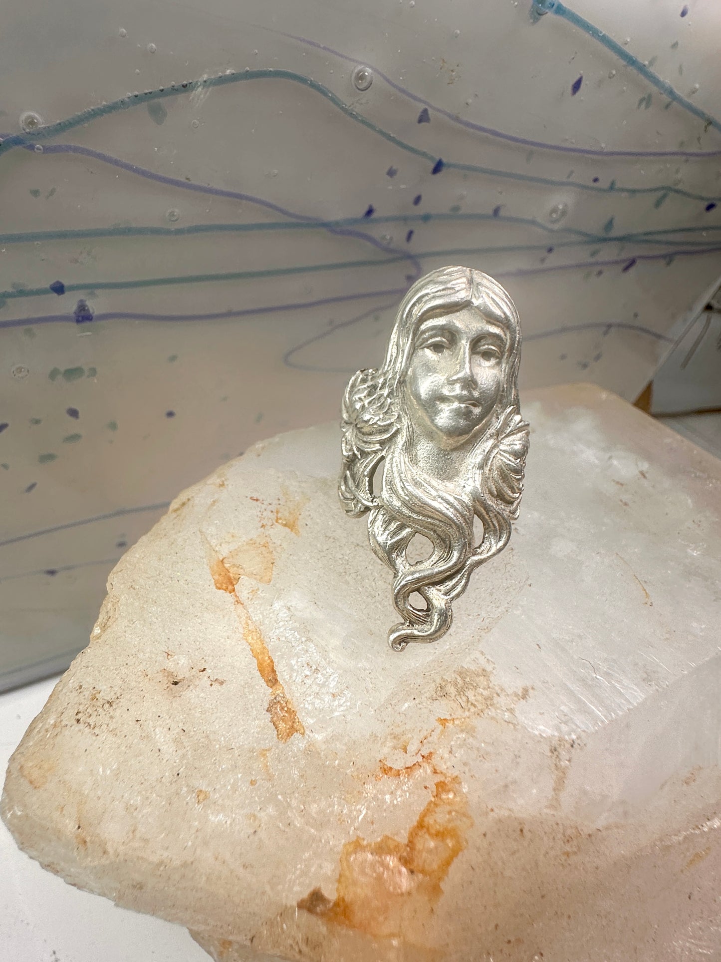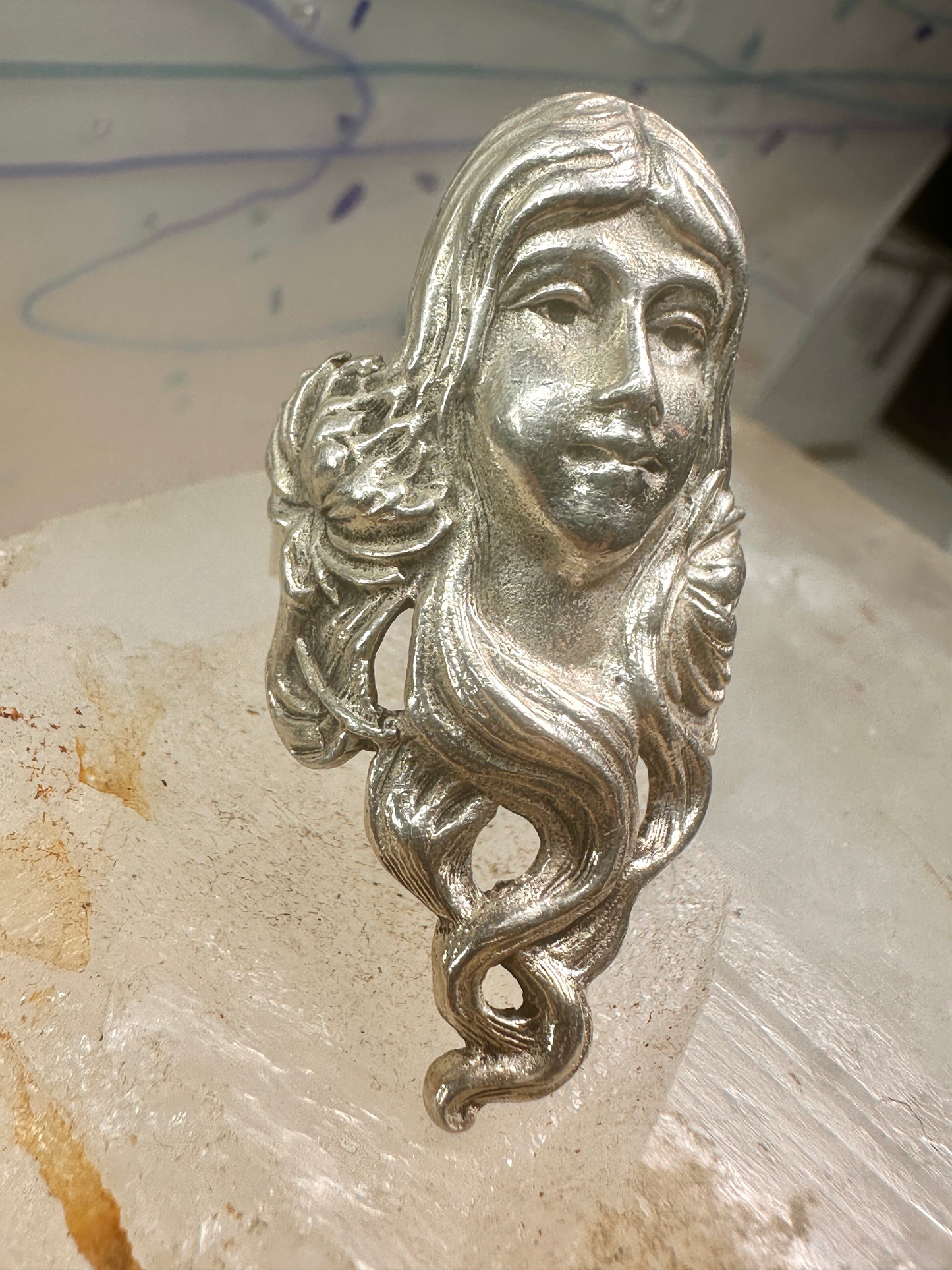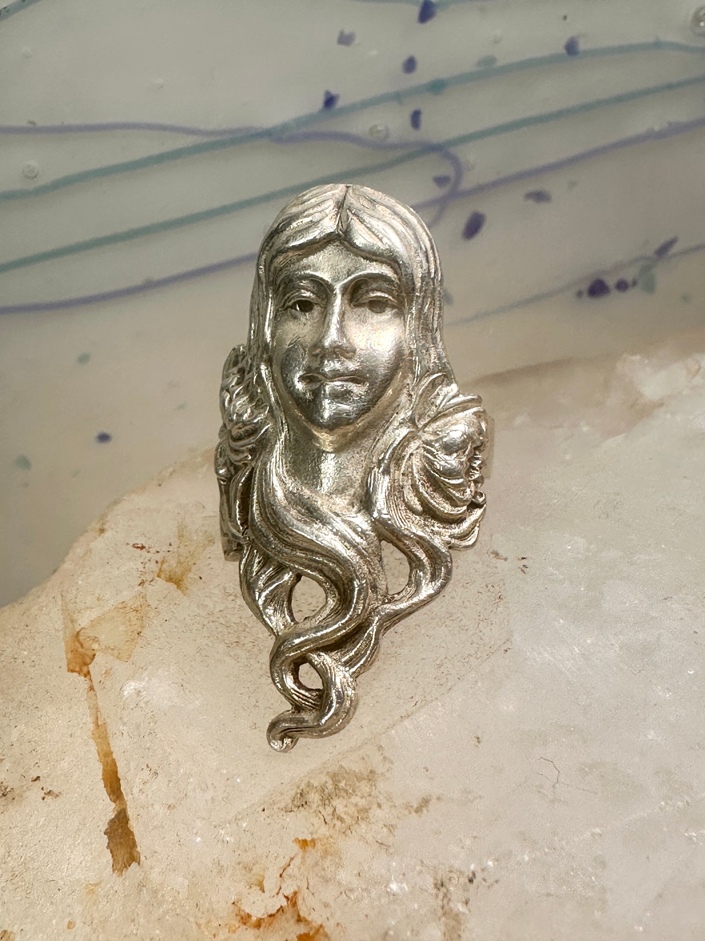 Face ring Art Nouveau long band size 6.75 sterling silver women ring