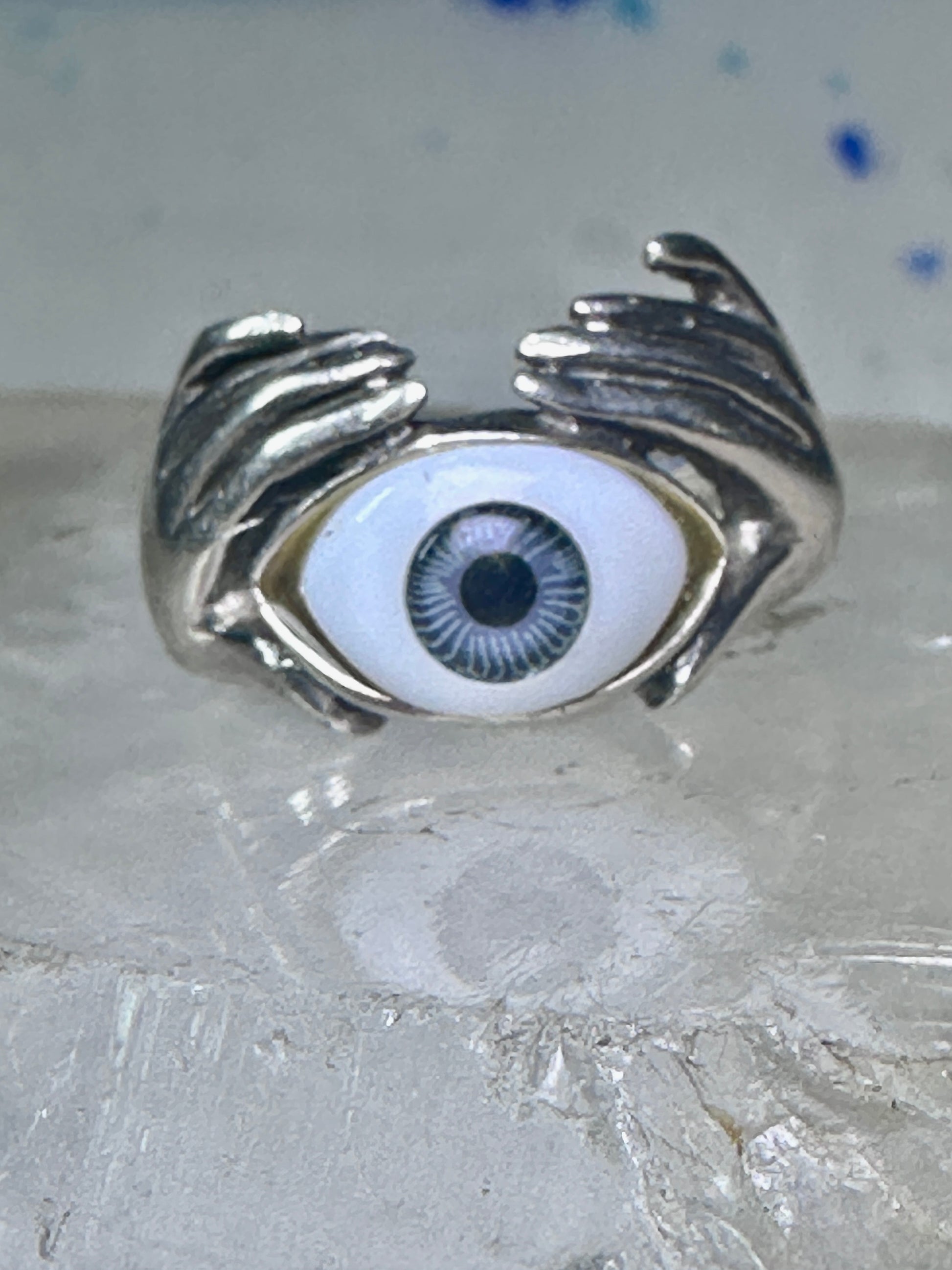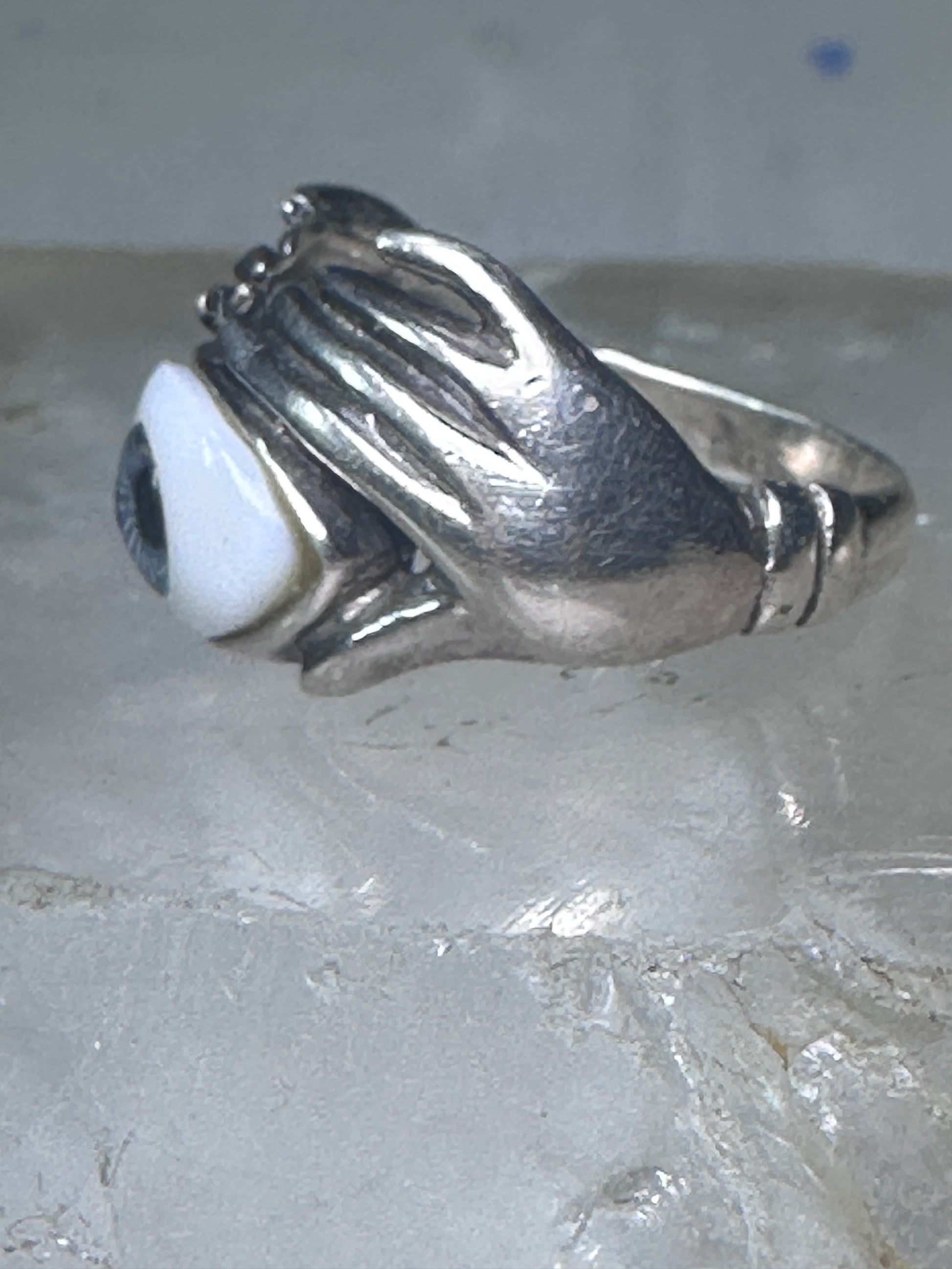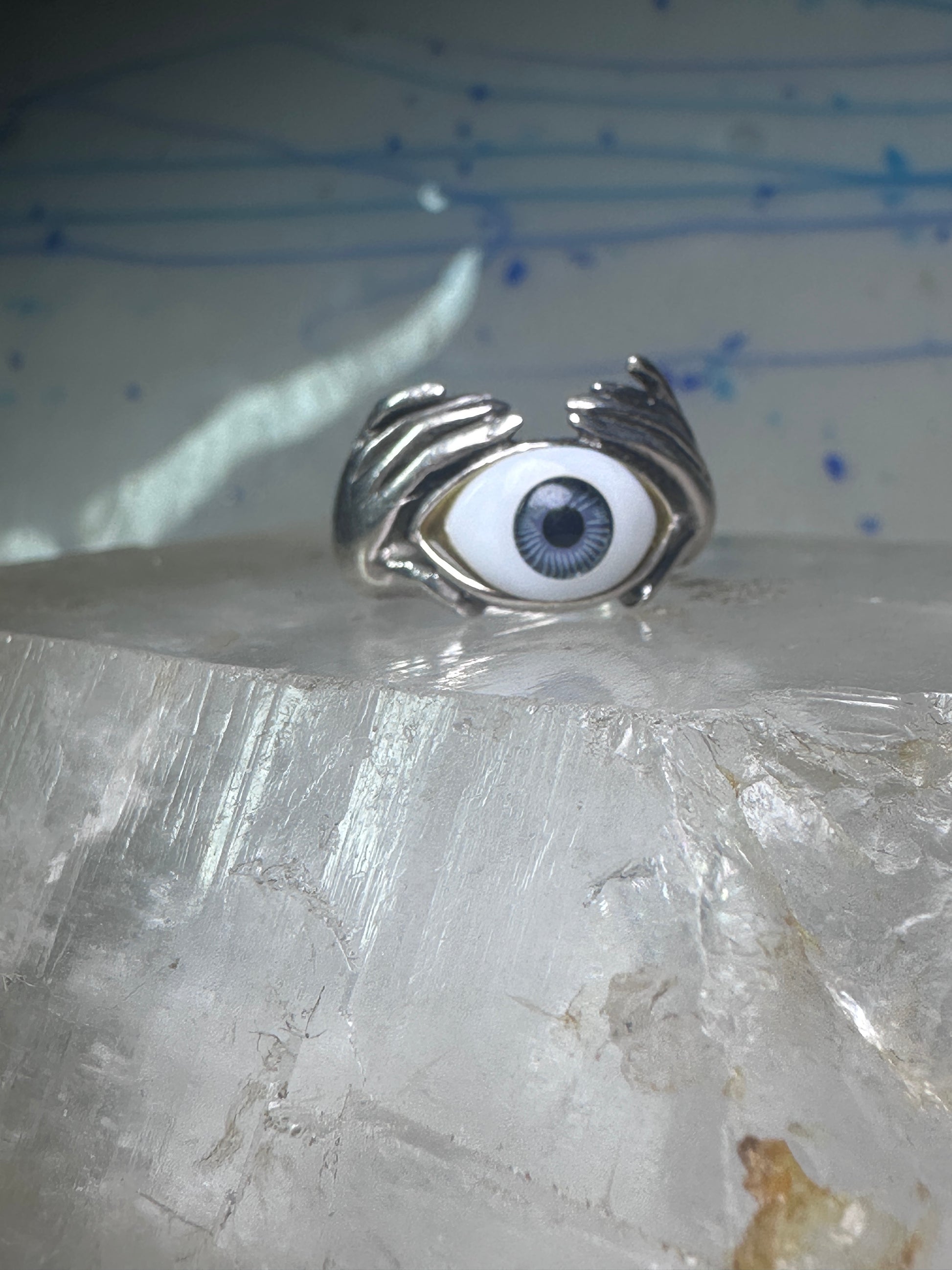 Hands holding an Eye ring pinky band size 5.50 sterling silver women