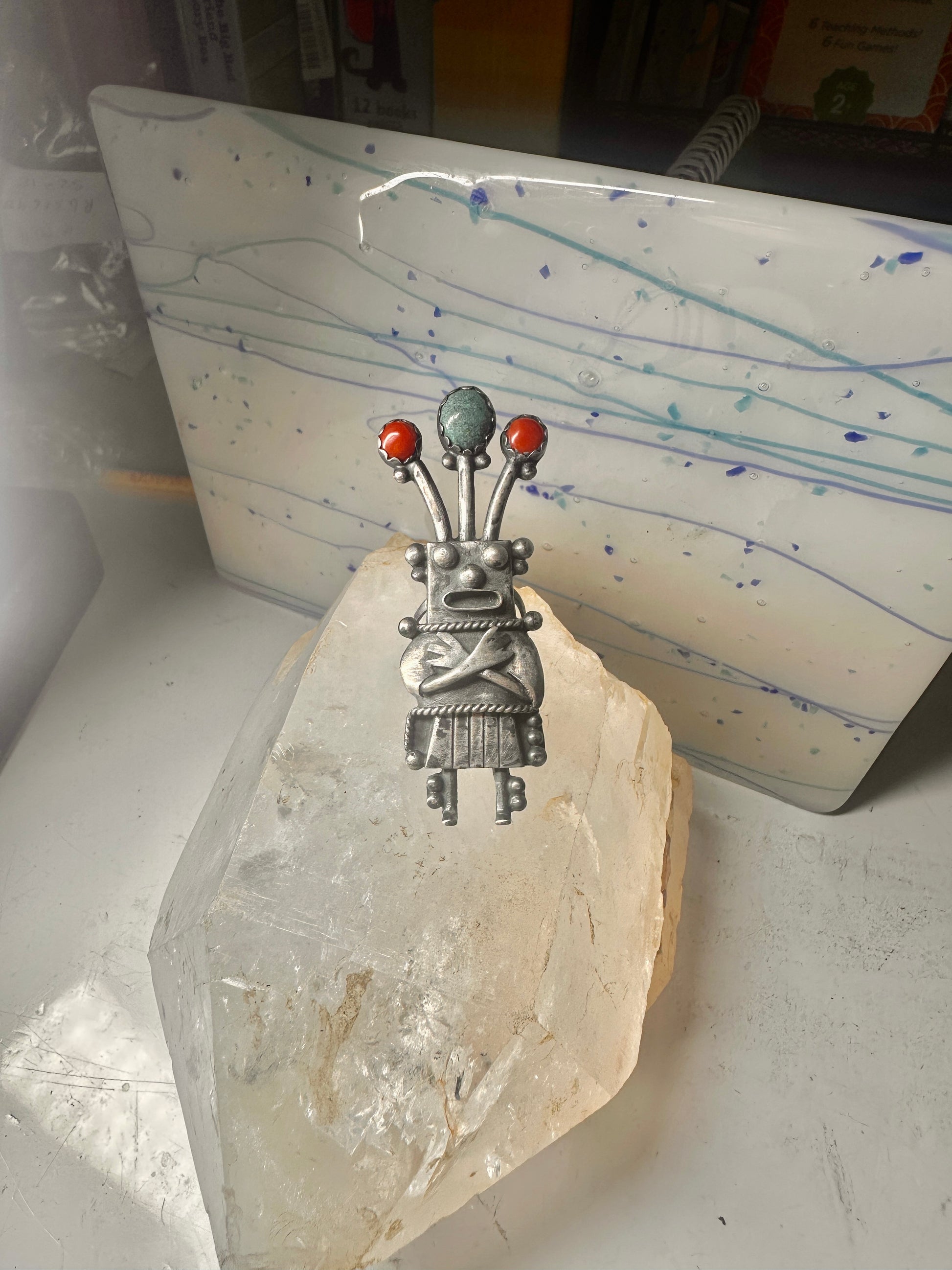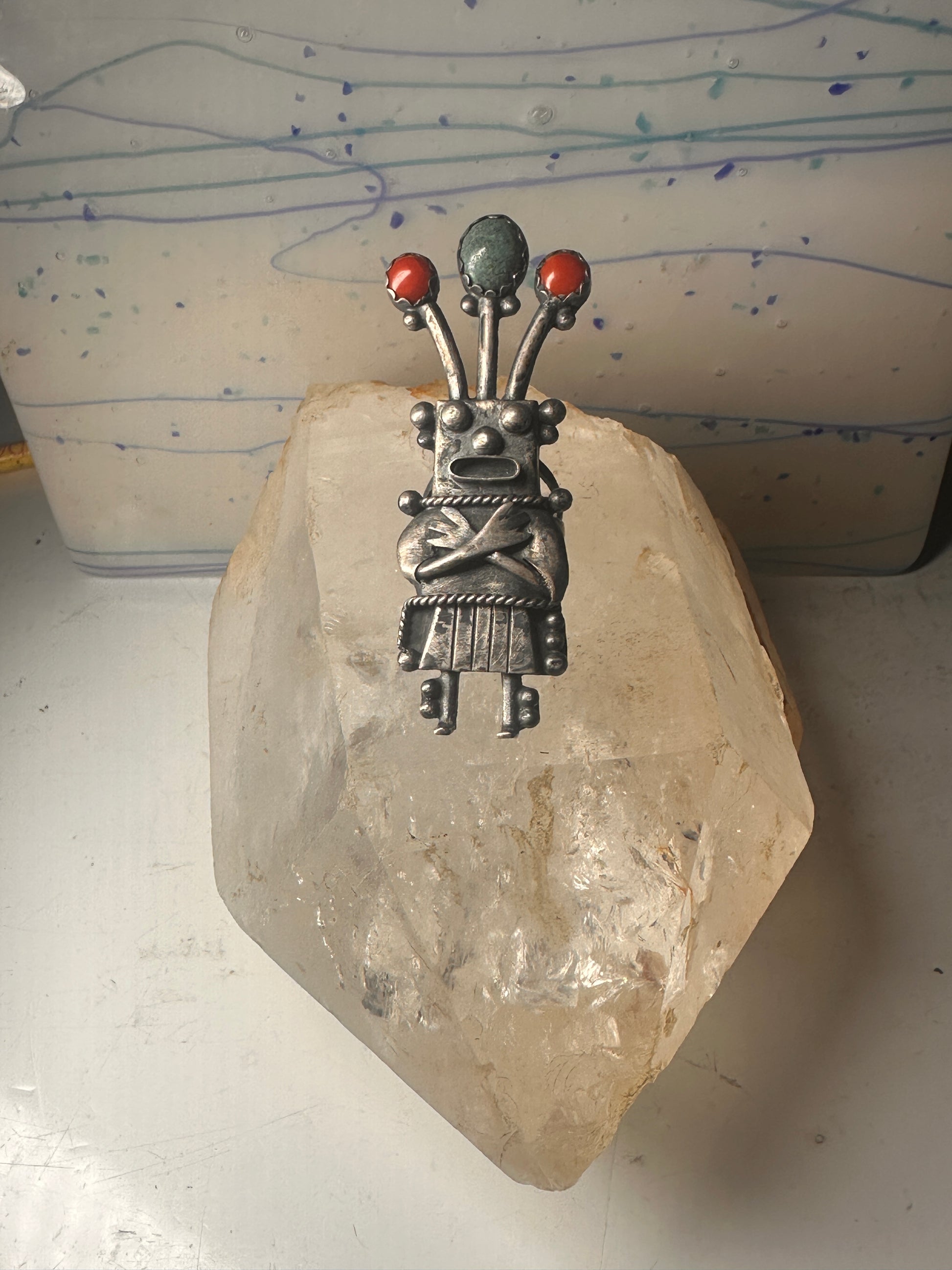 Kachina ring size 8.50 Navajo turquoise coral band sterling silver women
