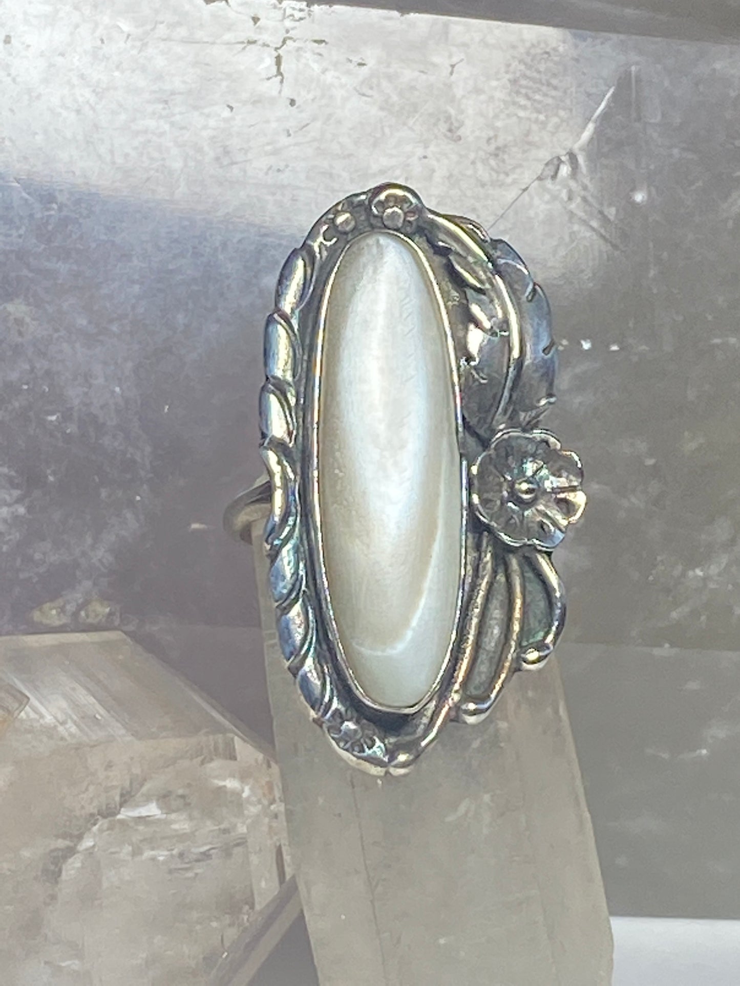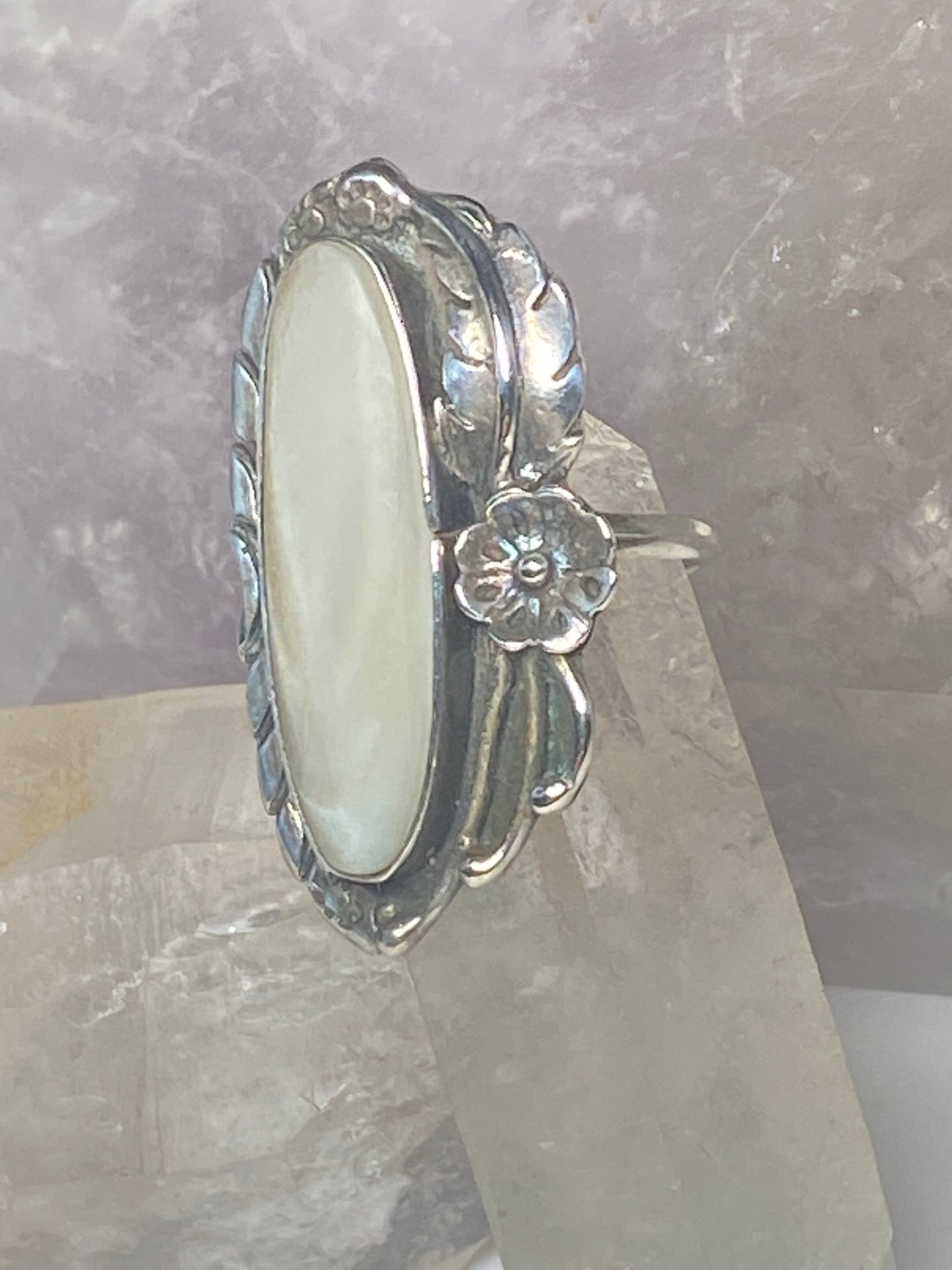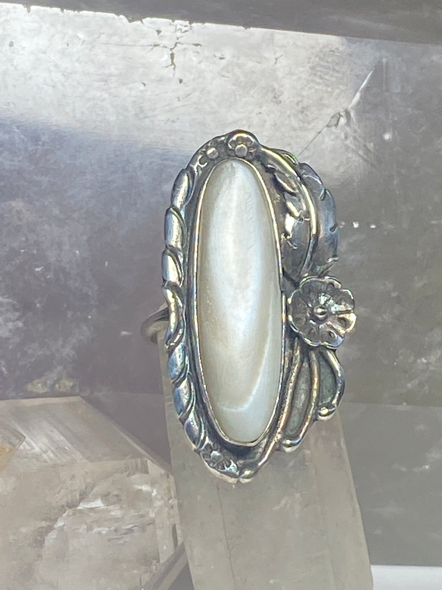 Long Mother of pearl ring Navajo southwest squash blossom sterling silver band women