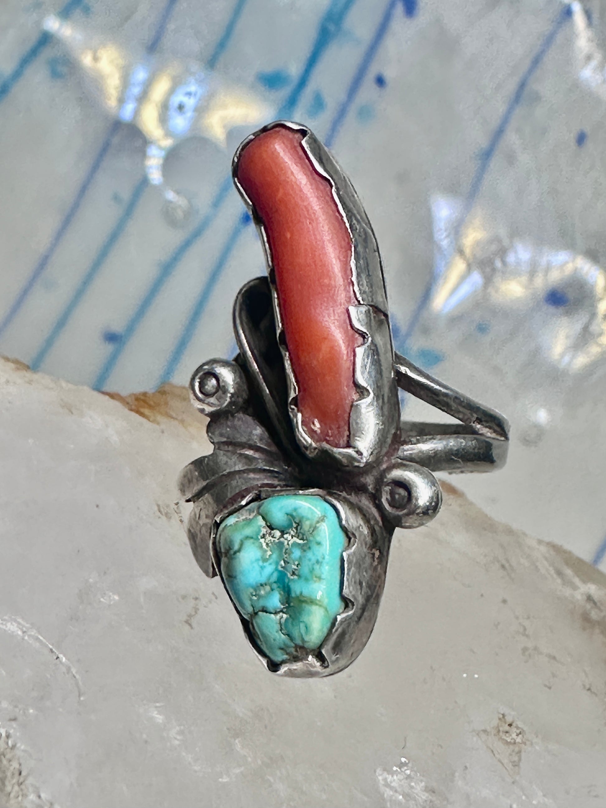 Long Navajo ring turquoise coral size 7 sterling silver women