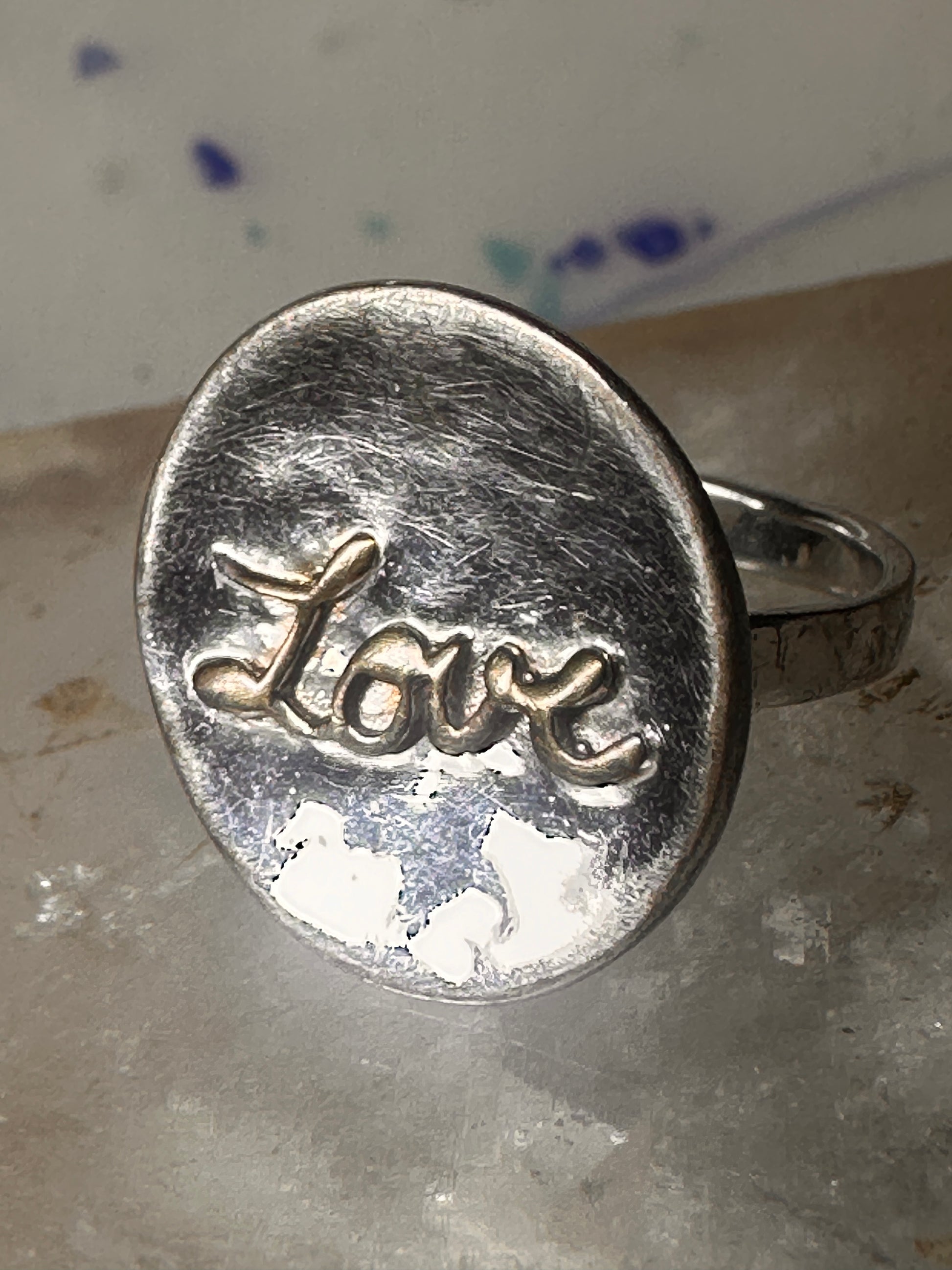 The word Love has some unknown goldish overlay over the sterling silver disc