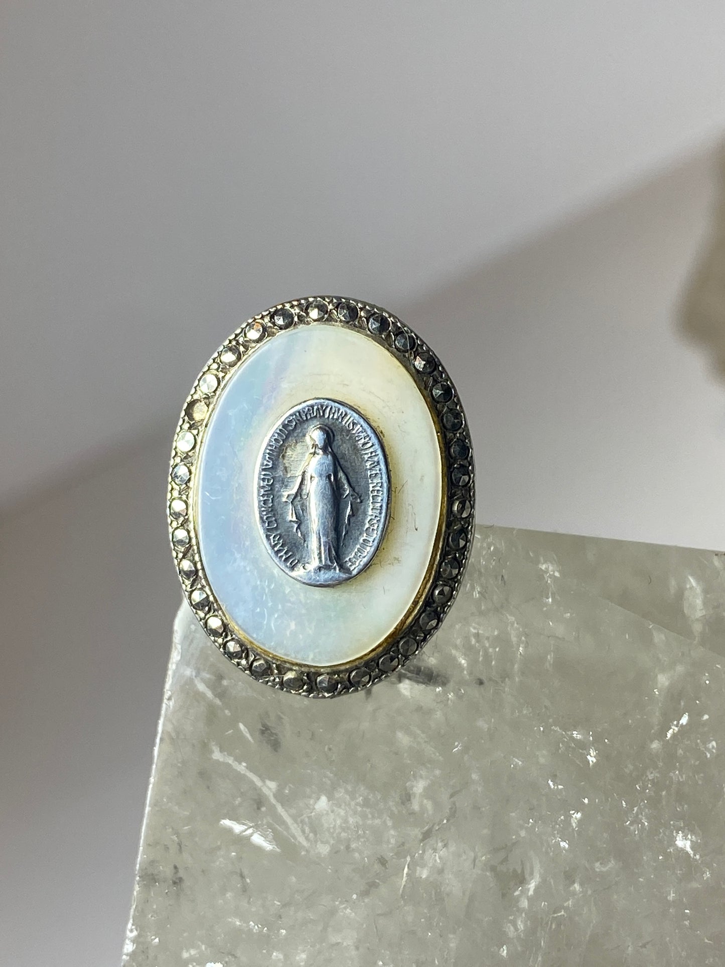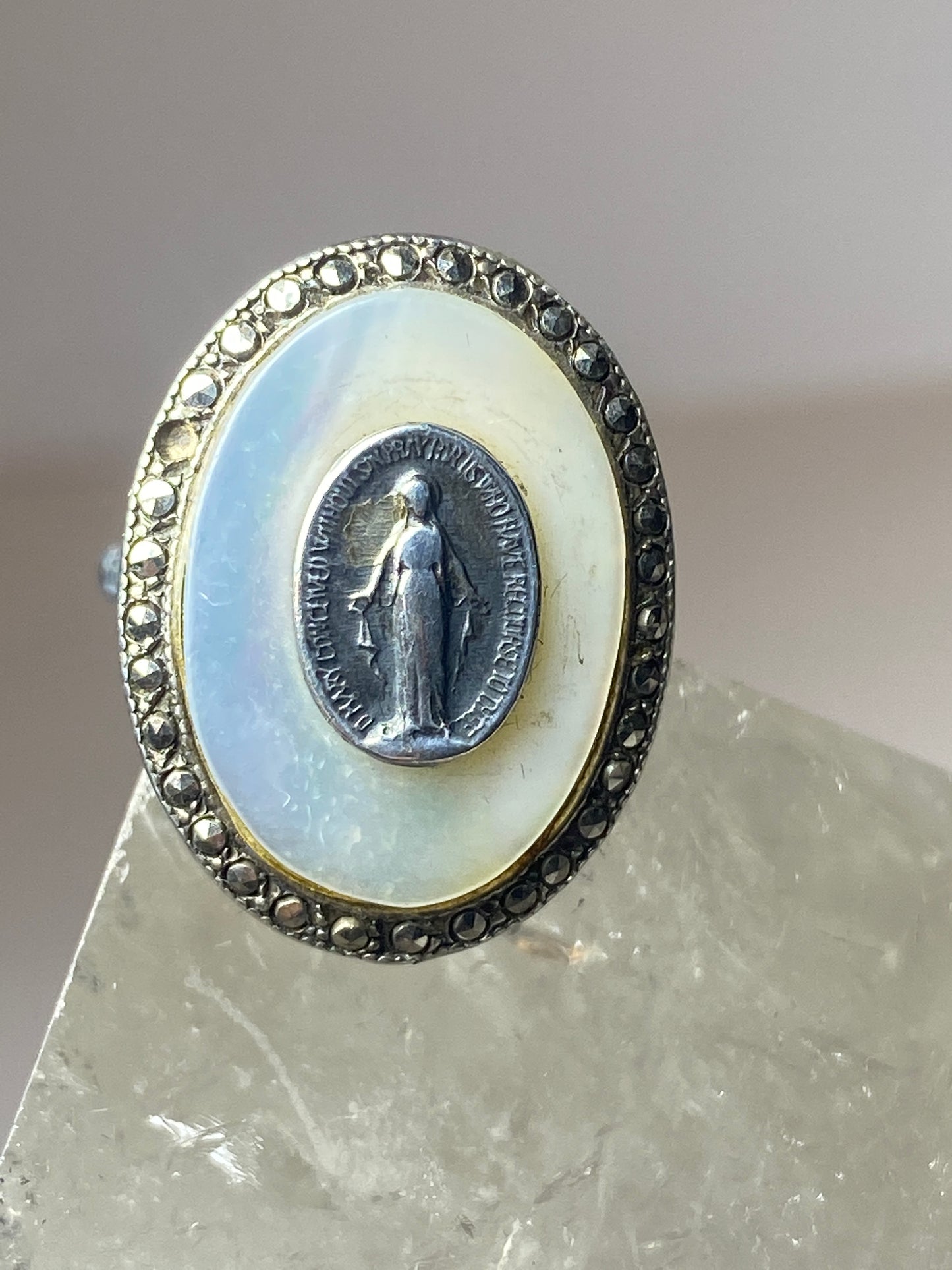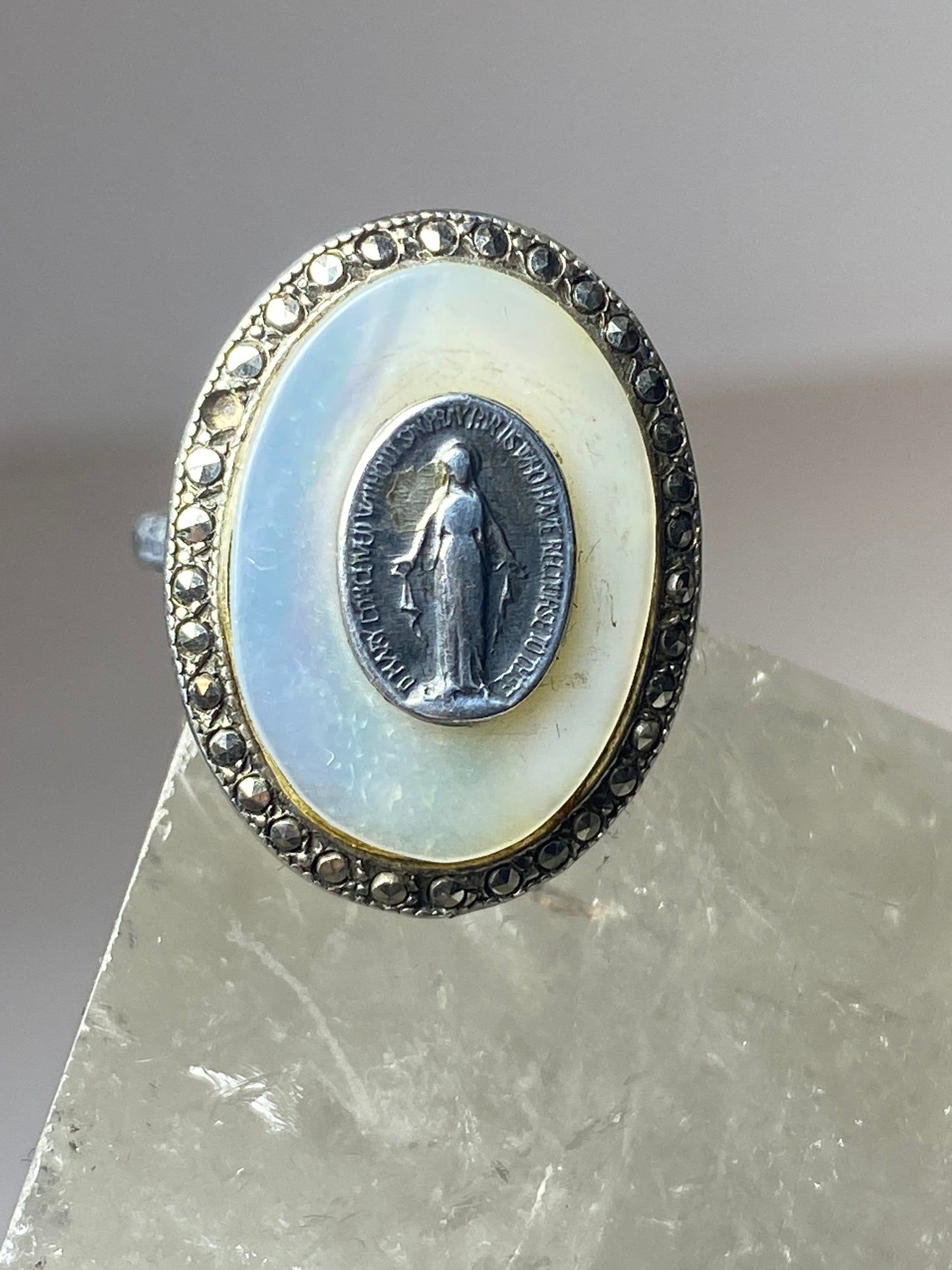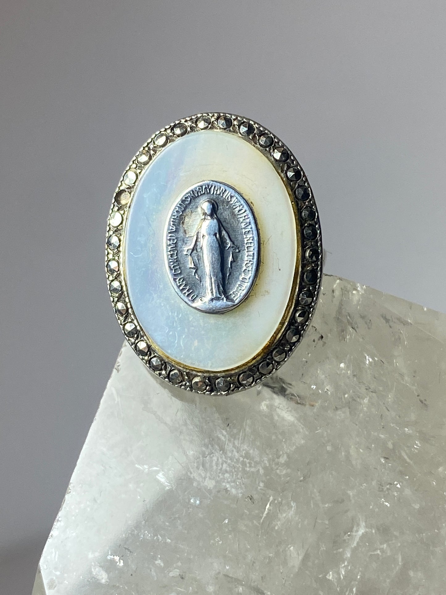Madonna ring Mother of Pearl marcasites Art Deco sterling silver women girls