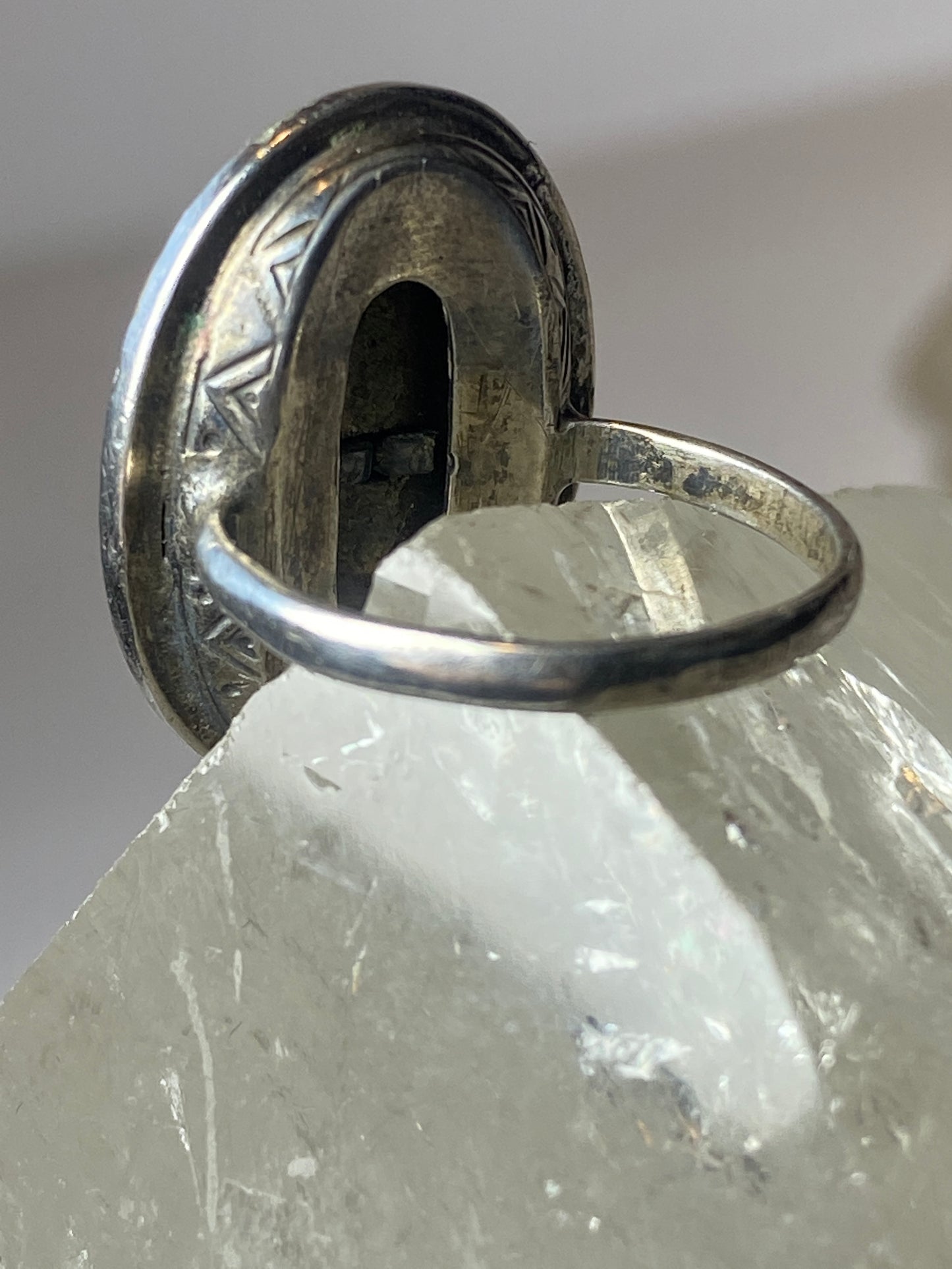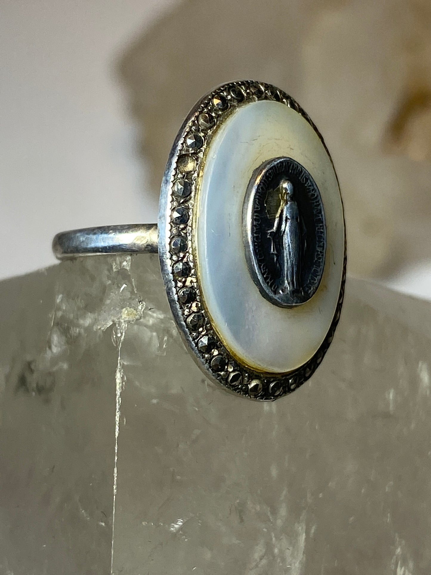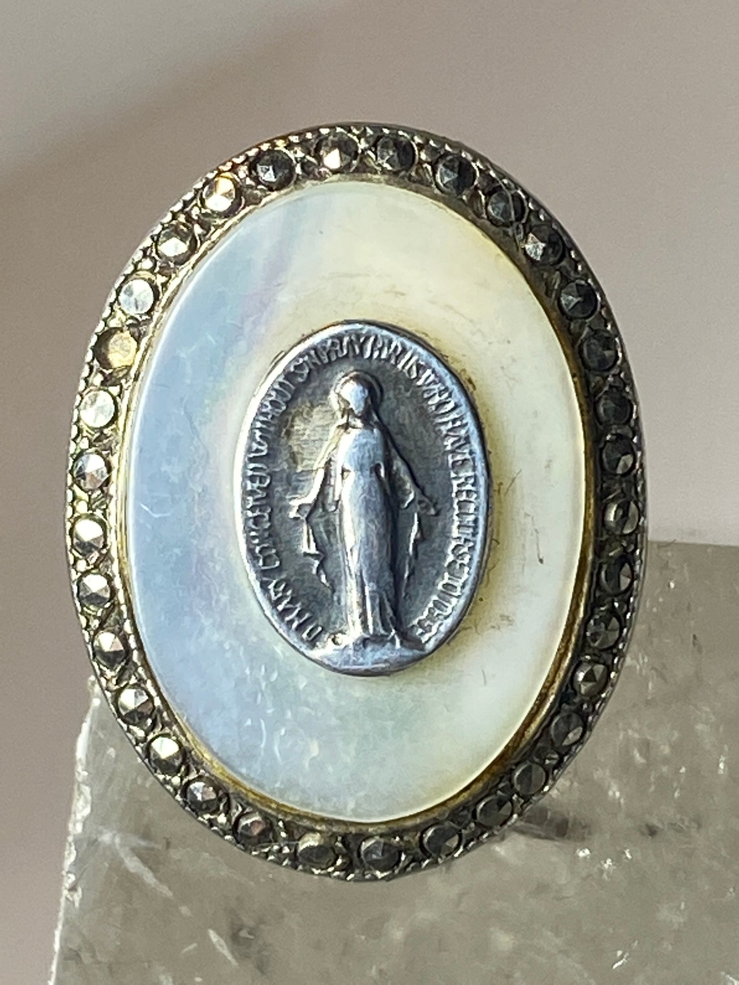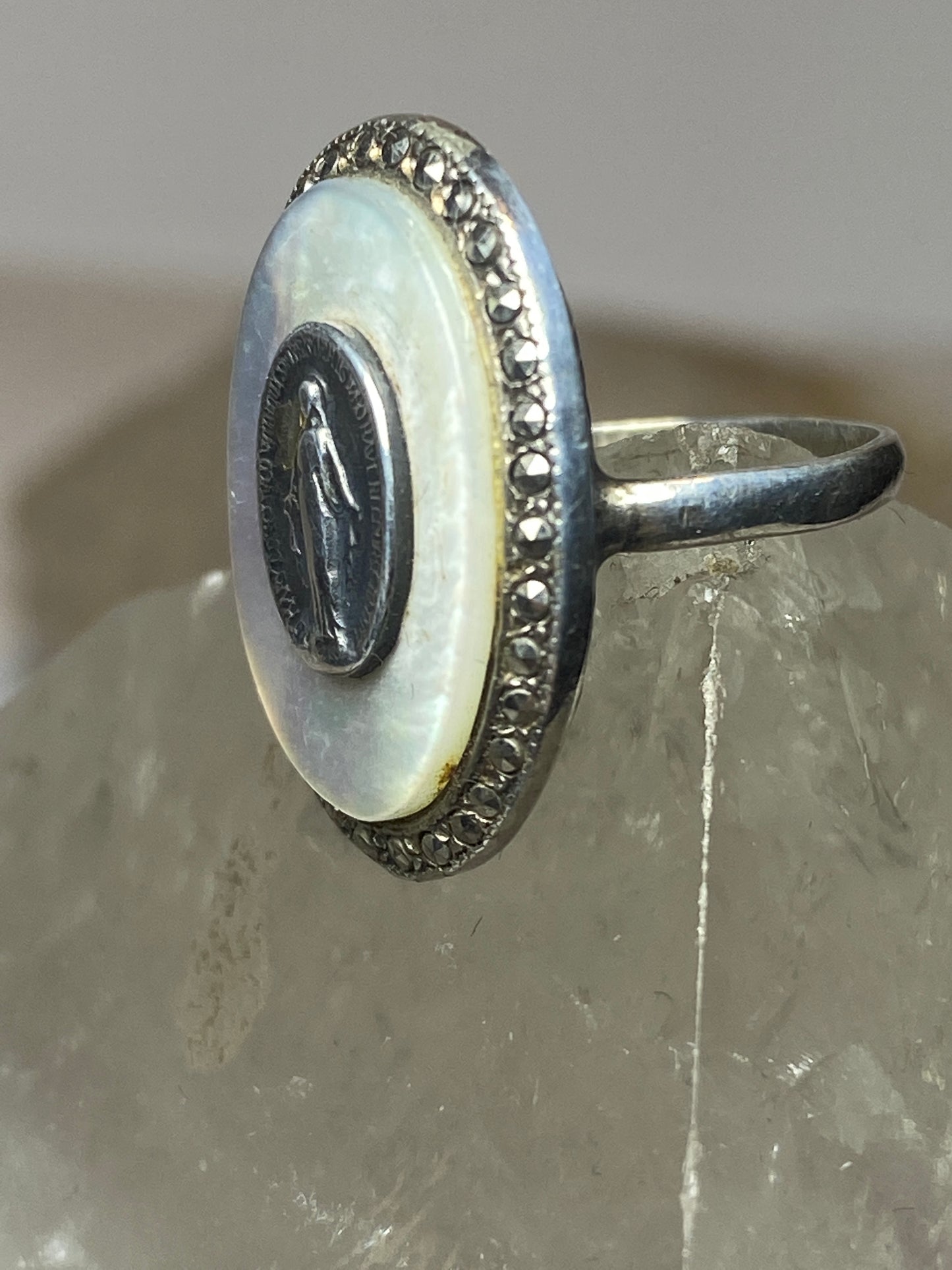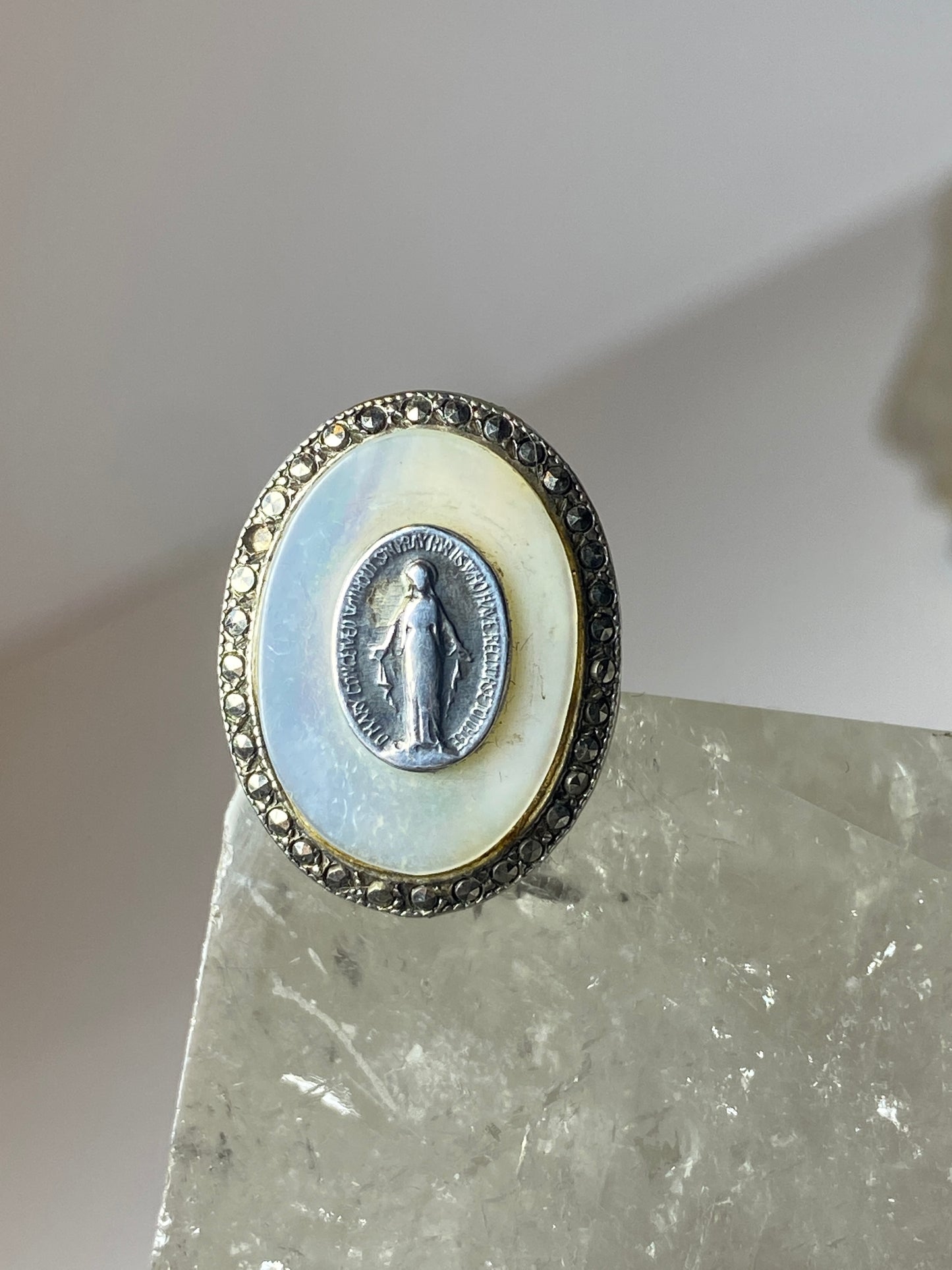Madonna ring Mother of Pearl marcasites Art Deco sterling silver women girls