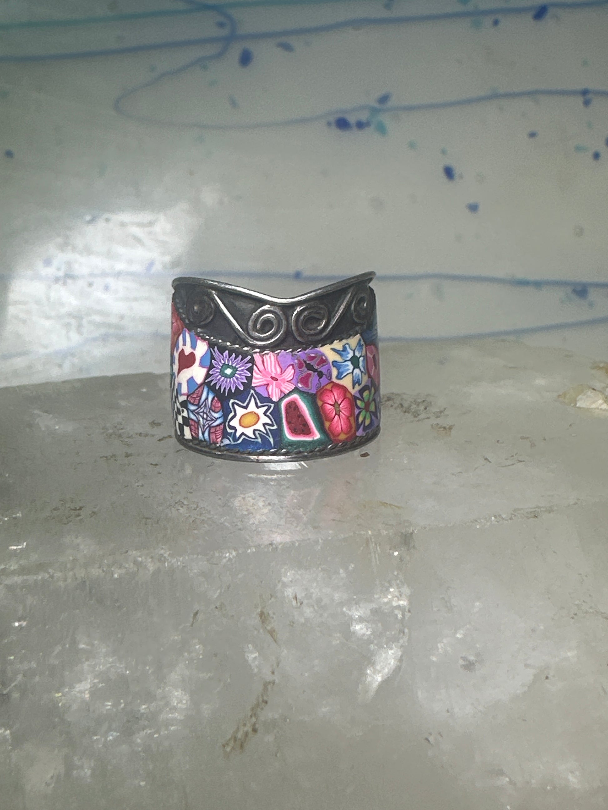 Millefiori ring cigar band floral flowers rope design glass sterling silver size 8 women girls