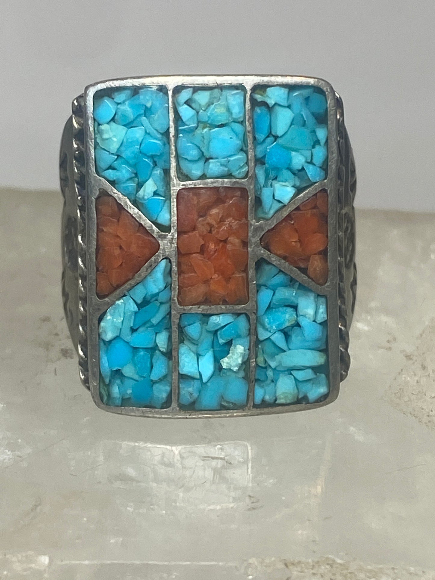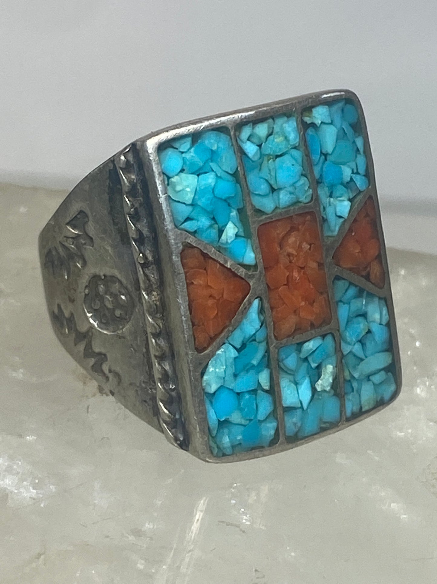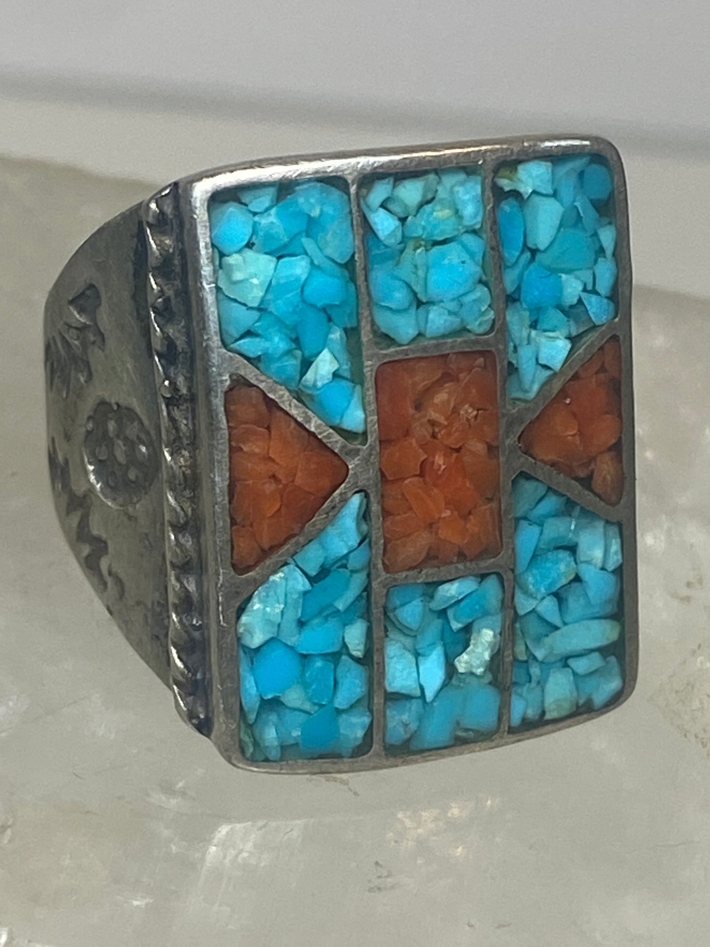 Navajo ring size 11 turquoise coral chips southwest sterling silver women men