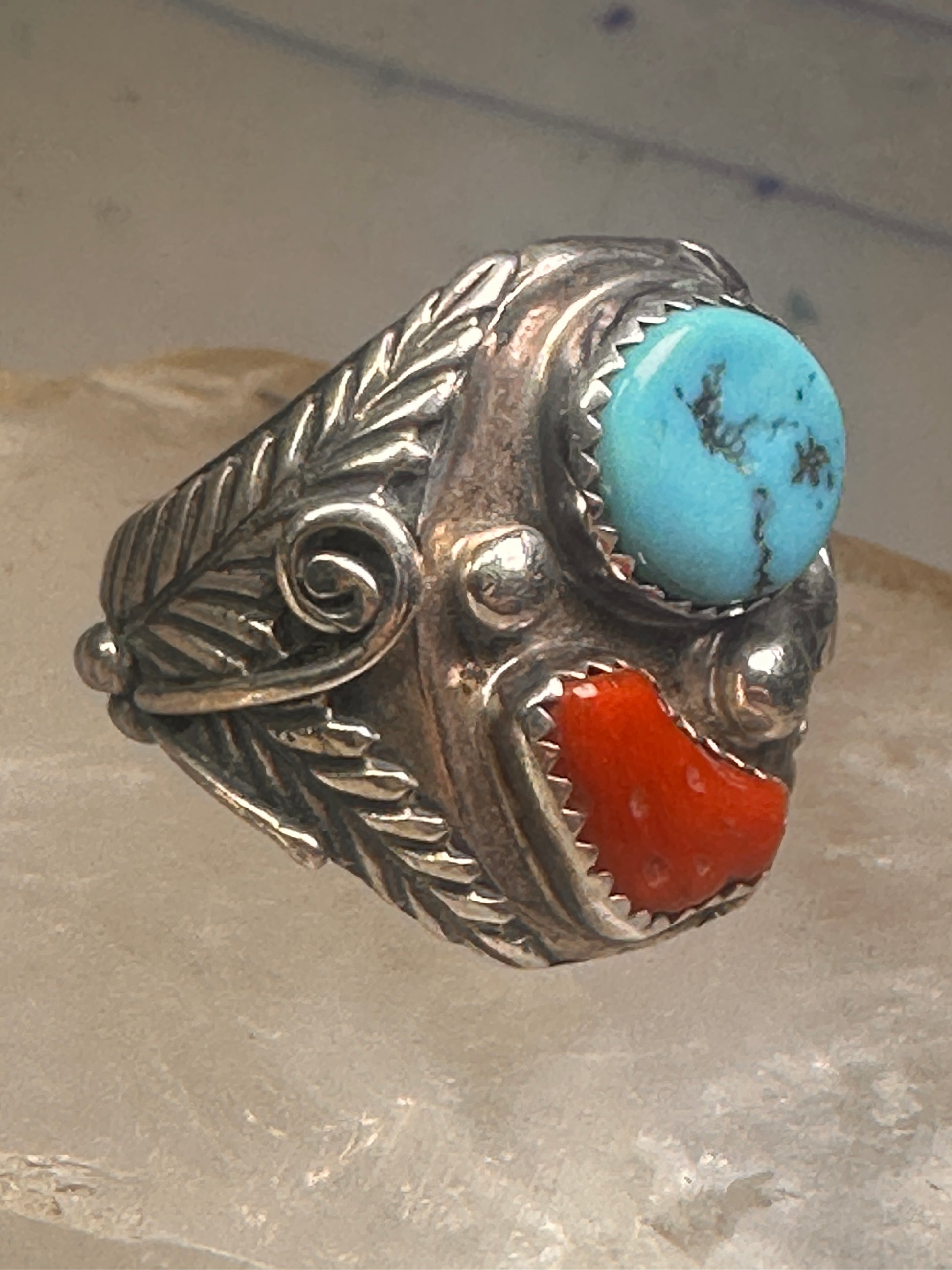 Navajo ring turquoise leaves feathers coral size 10 sterling silver women men