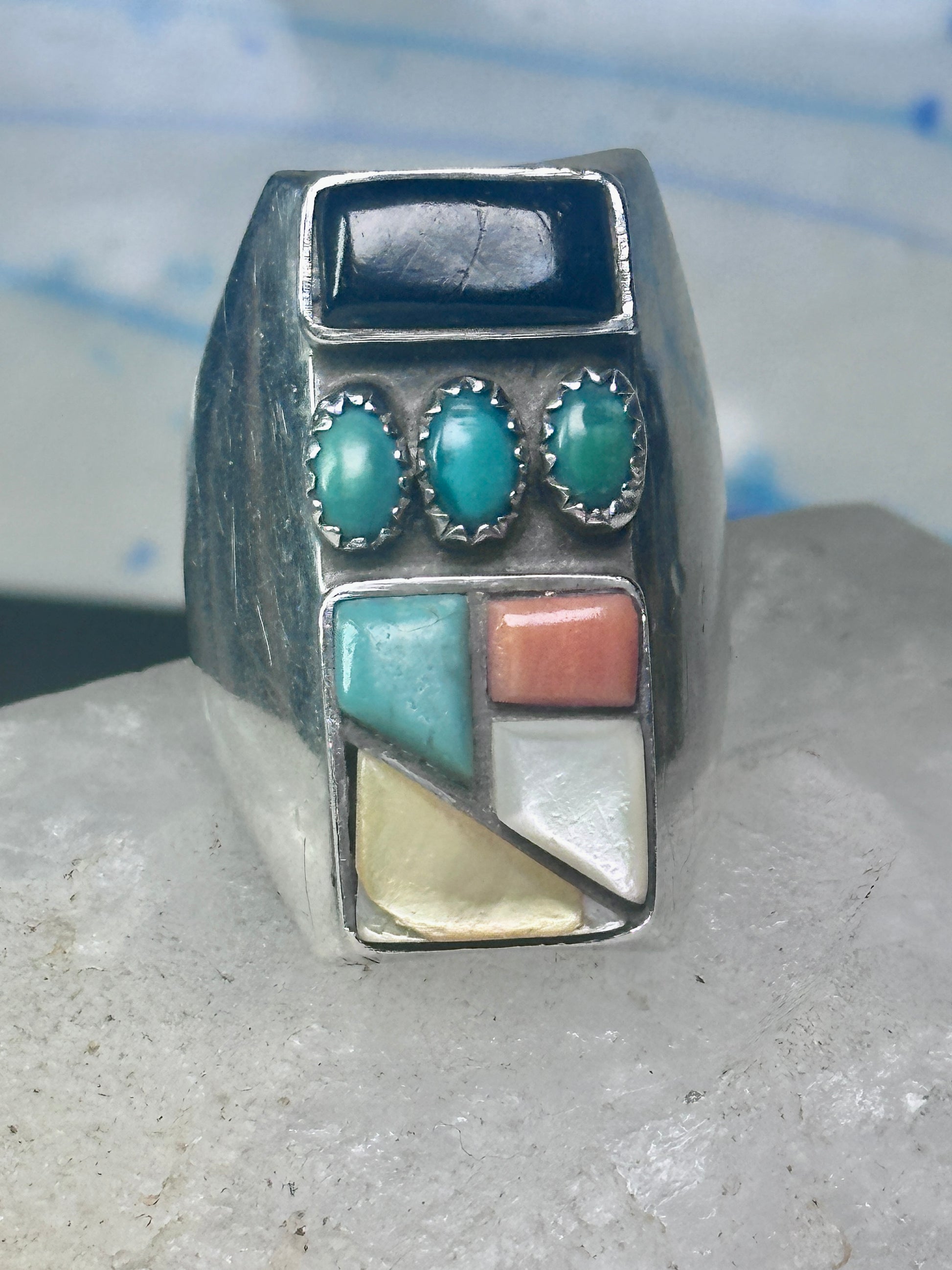 Navajo Ring turquoise coral onyx mop band size 11 sterling silver men