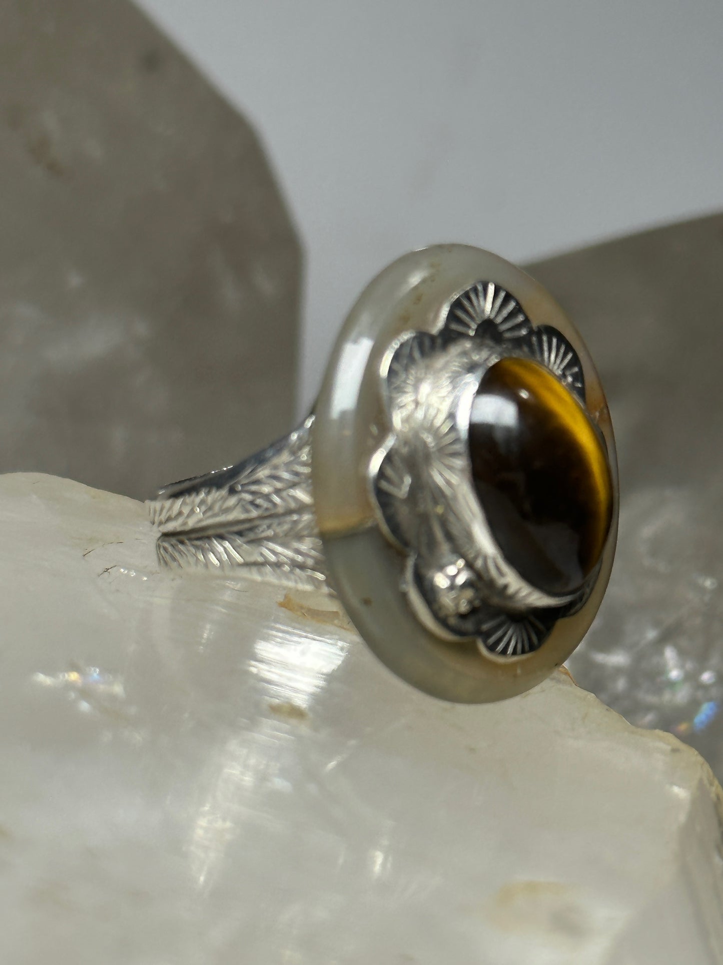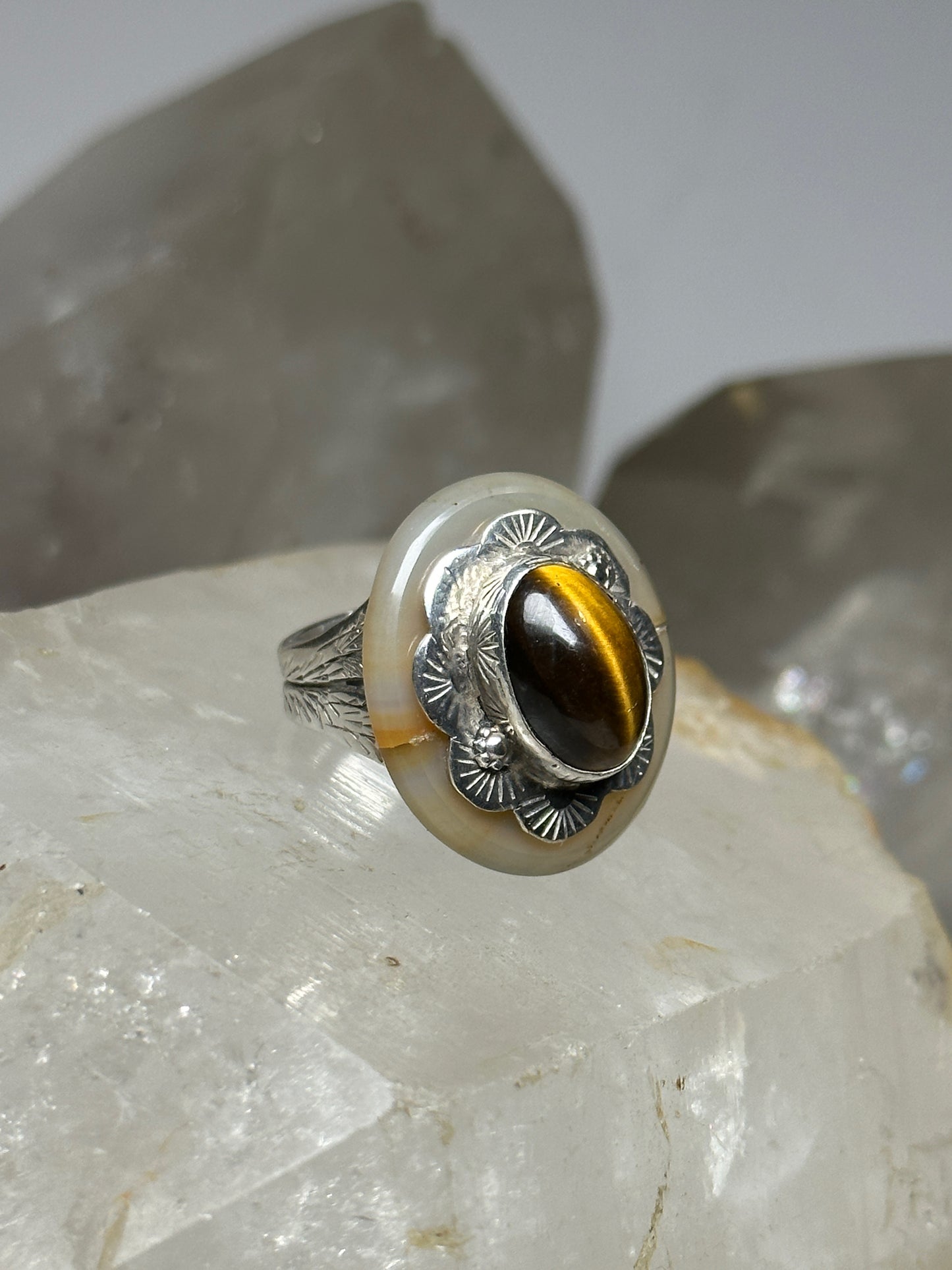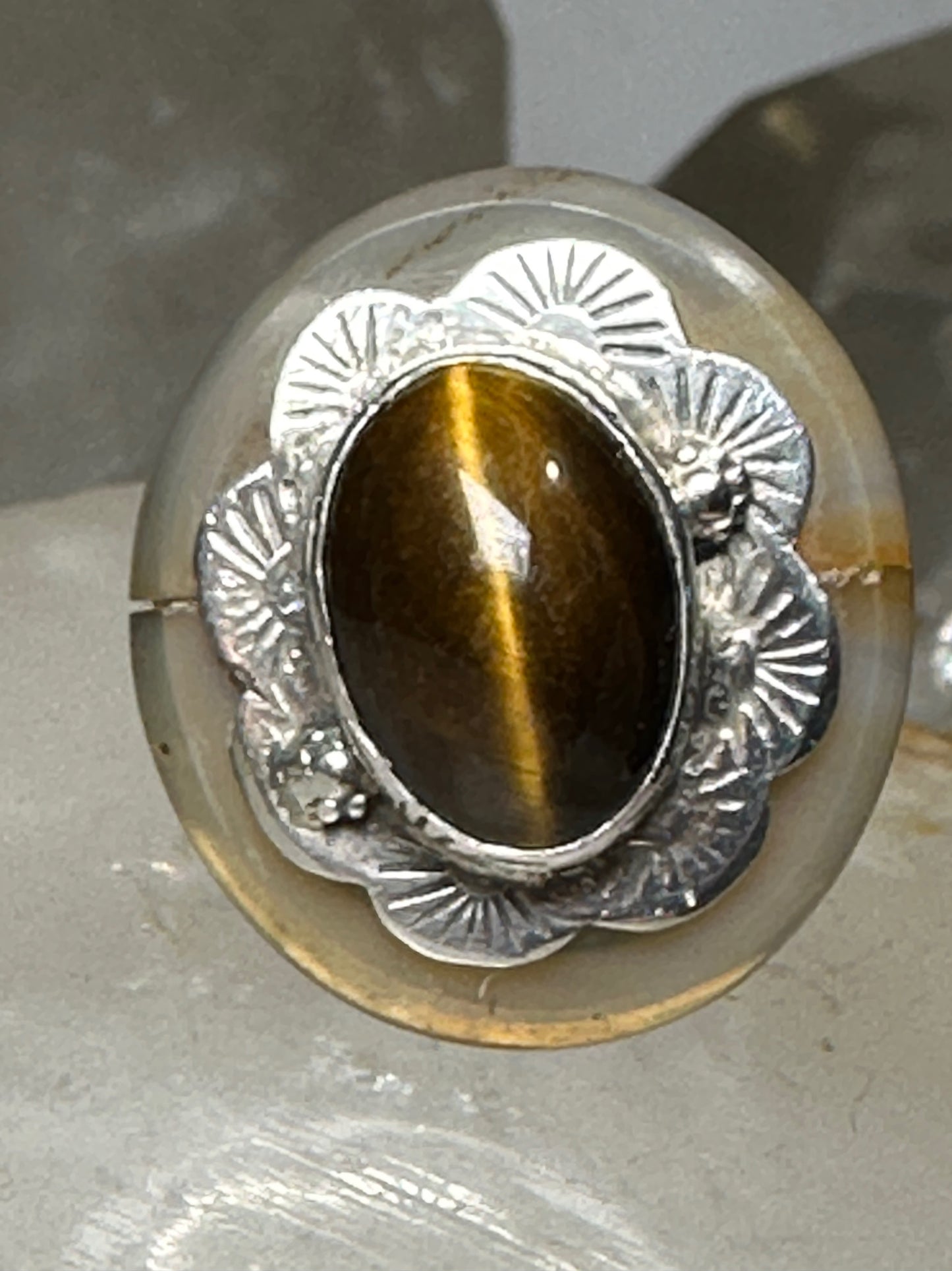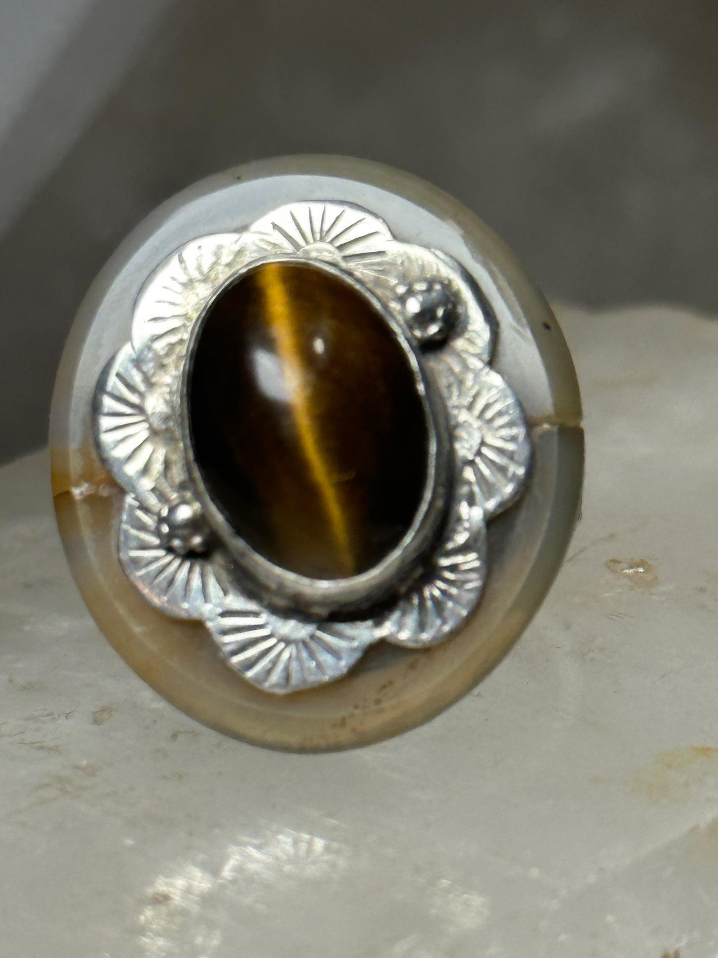 Tiger Eye ring Floral agate band size 7.50 sterling silver women