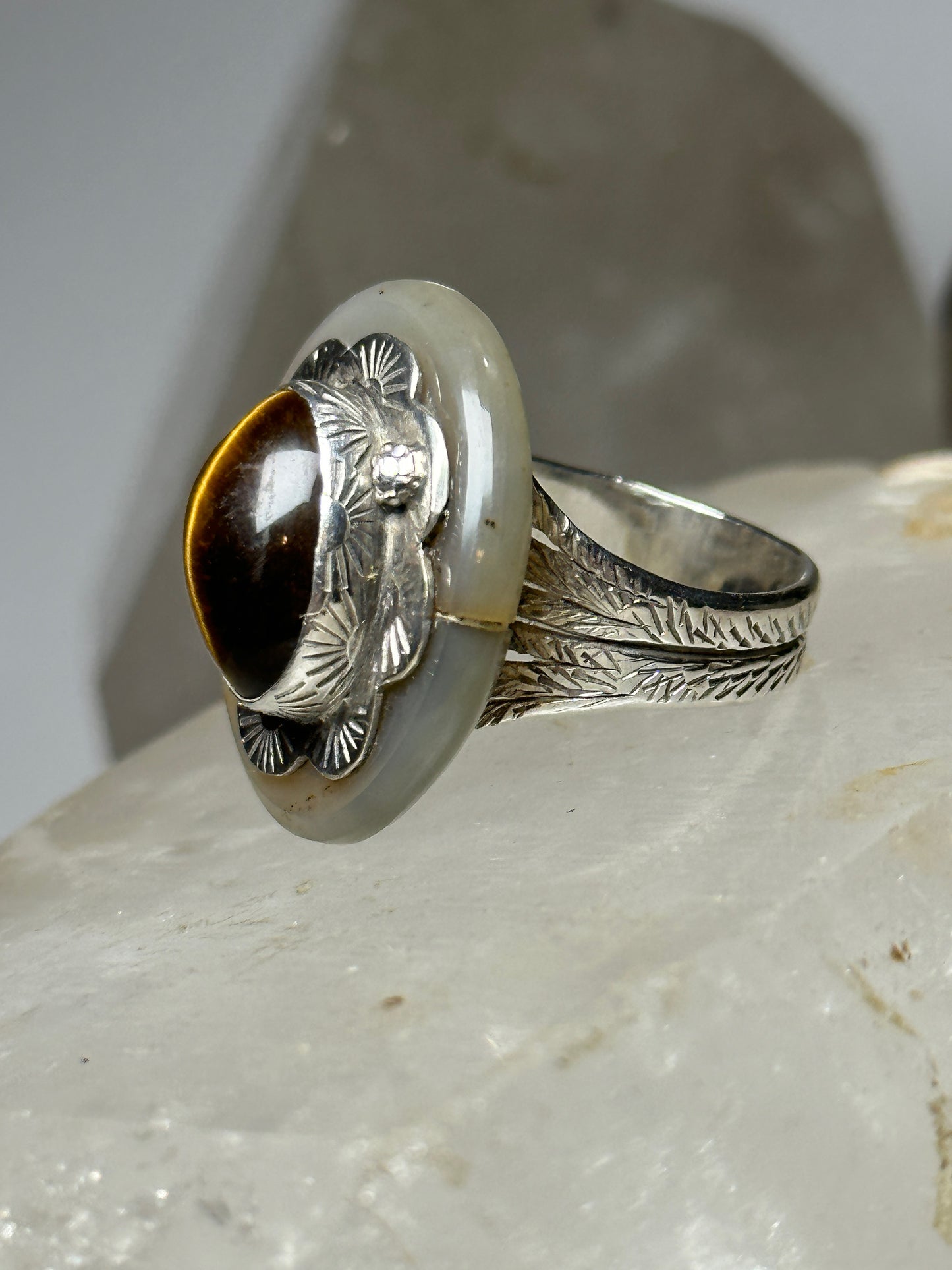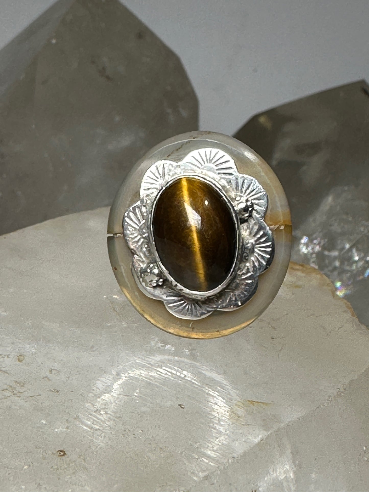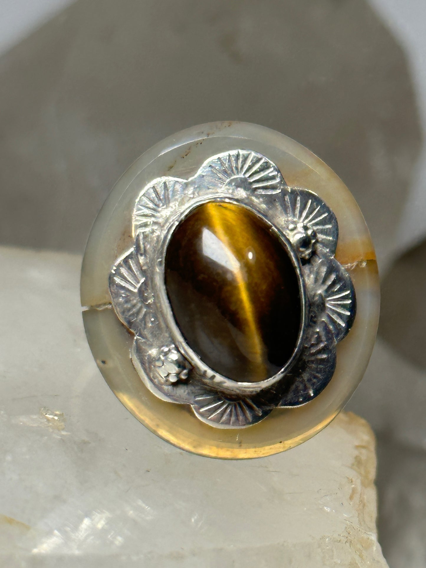 Tiger Eye ring Floral agate band size 7.50 sterling silver women