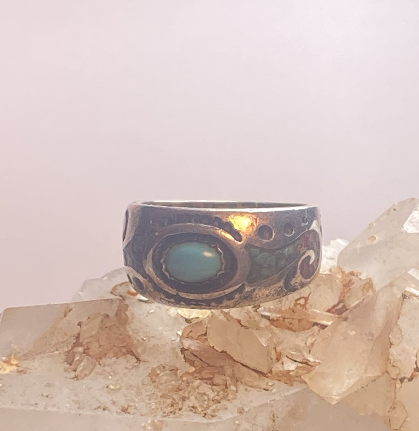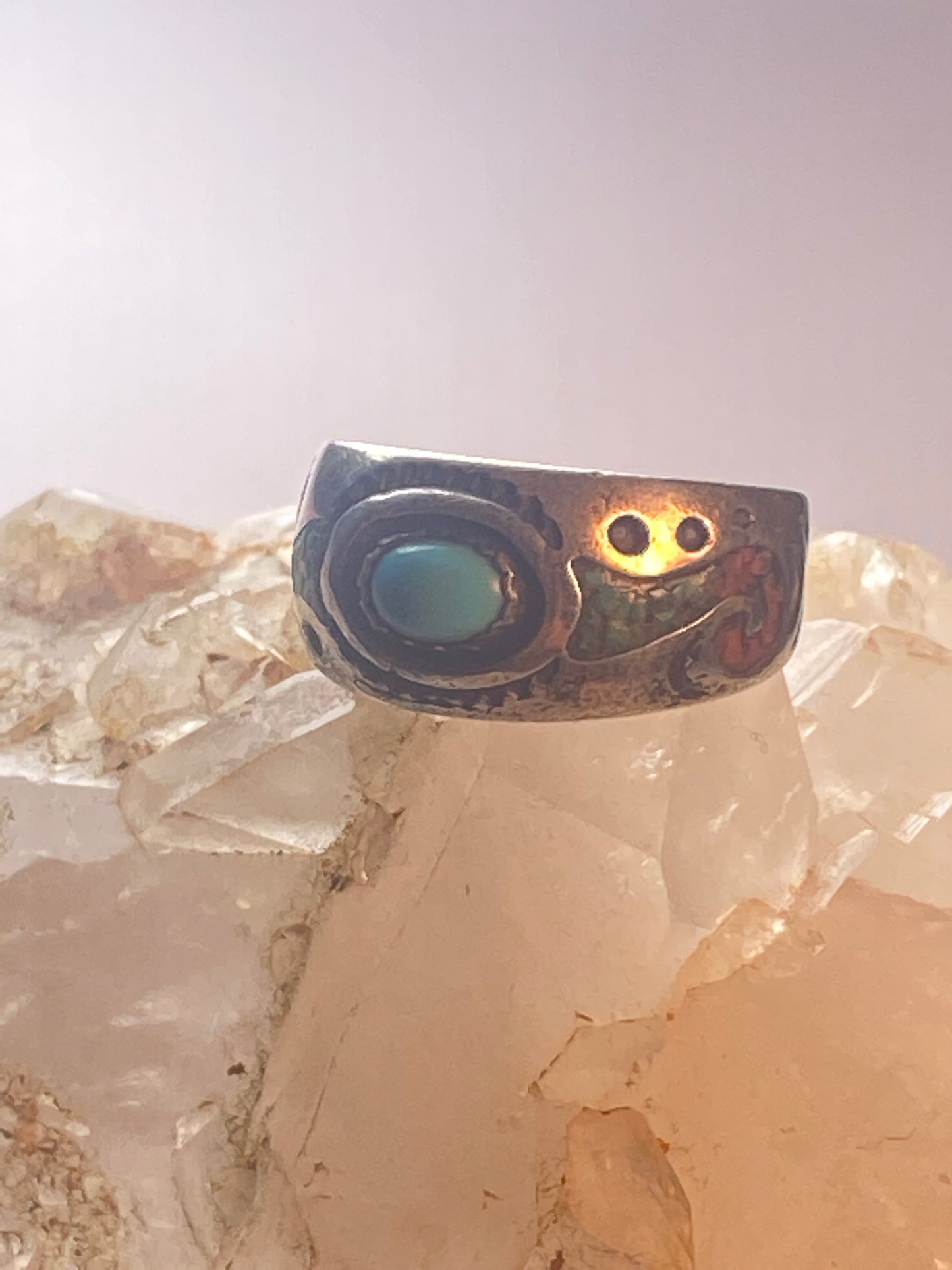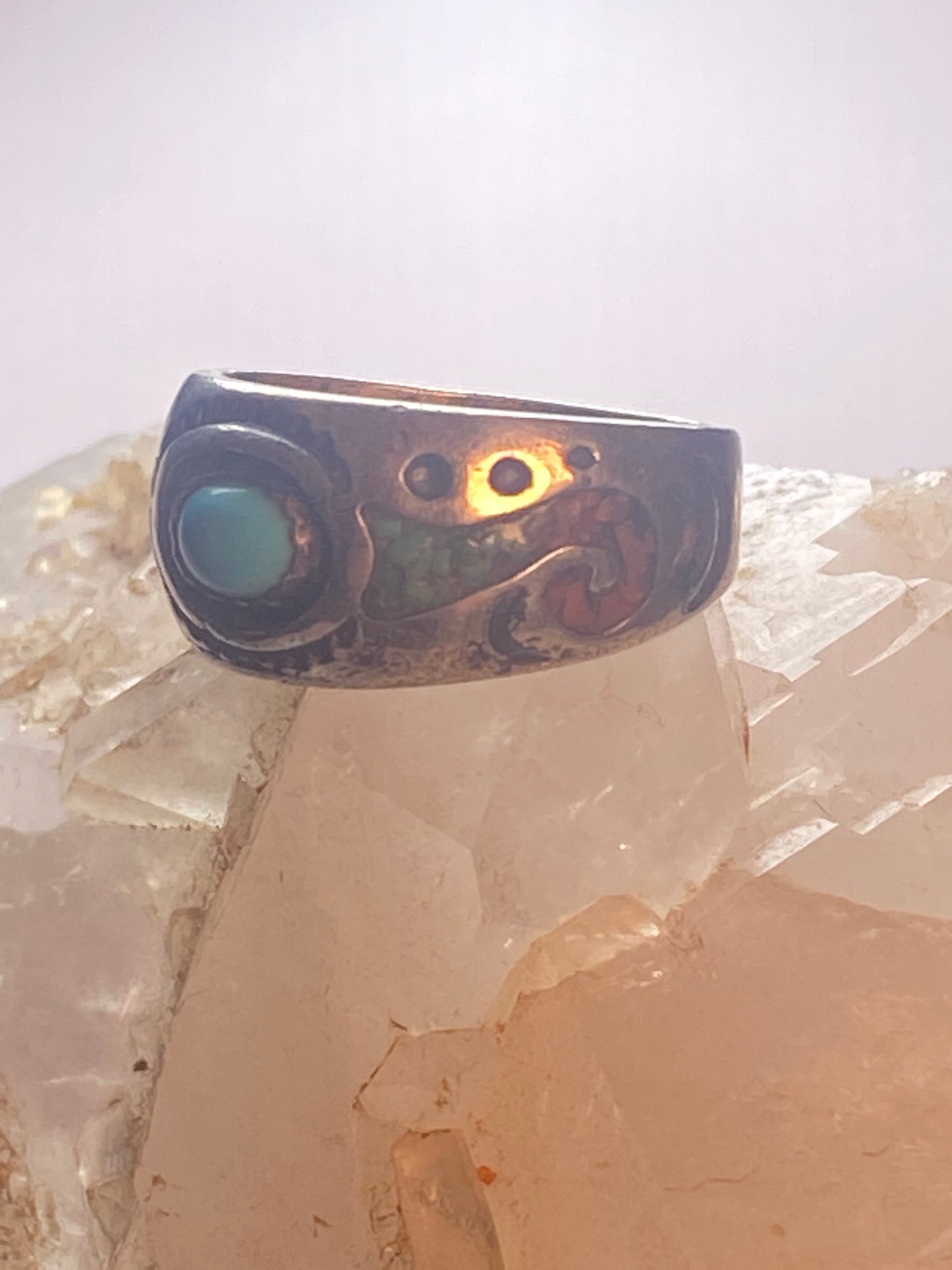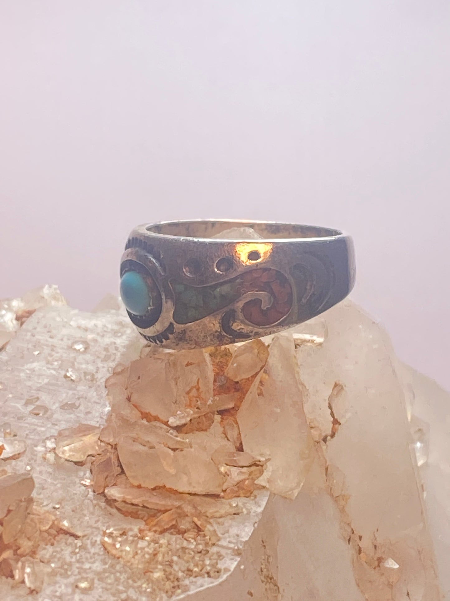 Turquoise ring size 5.50 Navajo band southwest swirls pinky coral chips sterling silver women