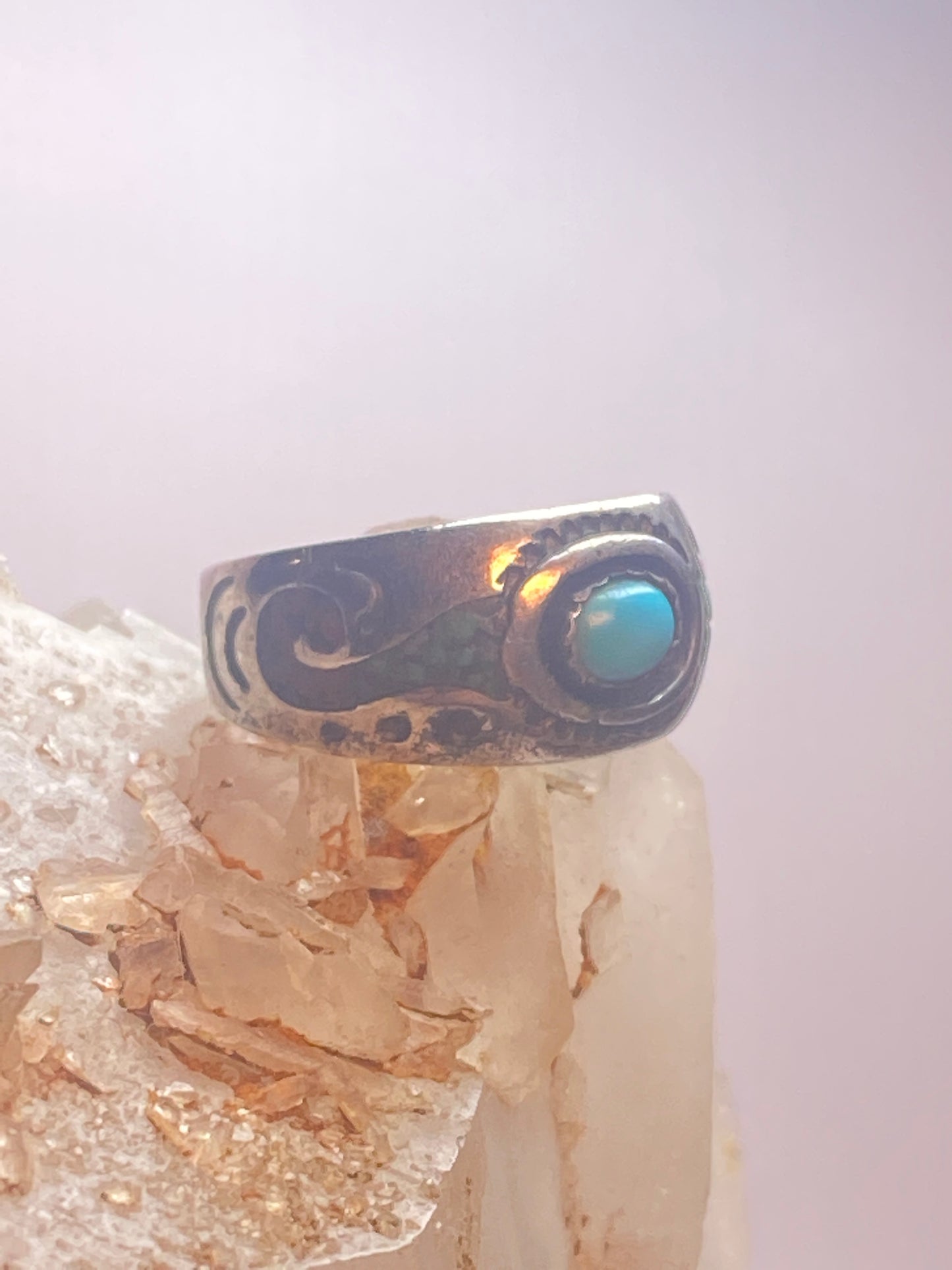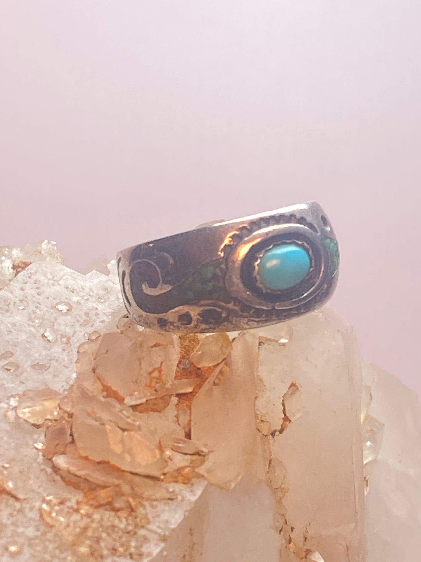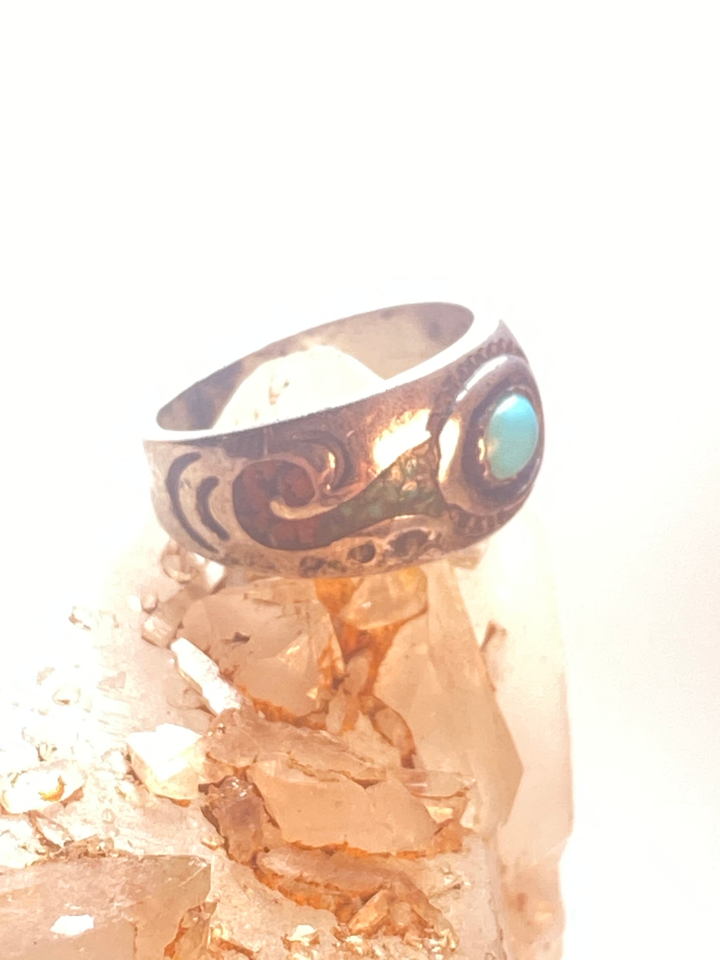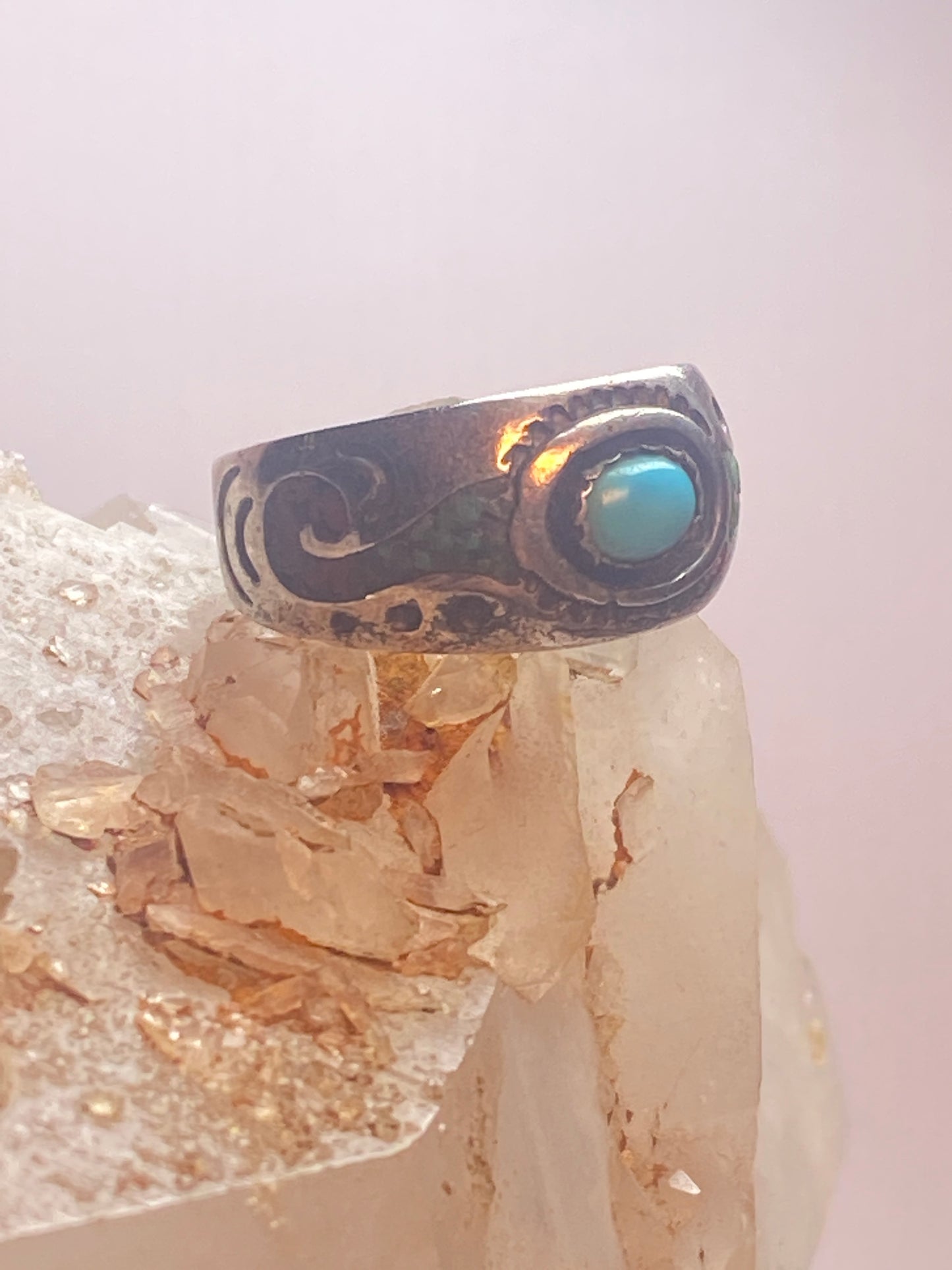 Turquoise ring size 5.50 Navajo band southwest swirls pinky coral chips sterling silver women