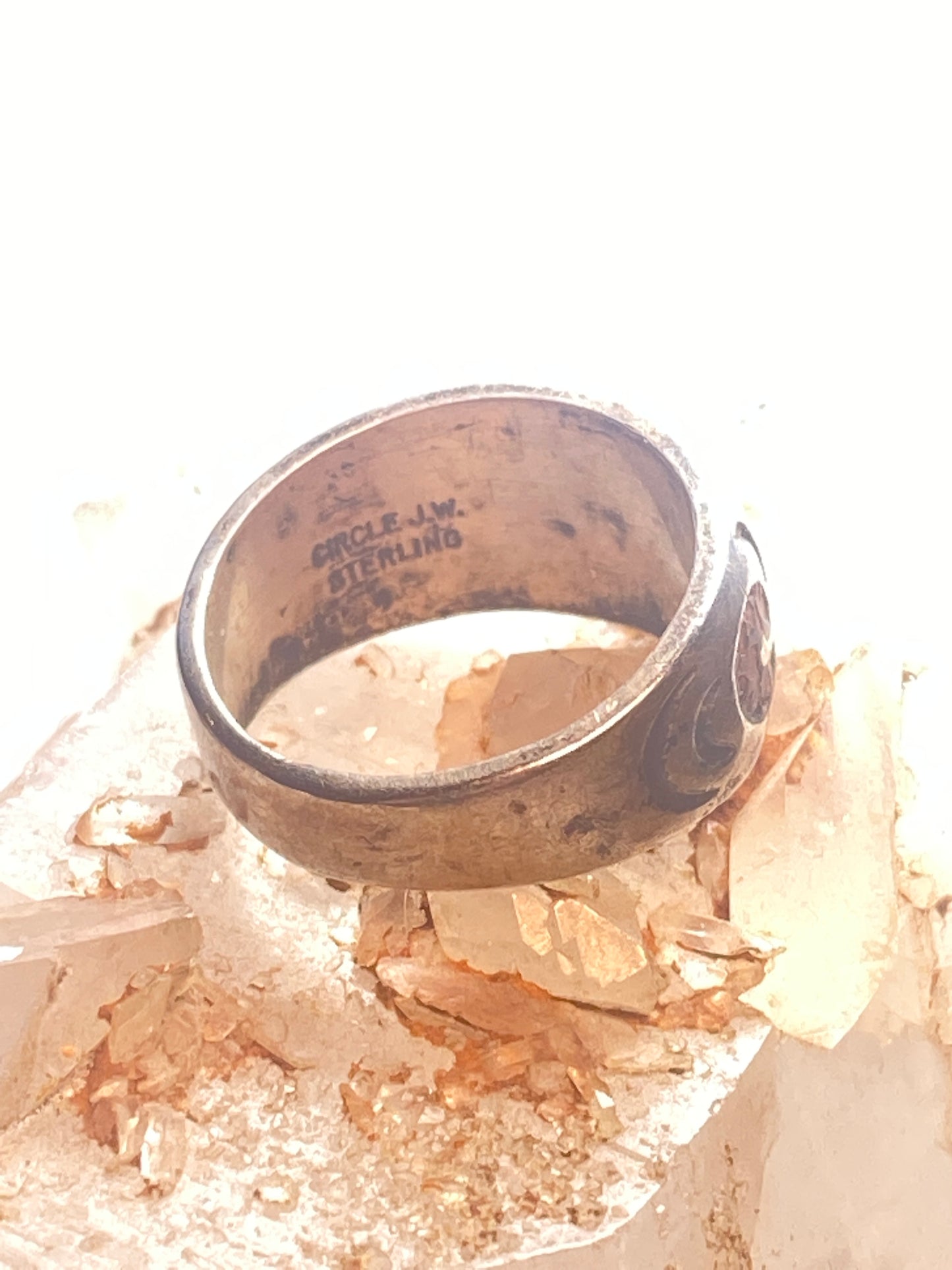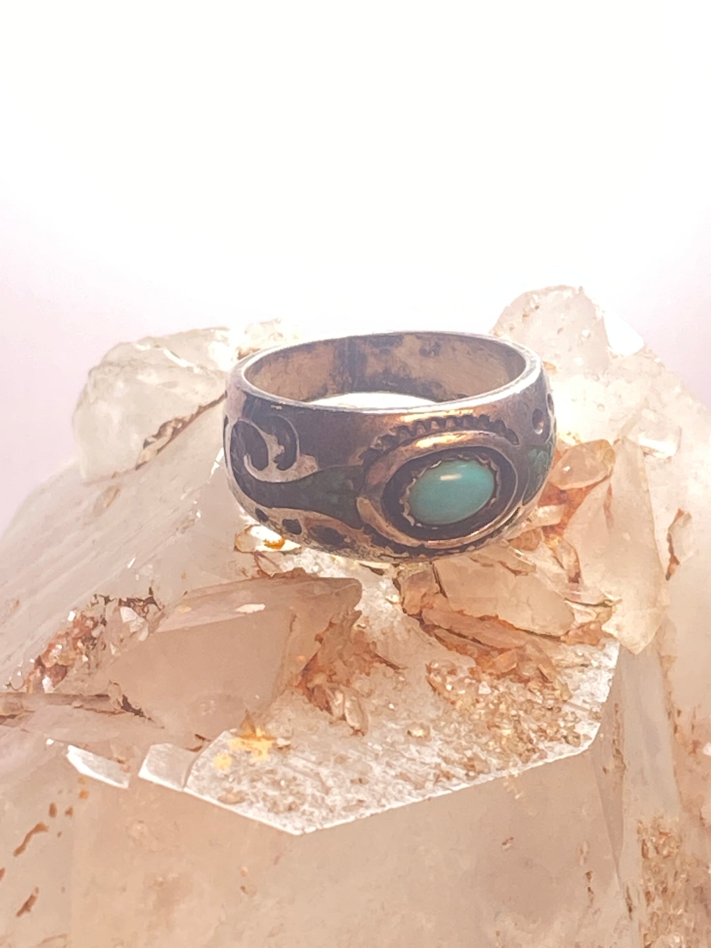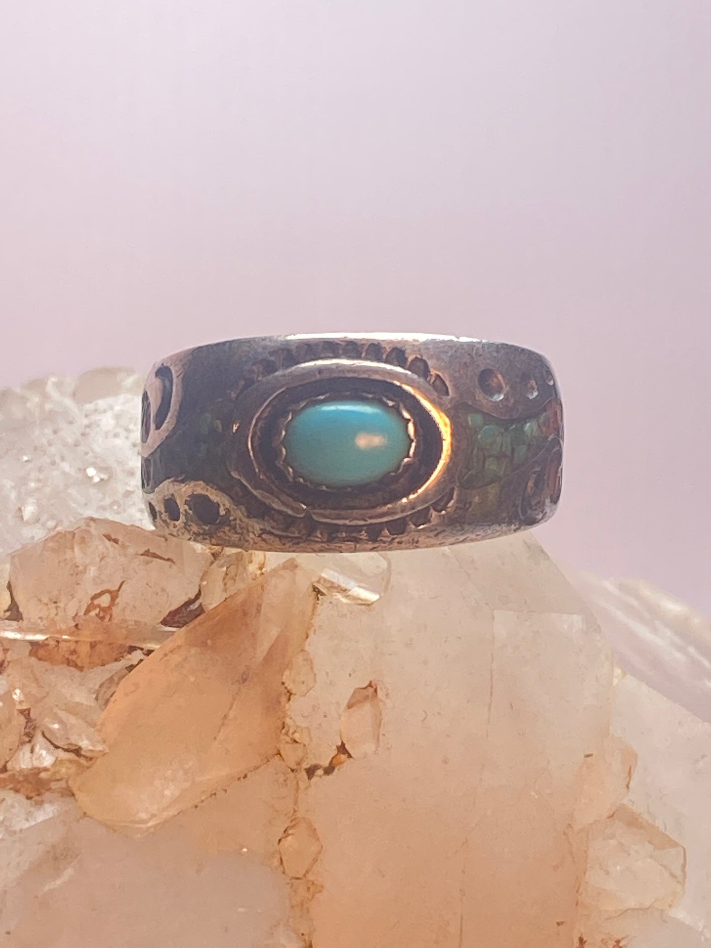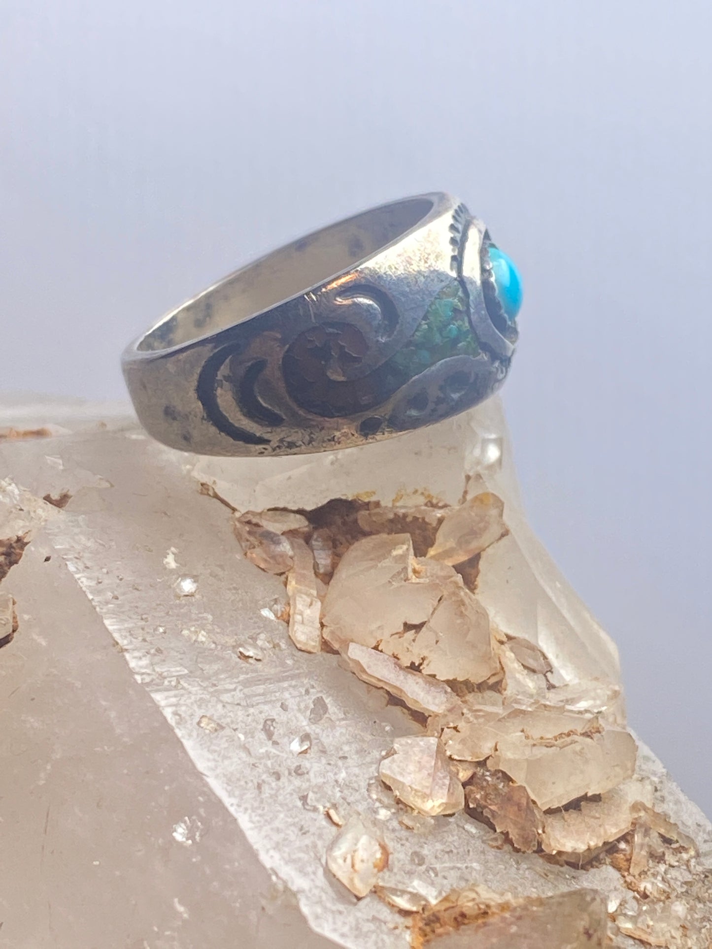 Turquoise ring size 5.50 Navajo band southwest swirls pinky coral chips sterling silver women