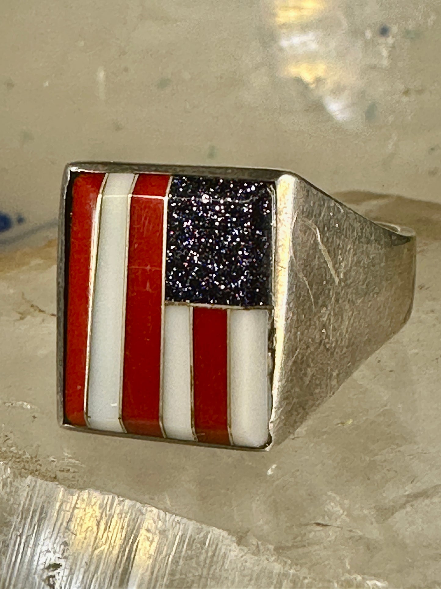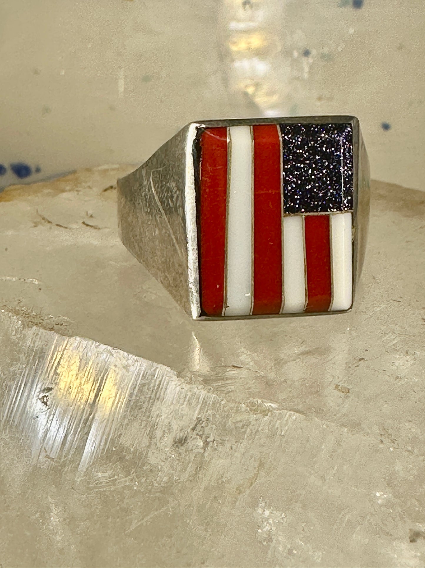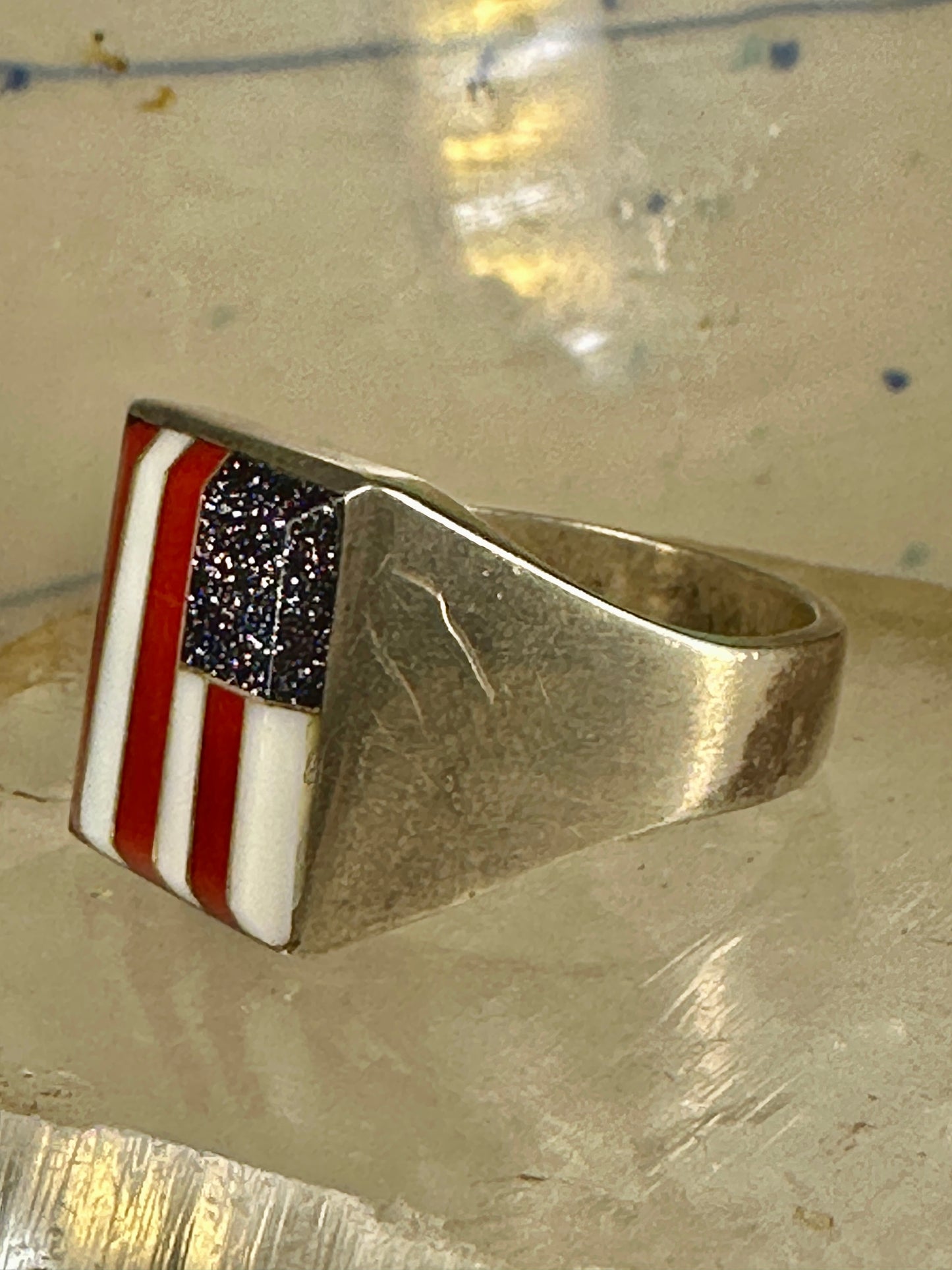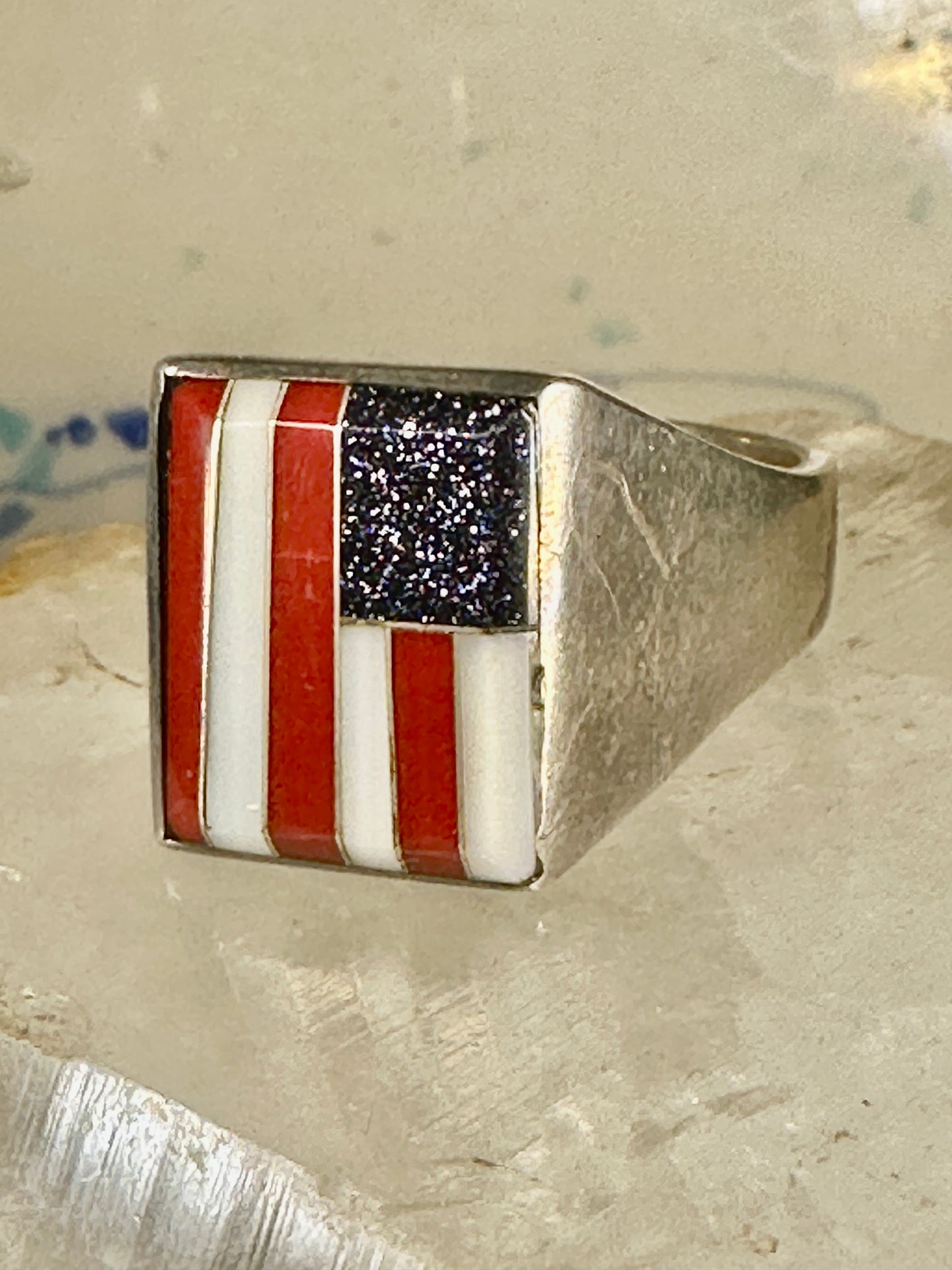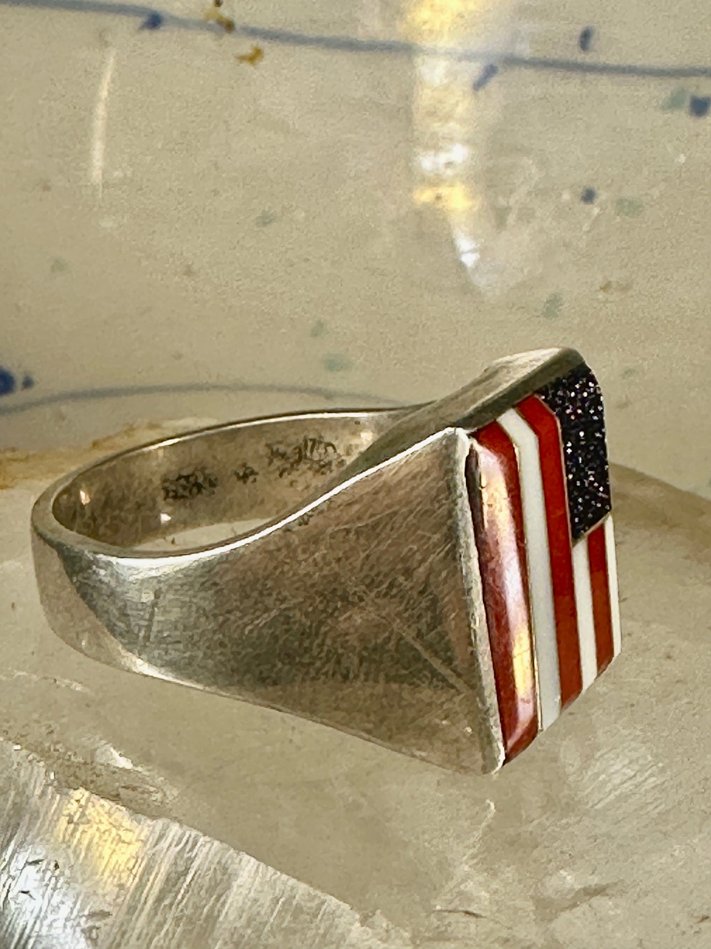 USA Flag ring size 14.25 coral MOP goldstone patriotic sterling silver men women
