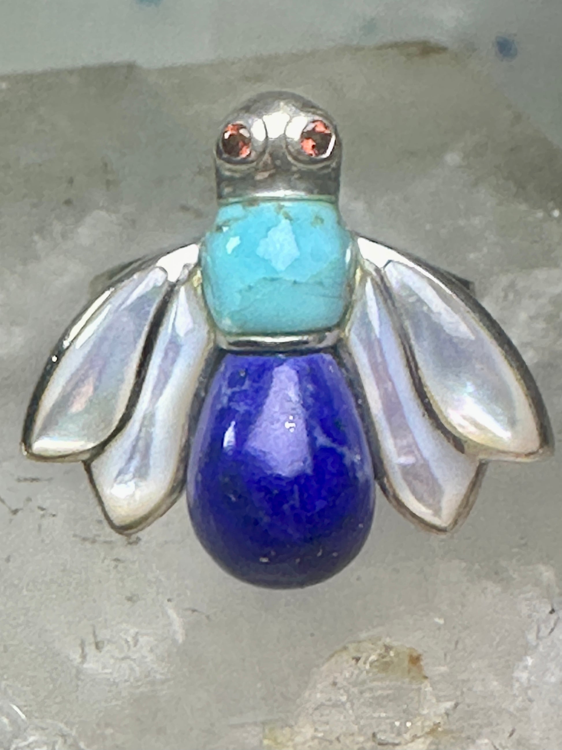 Vintage Bug ring insect blue lapis turquoise mop size 8 sterling silver women
