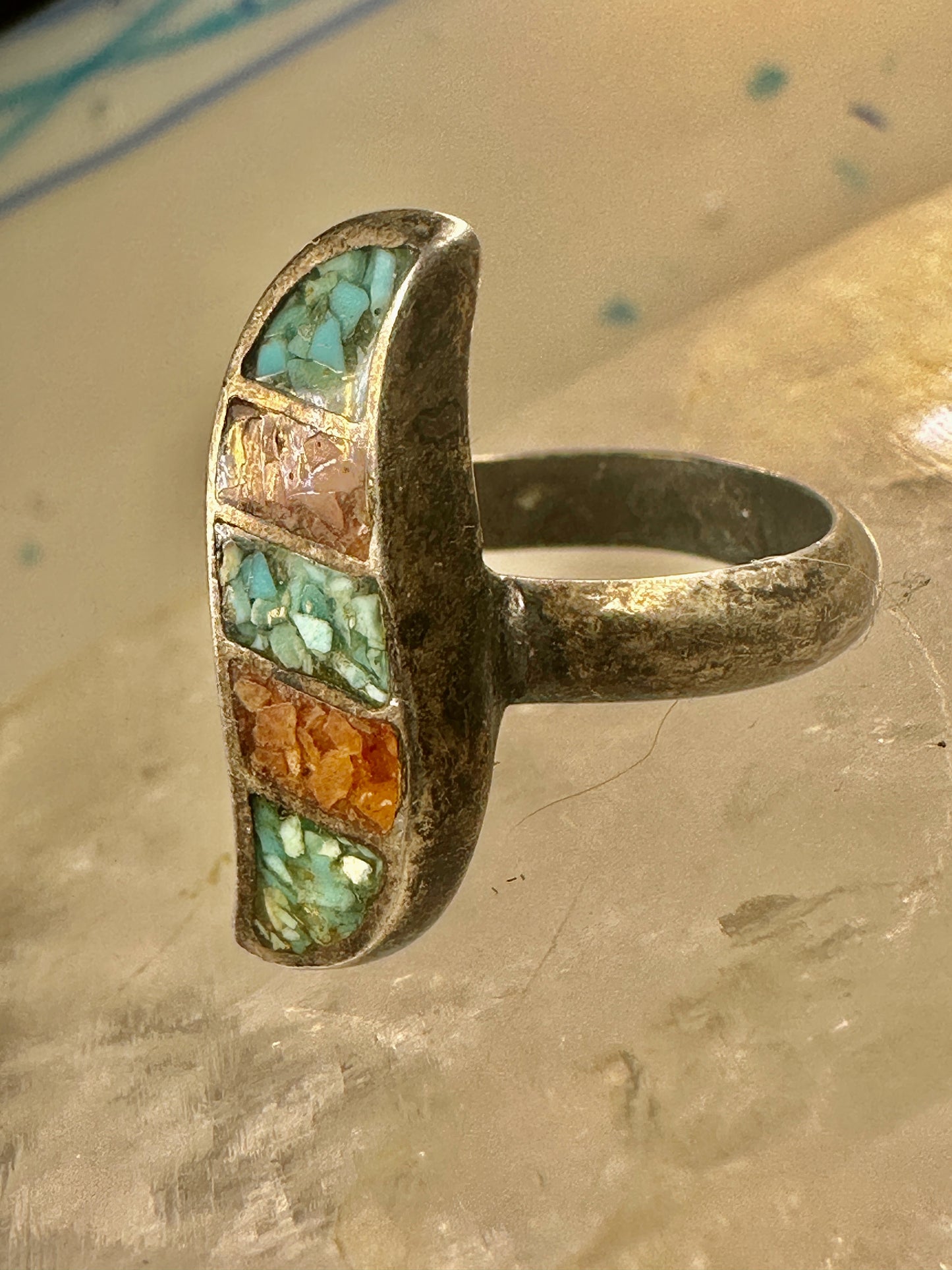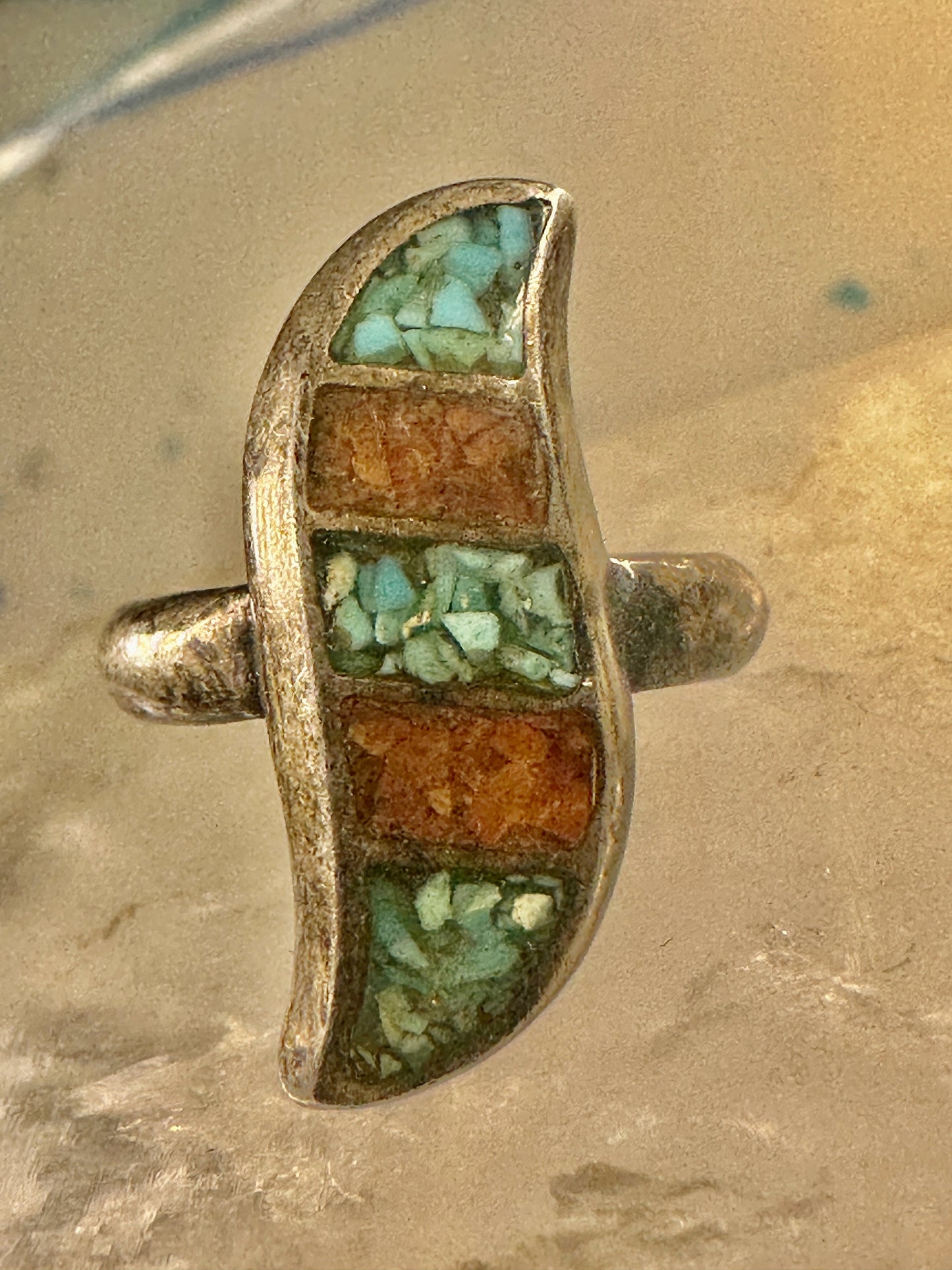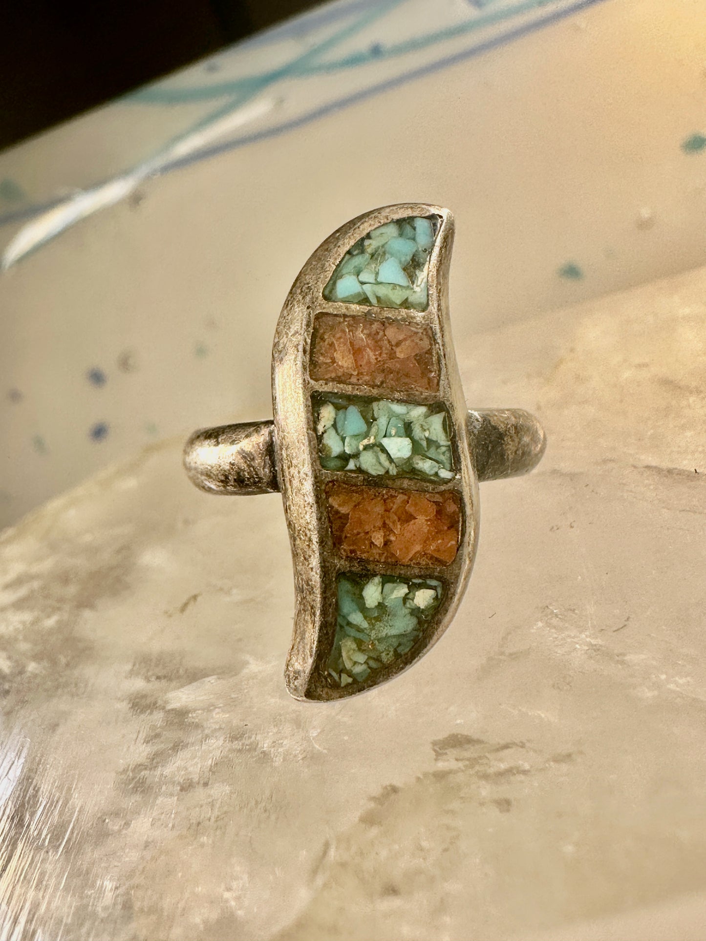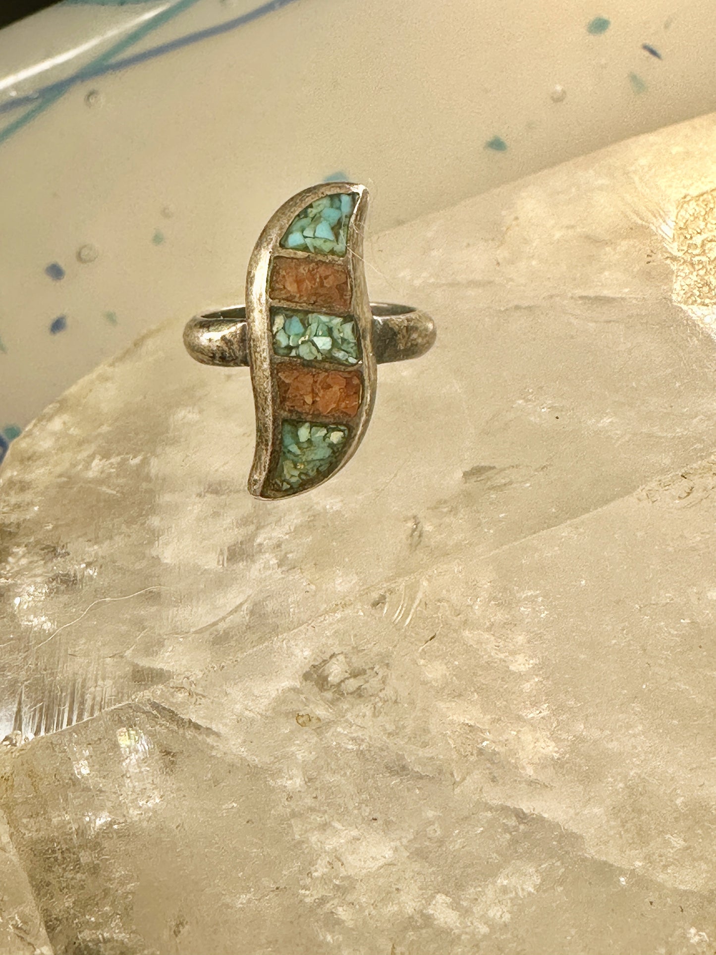 Zuni ring turquoise coral chips band size 5.50 sterling silver women