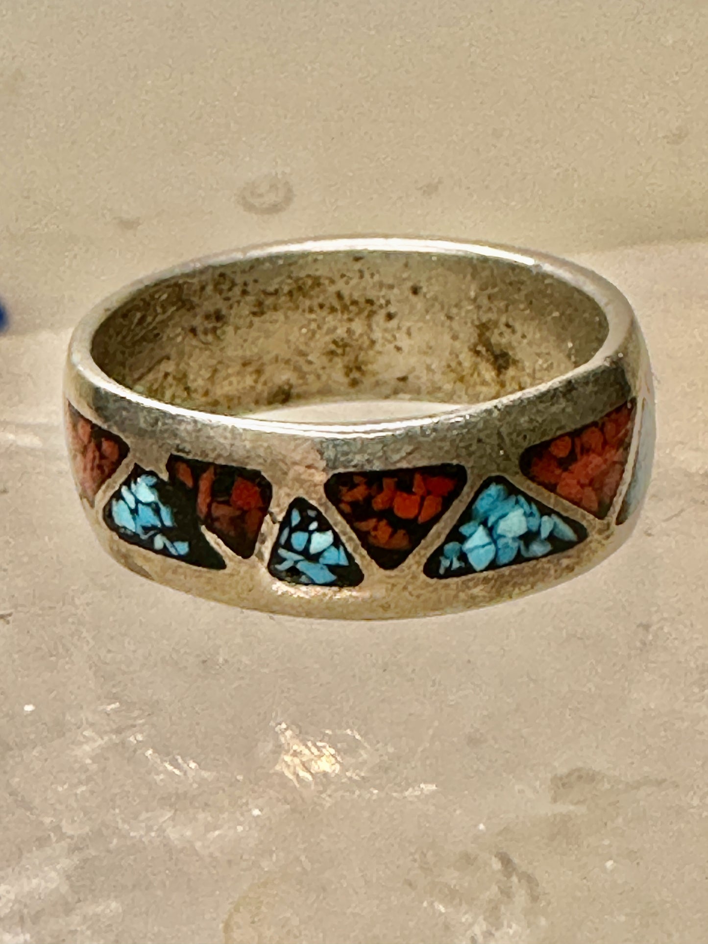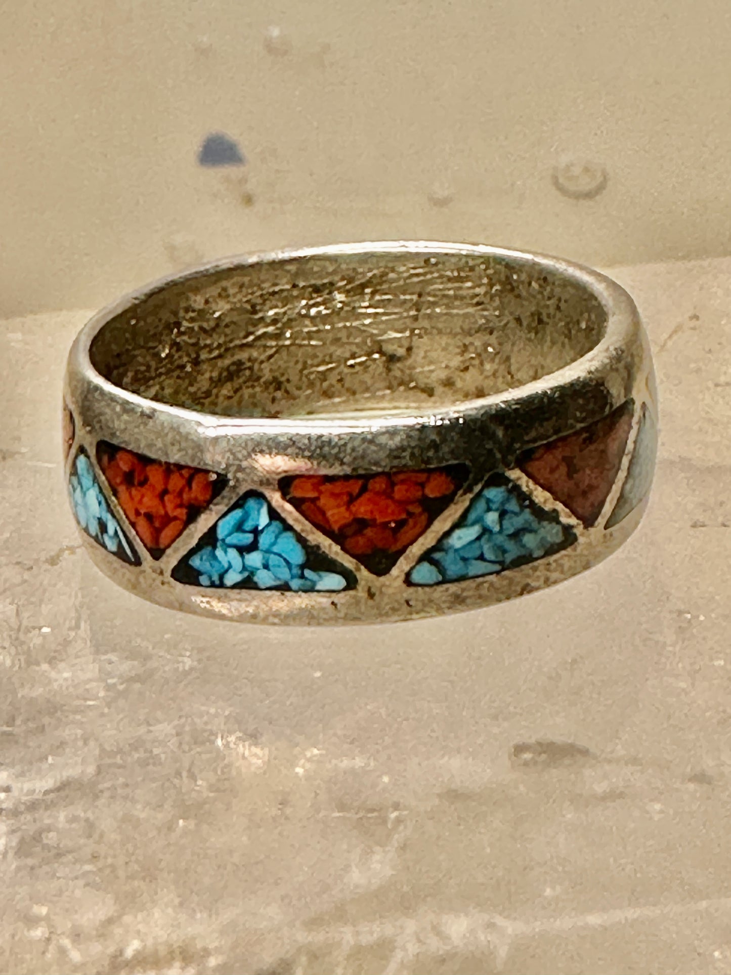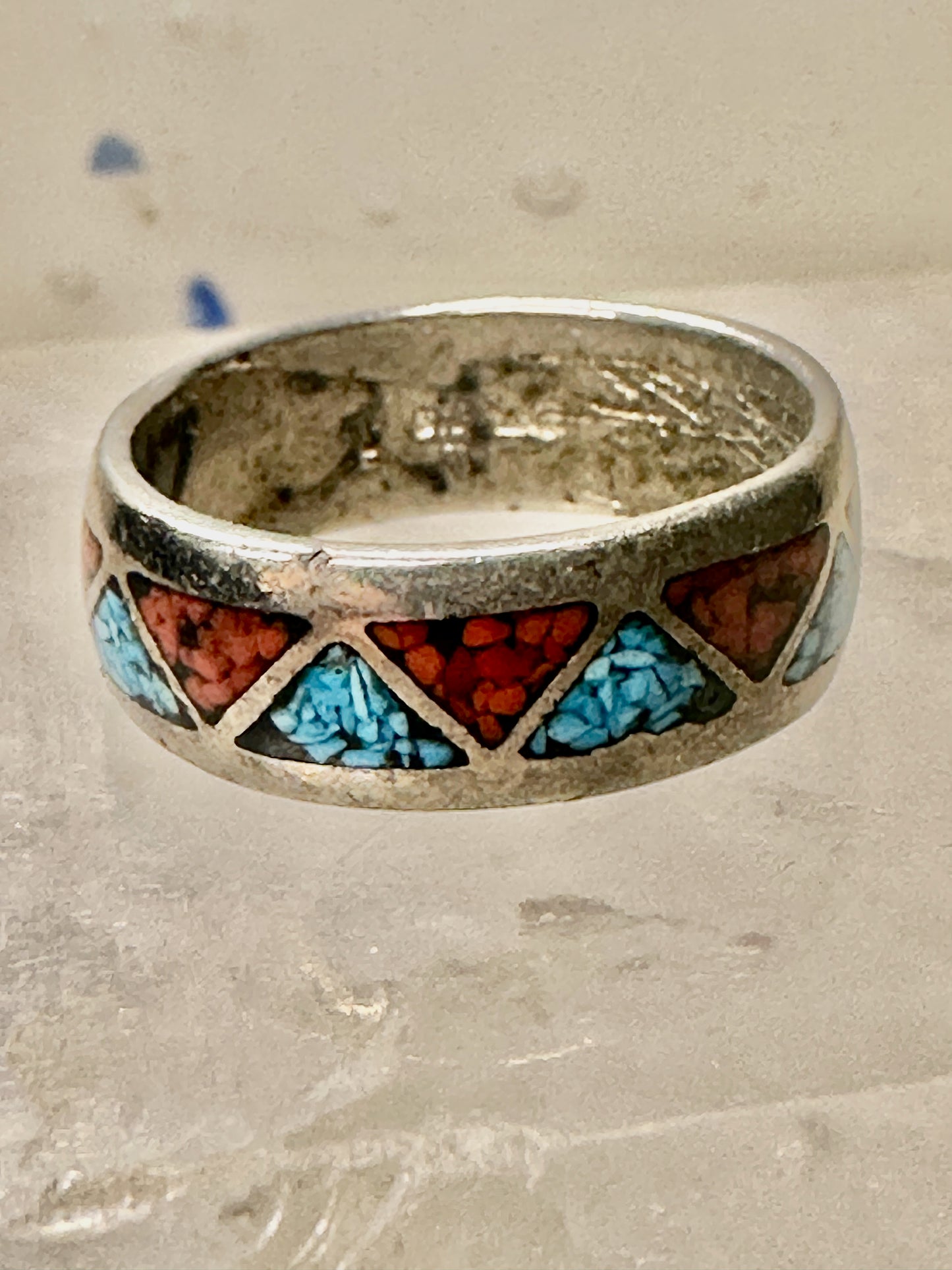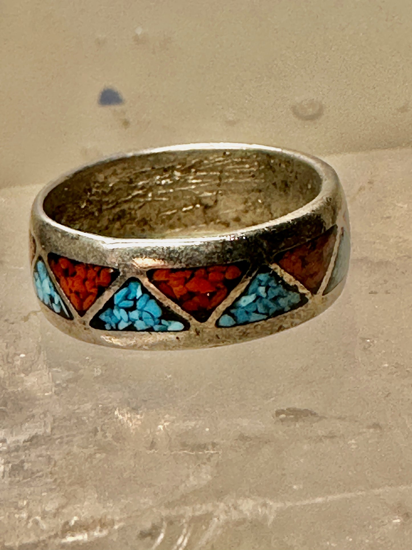 Zuni ring turquoise coral chips wedding band size 6.75 sterling silver women men
