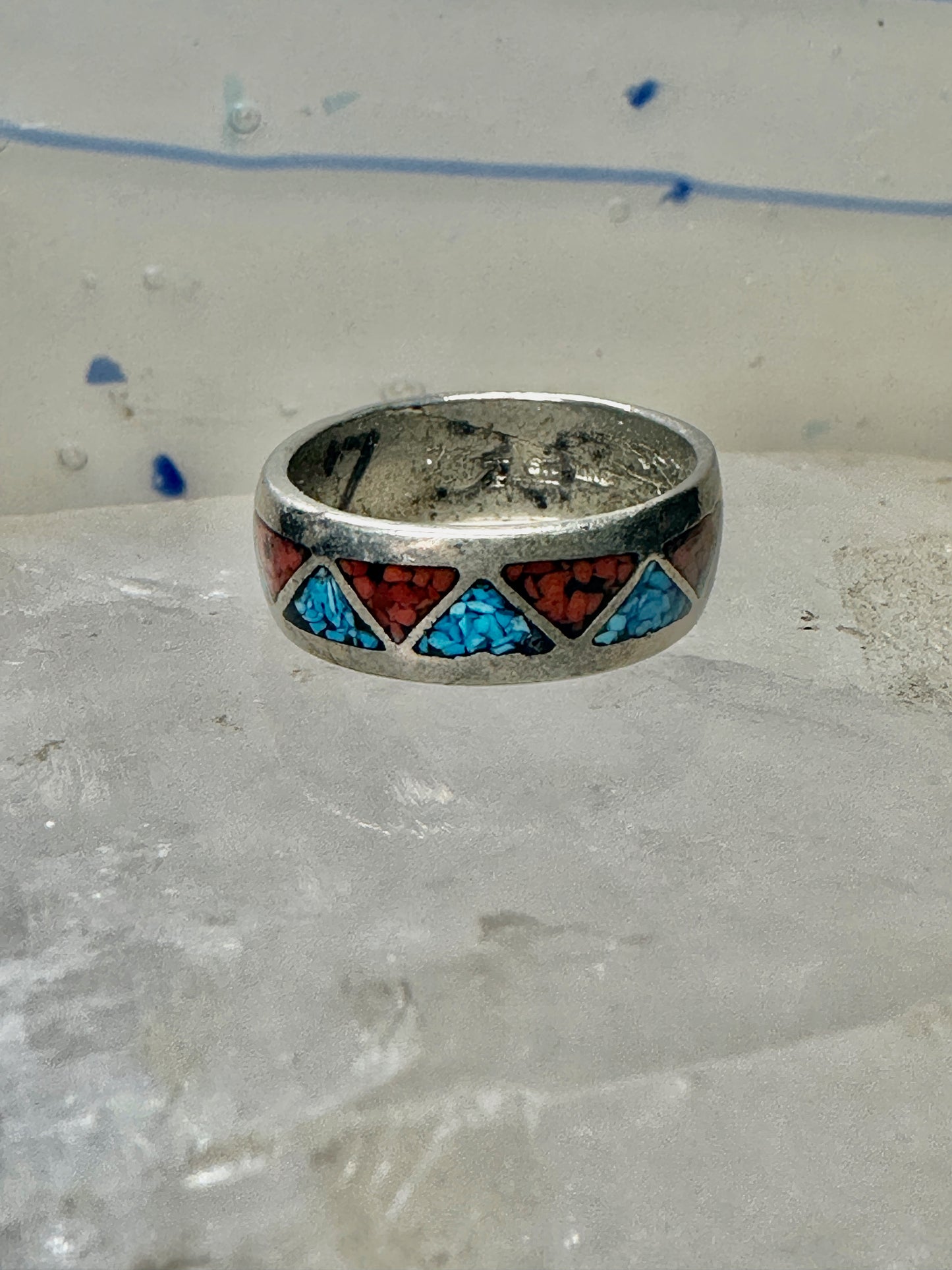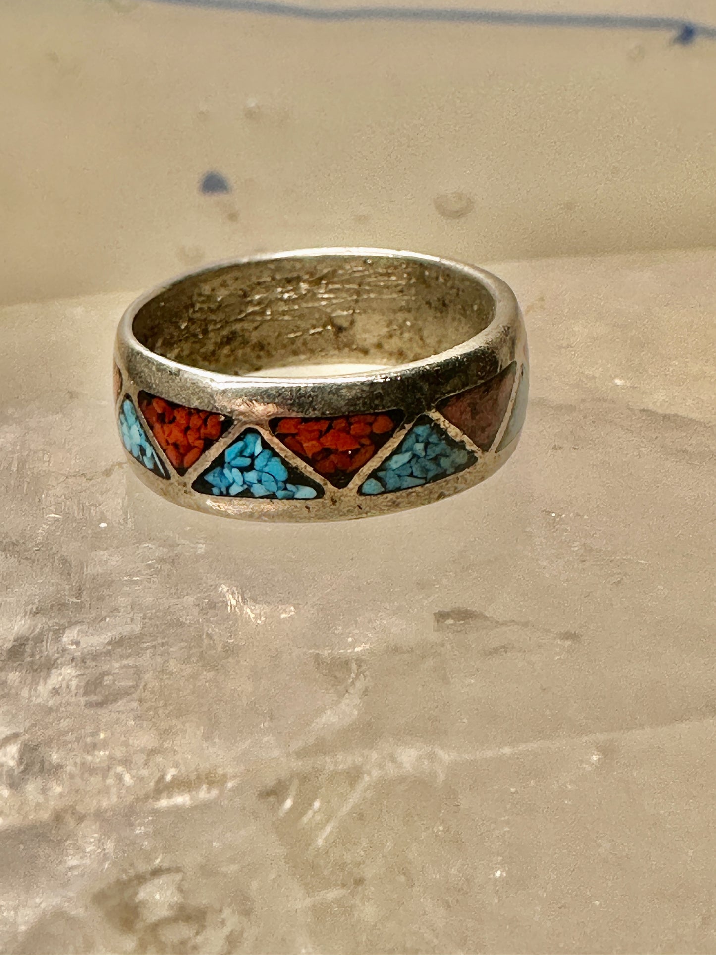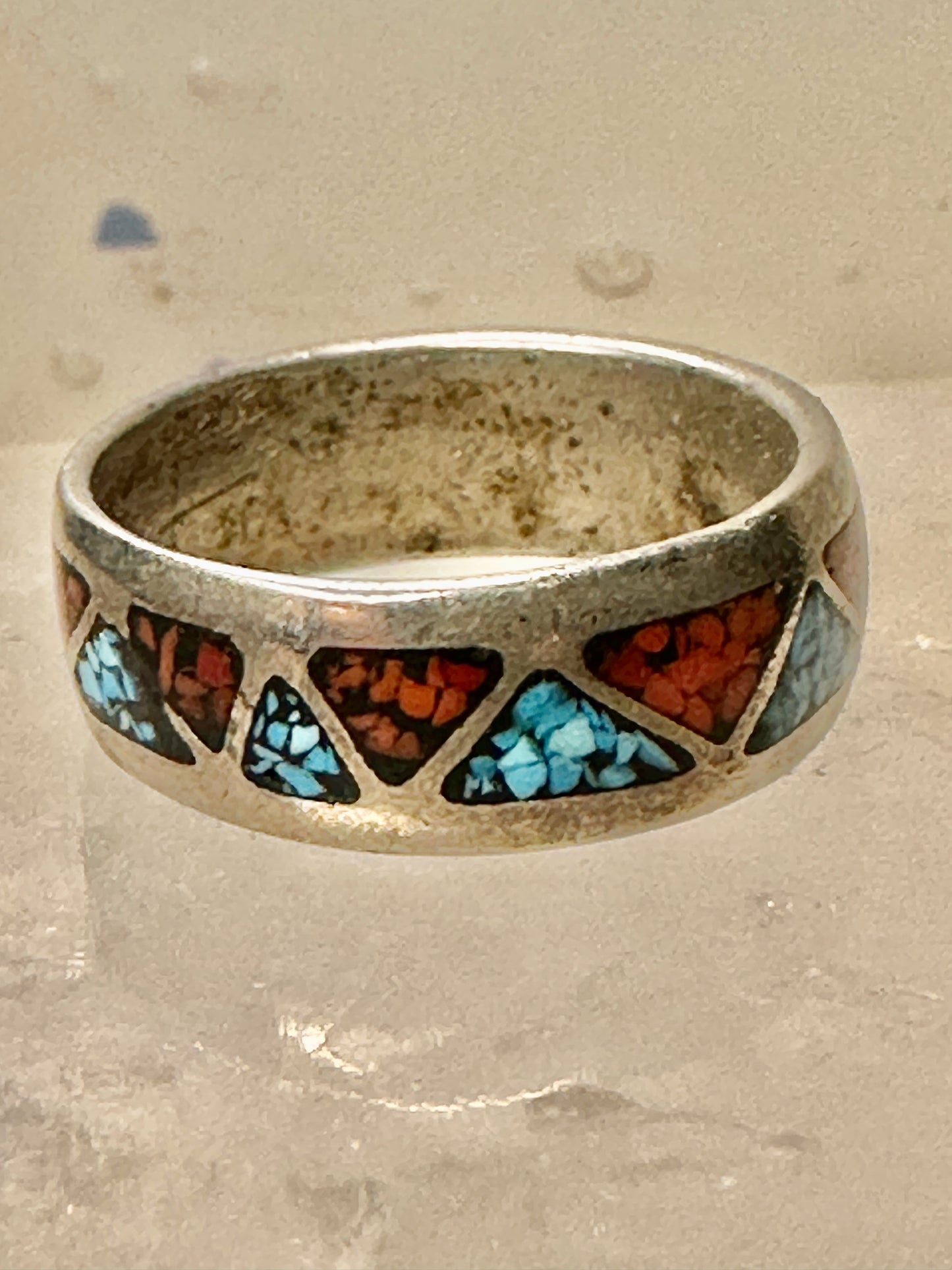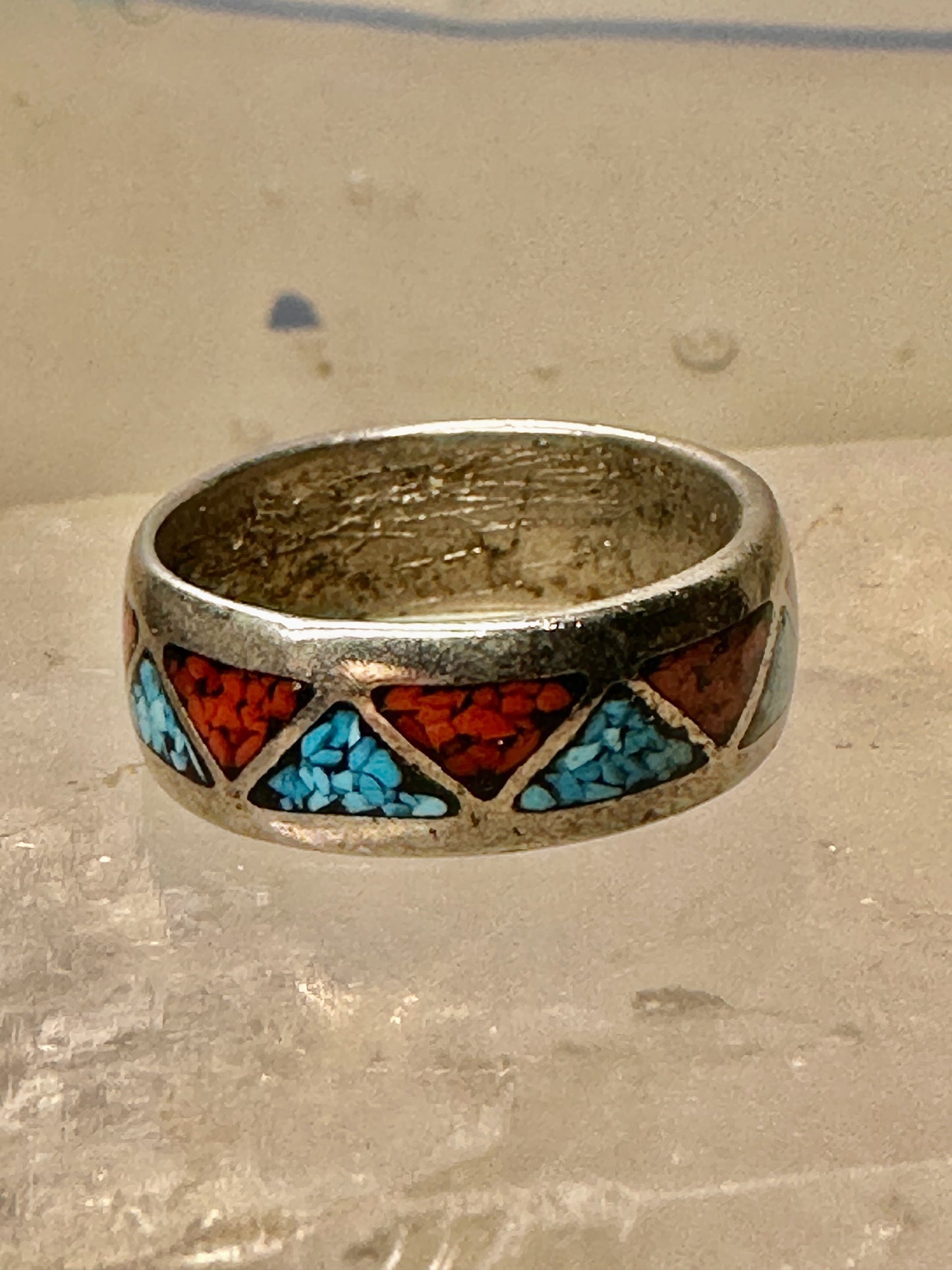 Zuni ring turquoise coral chips wedding band size 6.75 sterling silver women men