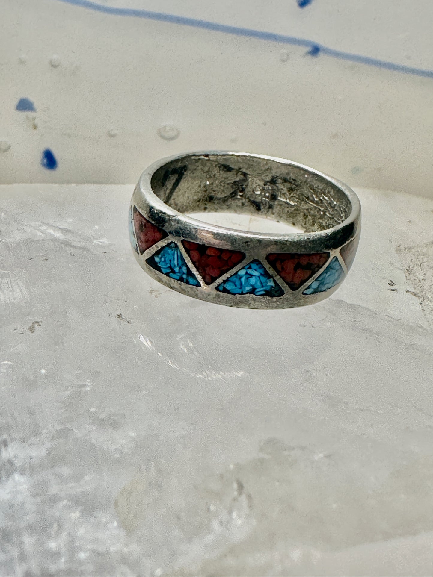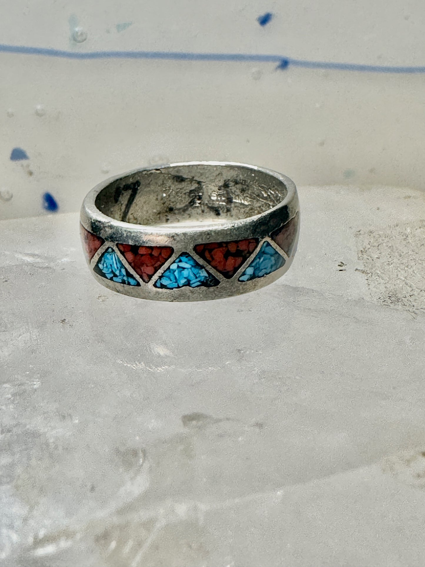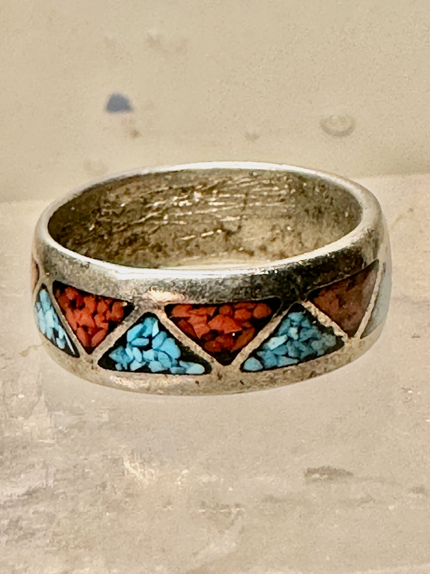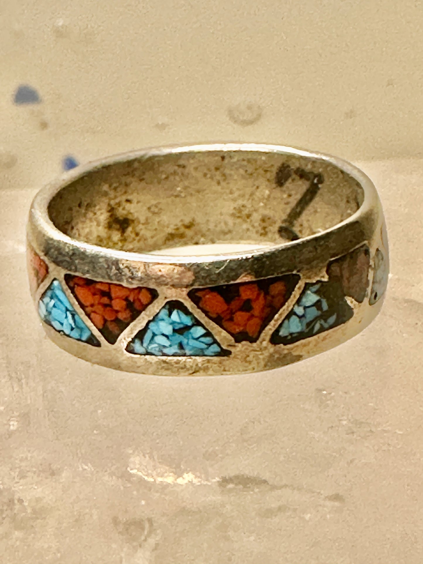 Zuni ring turquoise coral chips wedding band size 6.75 sterling silver women men