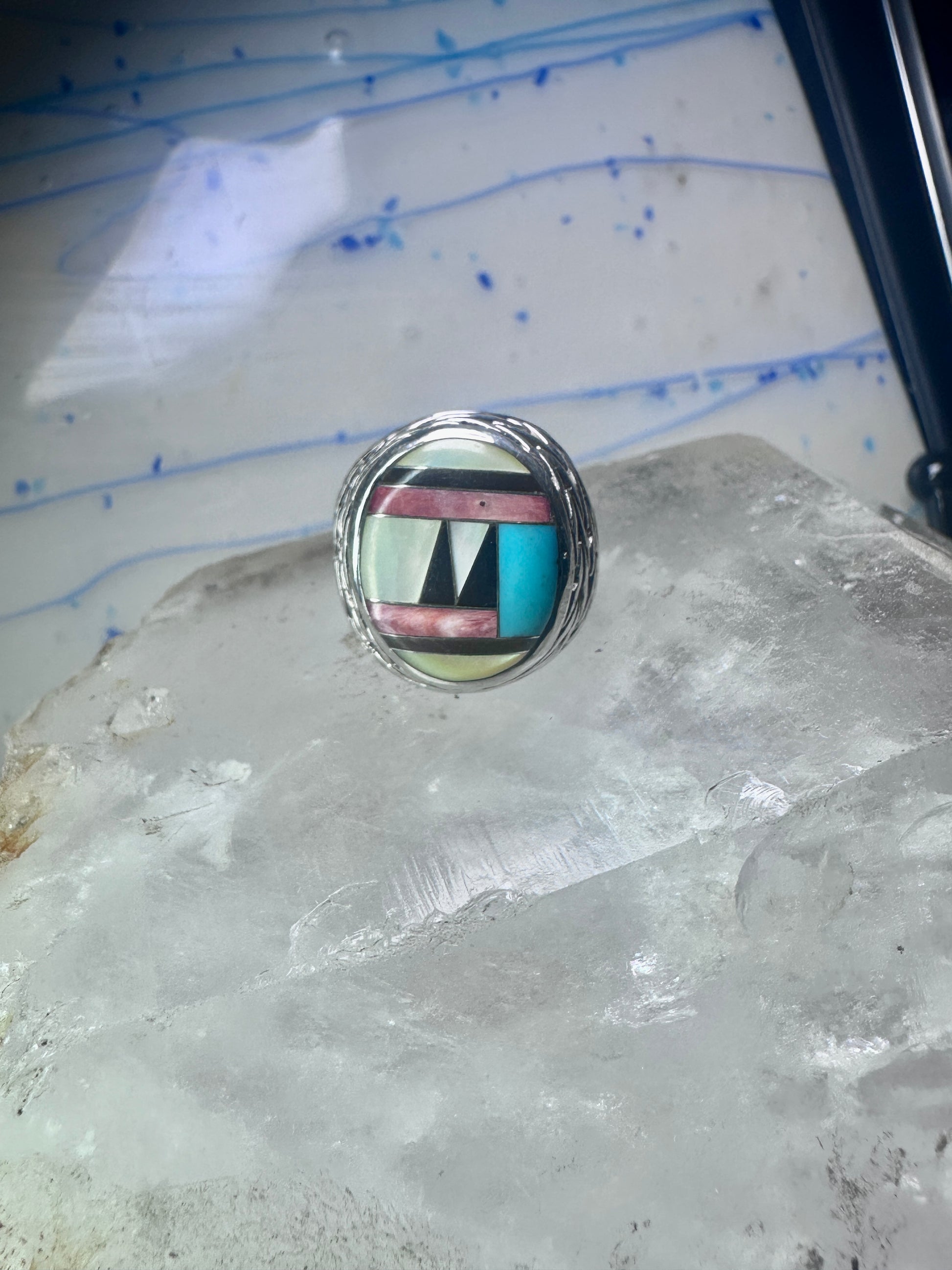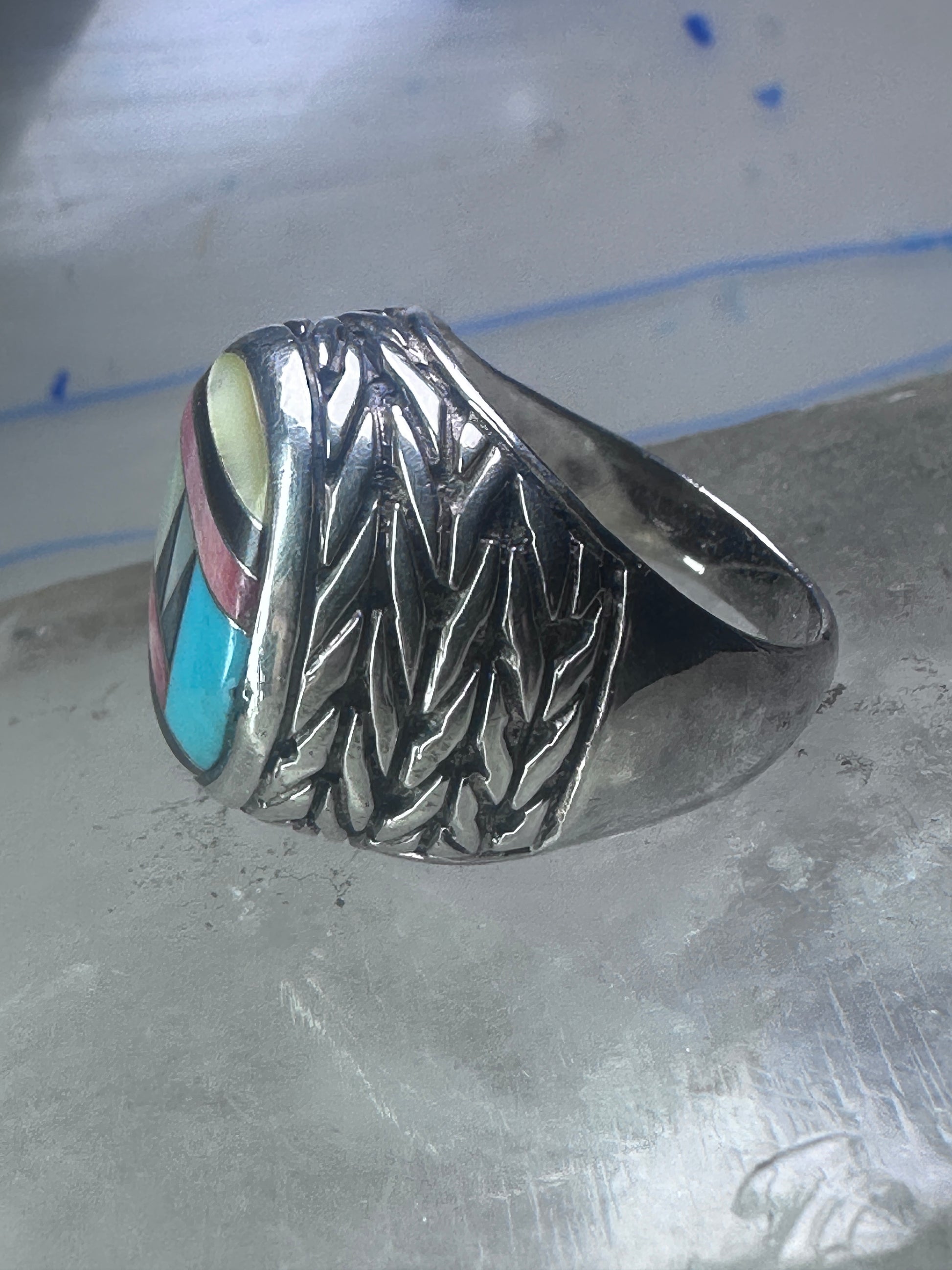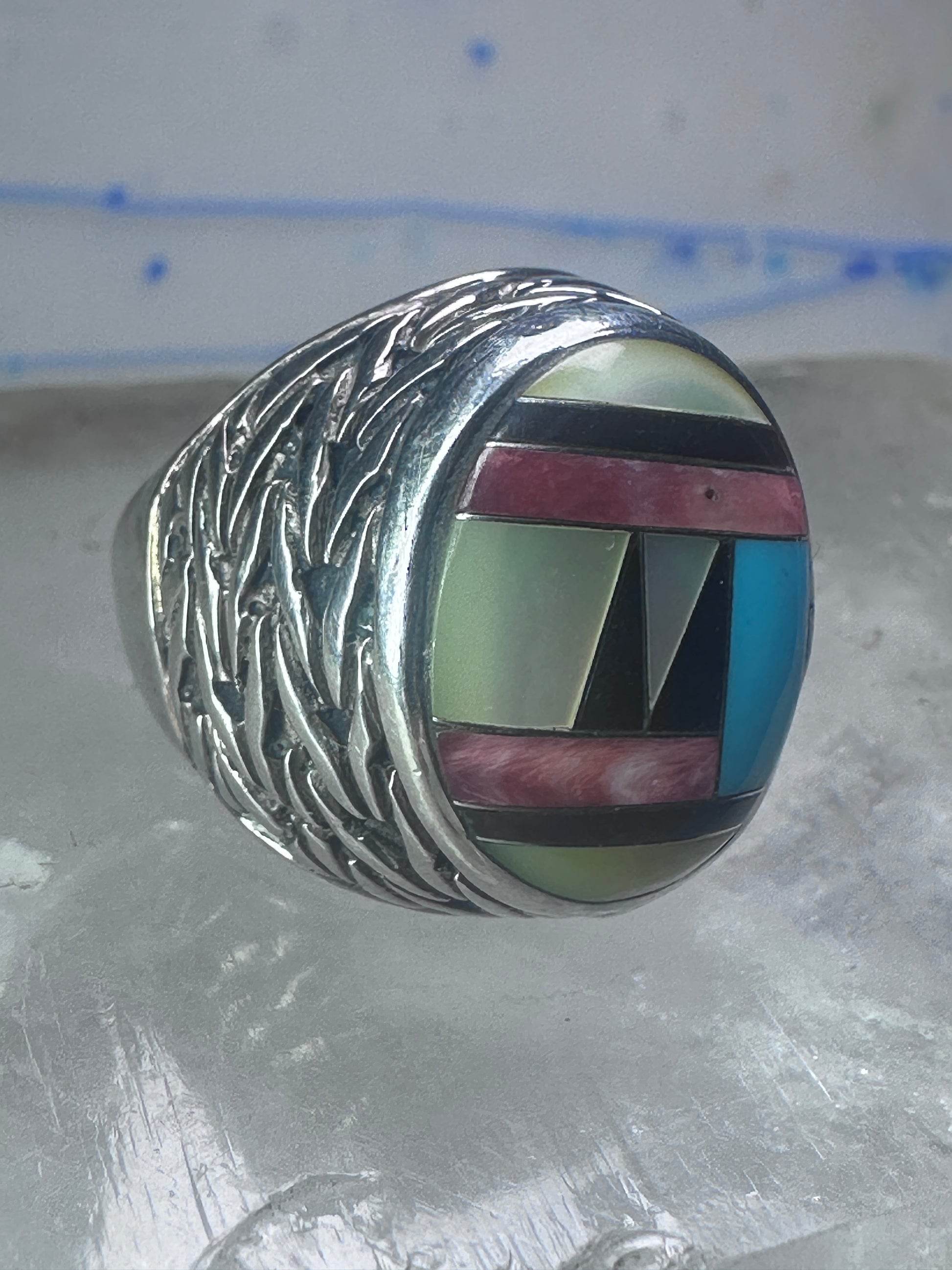 Zuni Ring turquoise onyx MOP leaves band size 8.2 sterling silver women men signed DL